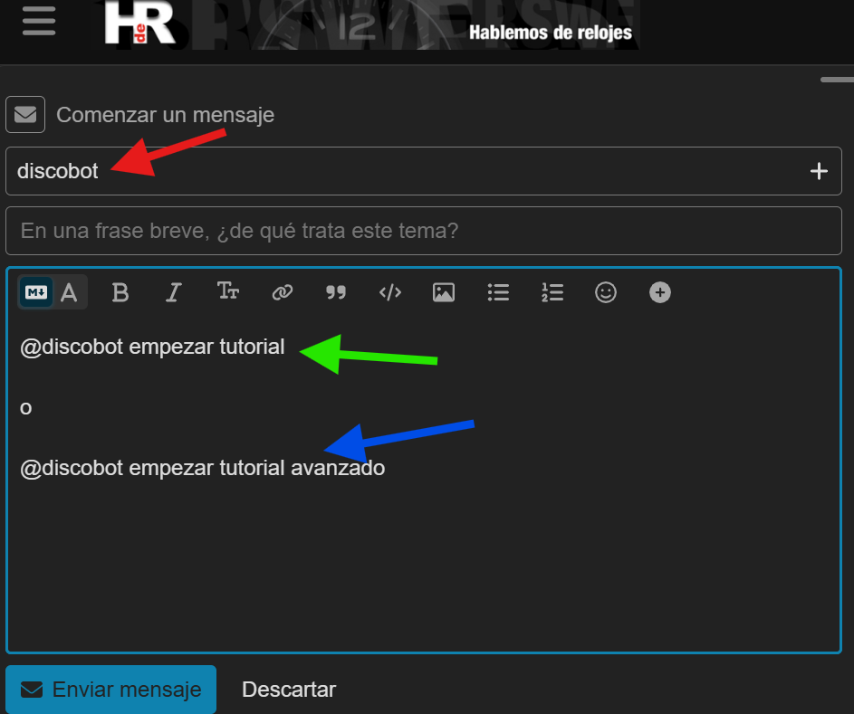 El foro tiene una función para hacer un tutorial interactivo con la ayuda del “usuario” @discobot al que le tenéis que escribir un privado e indicarle que tutorial queréis realizar. Al completar cada uno de los tutoriales recibiréis una “medalla” y un diploma acreditativo.