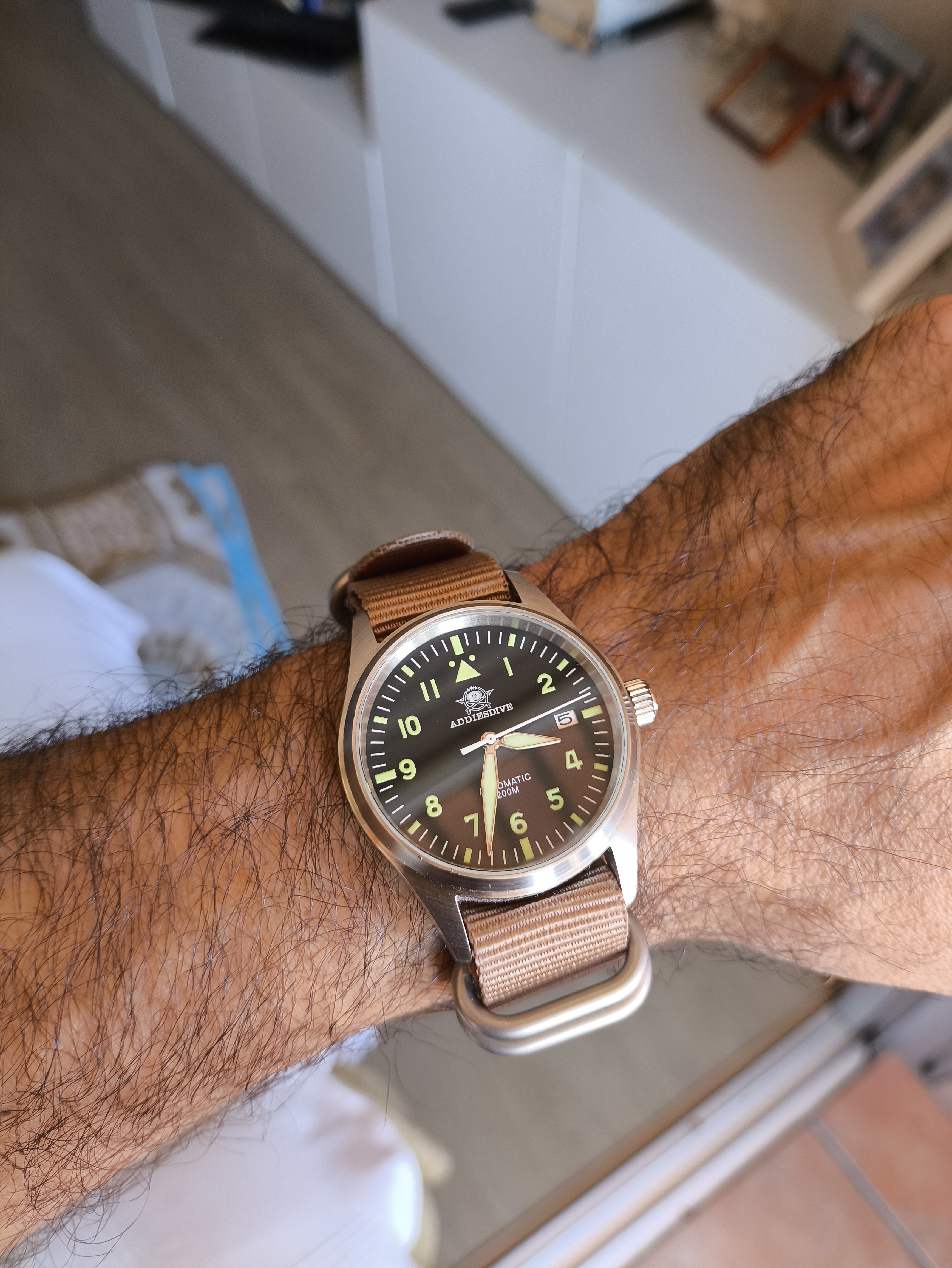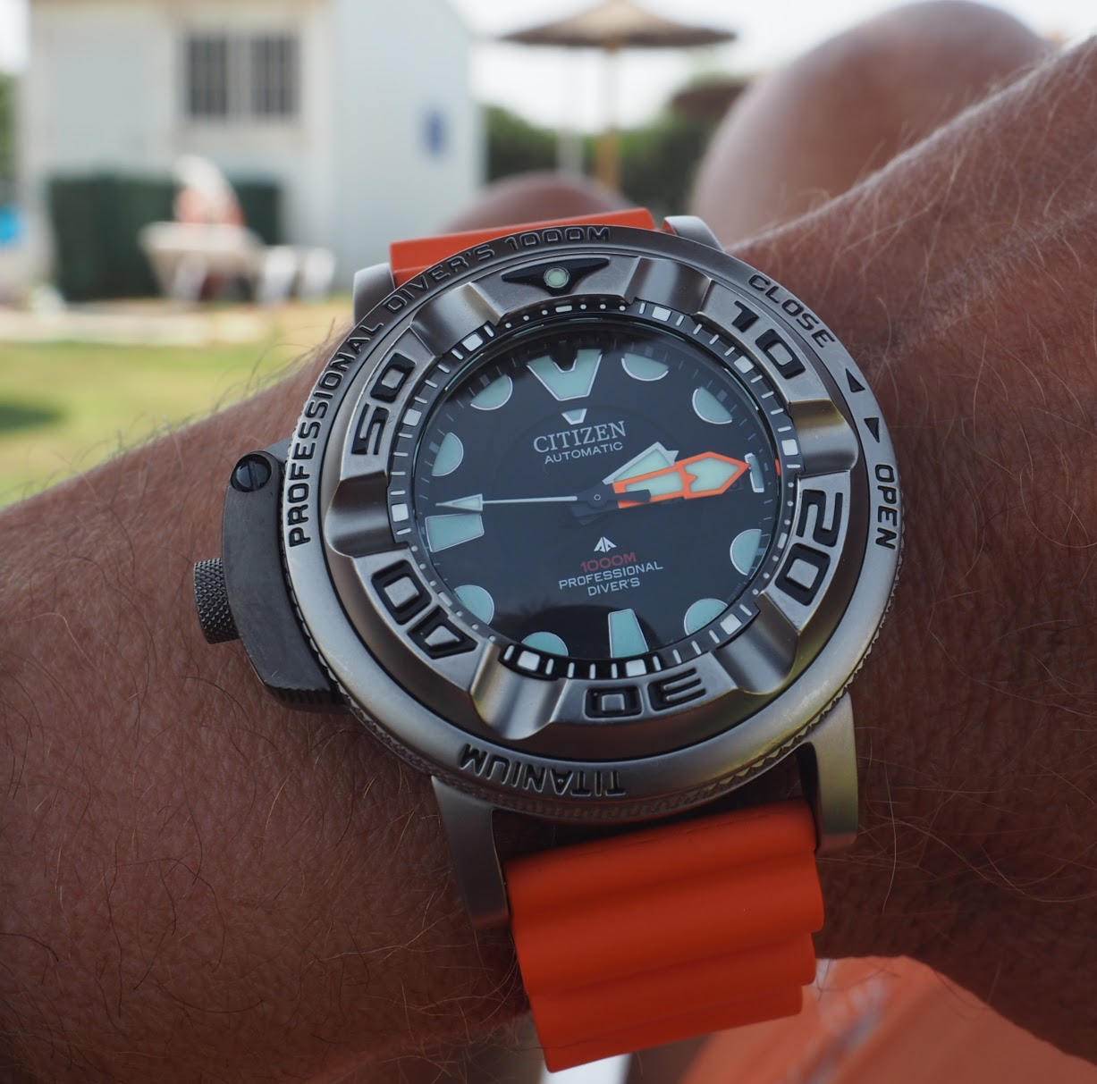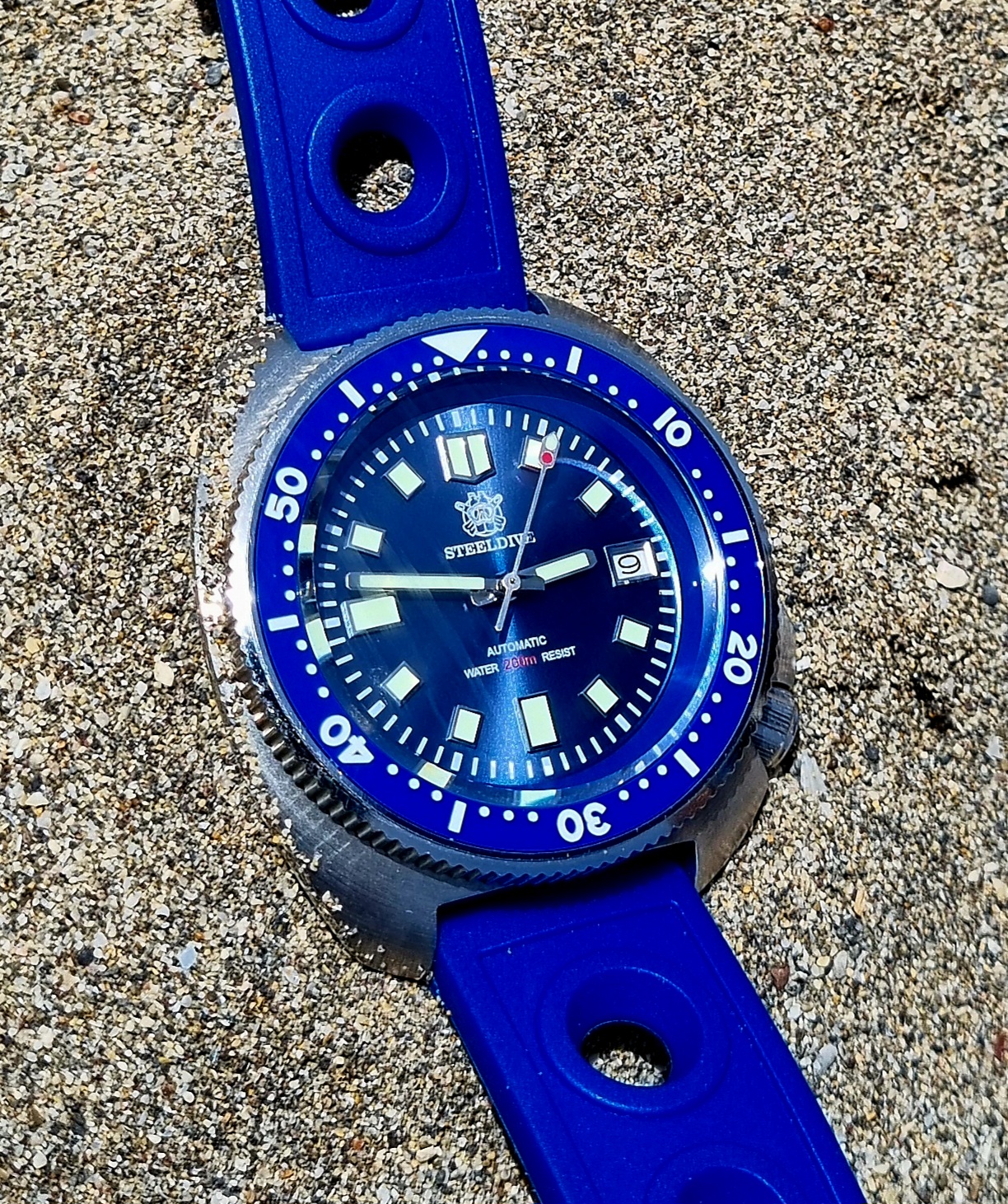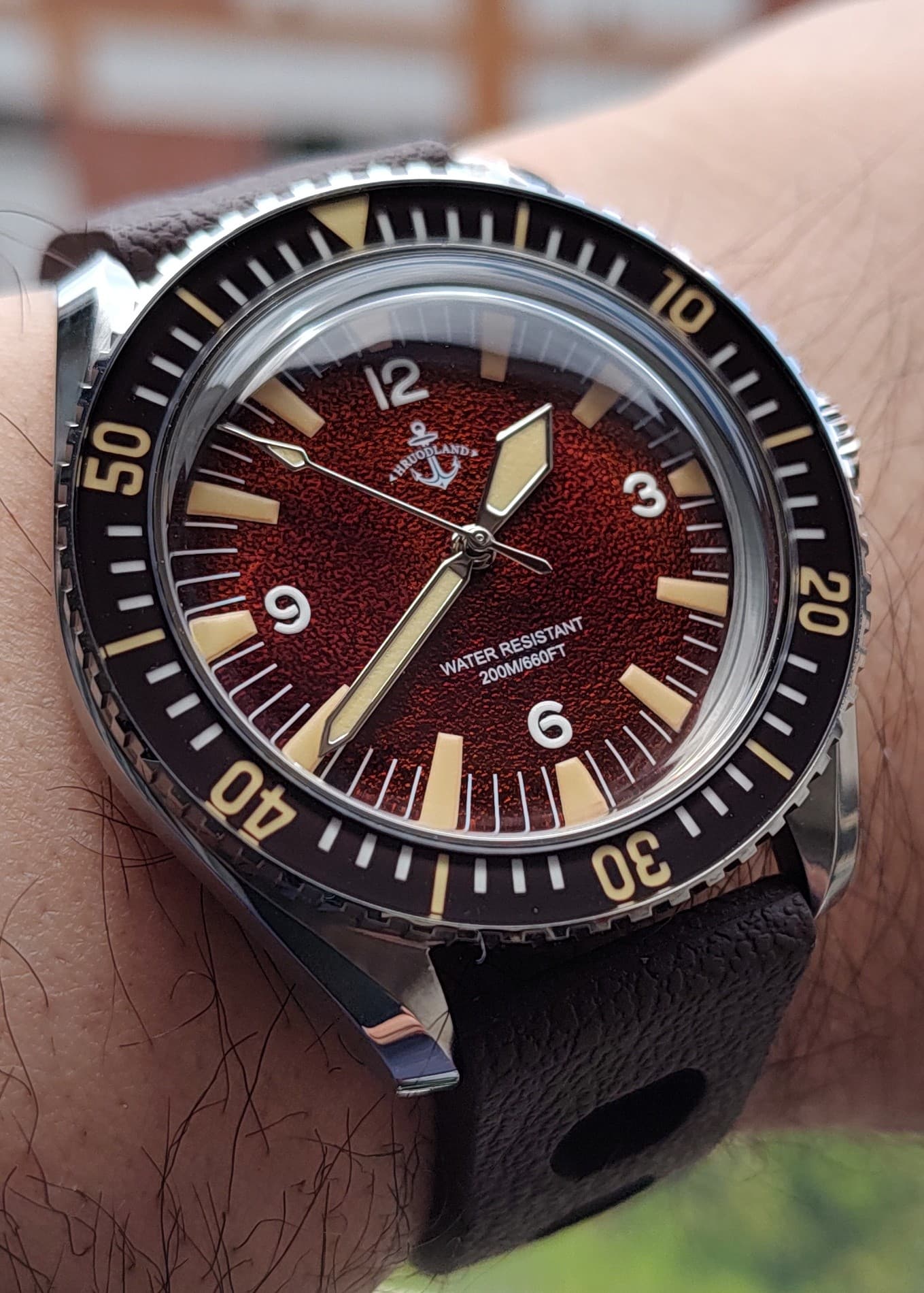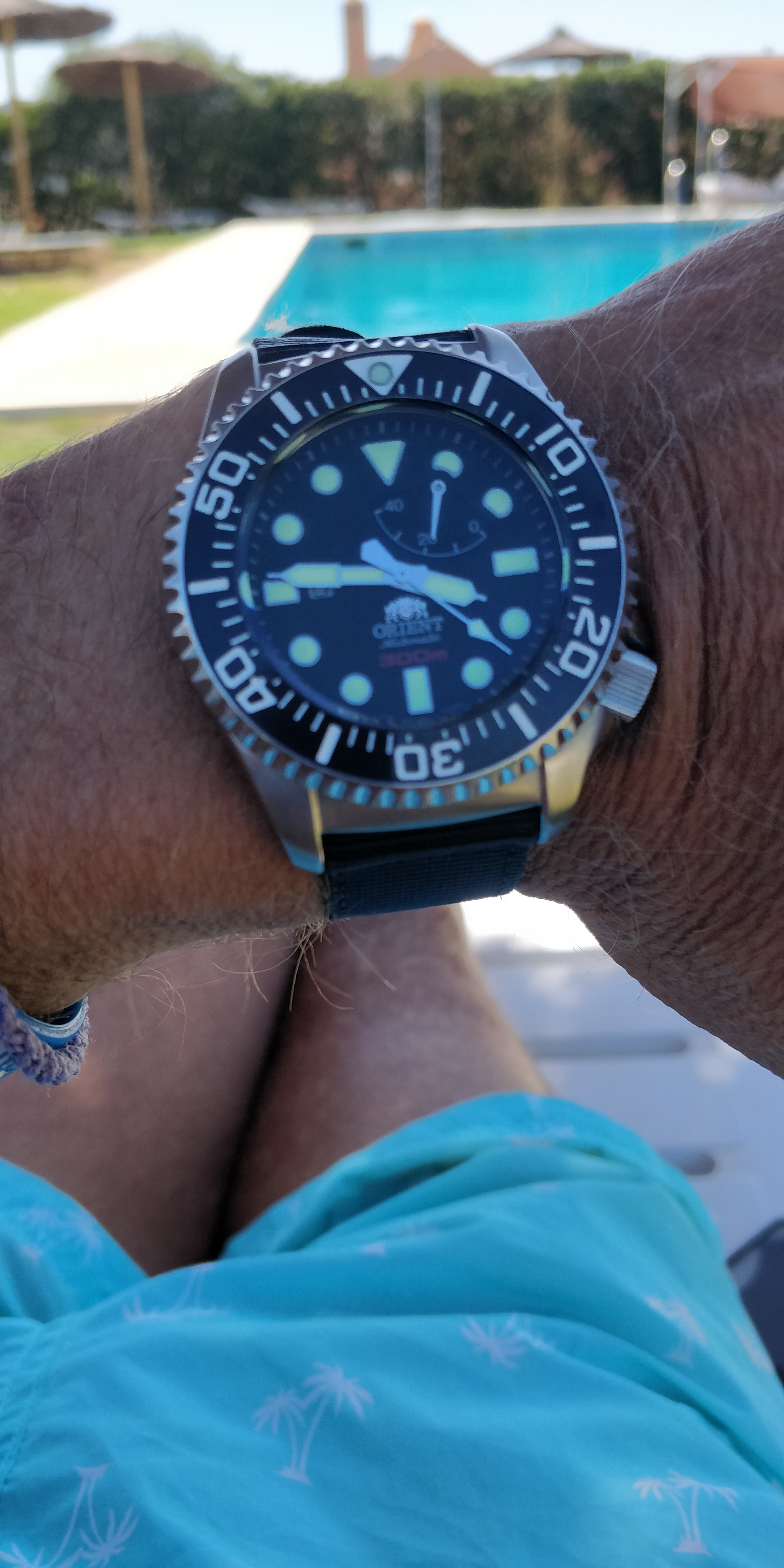 Esta muy bien, el dial “Cocacolesco” con los indices/agujas tostados (no amarillos ni naranjas) me gusta mucho, le he colocado la correa de fluororubber tropical que pedí para él y listo para que me acompañe estos calurosos días.