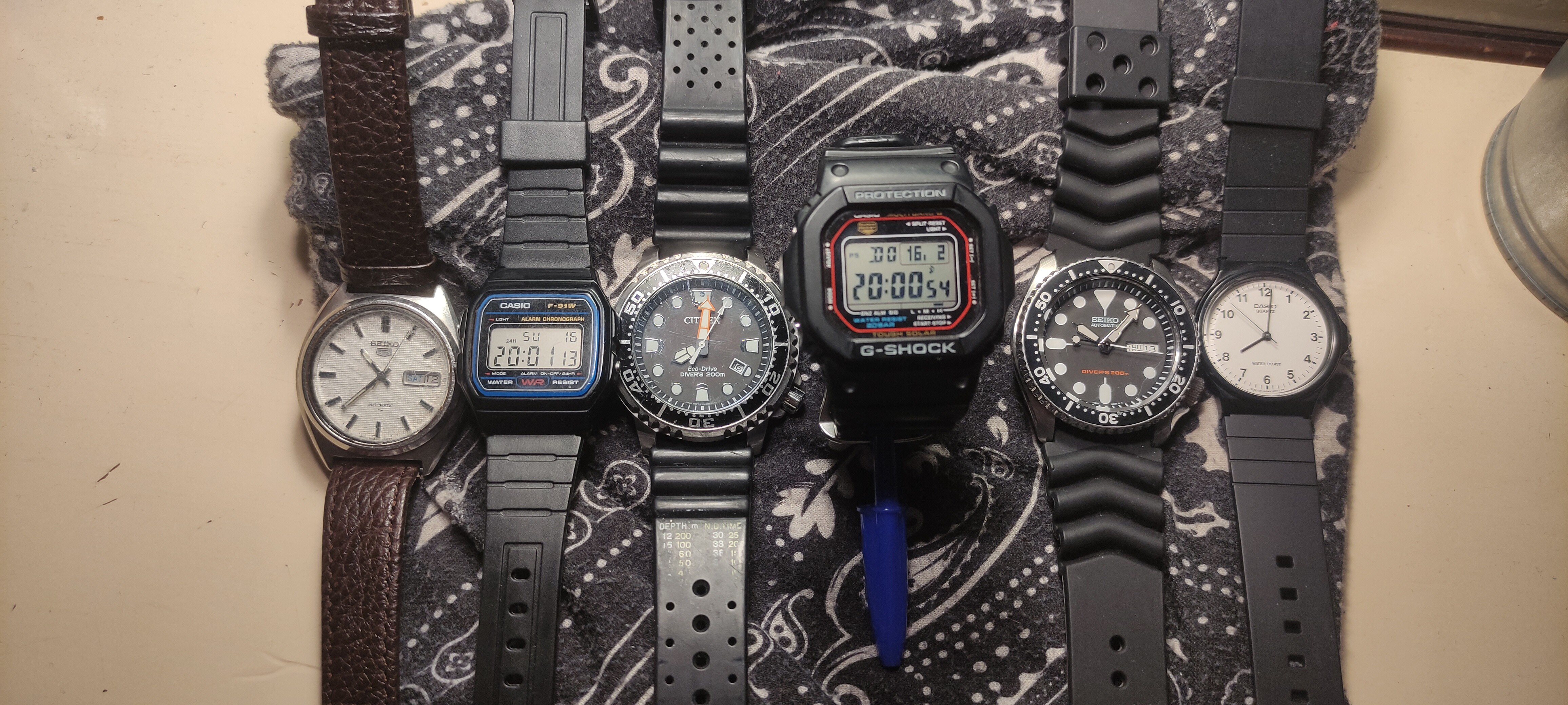 Después de hacer un rápido descarte de relojes bonitos y blanditos, me quedé con dos: el Gshock GW-M5610, solar y radiocontrolado, y el Seiko SKX007, ambos candidatos a intentar soportar un escenario de supervivencia extremo.