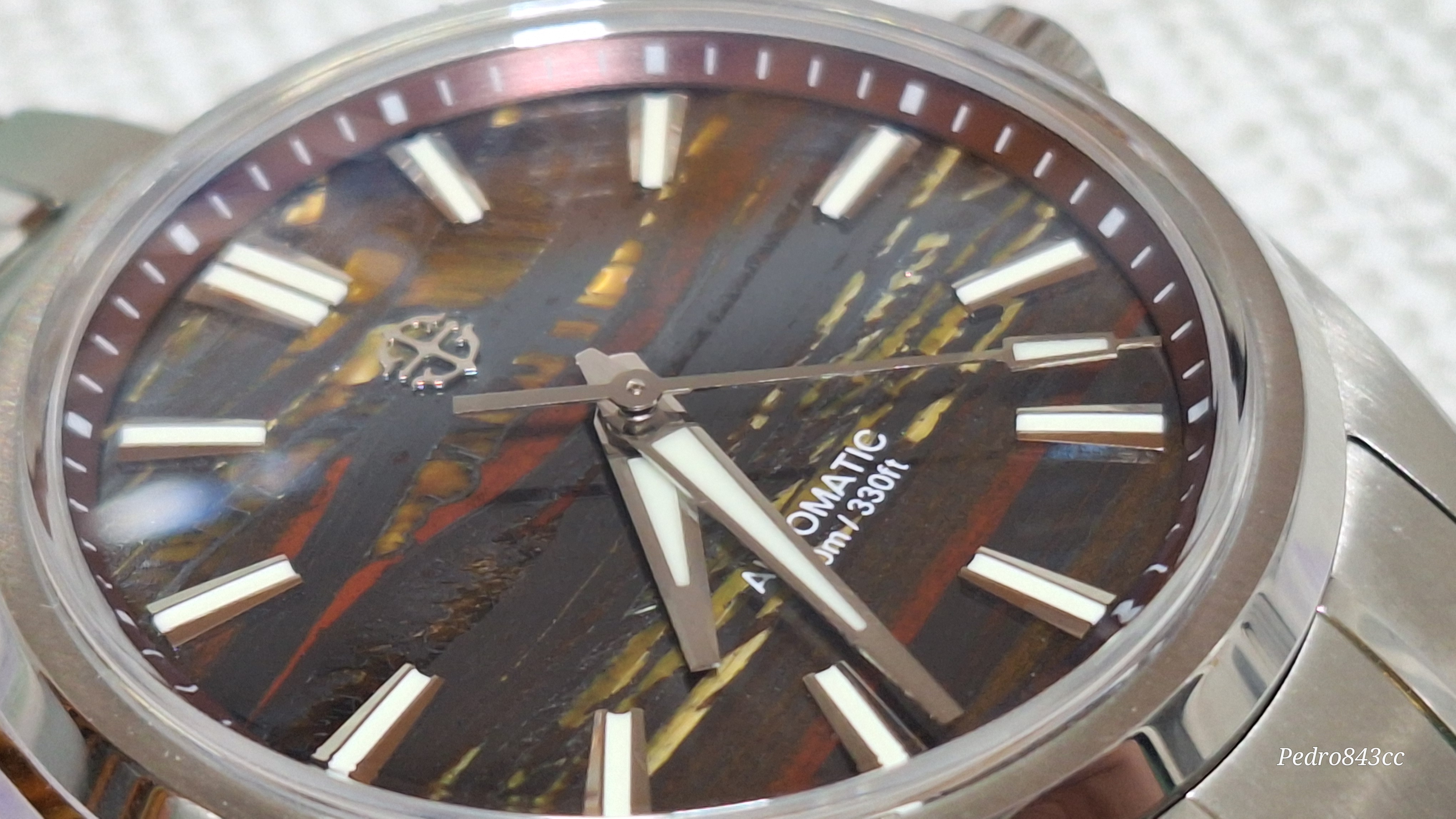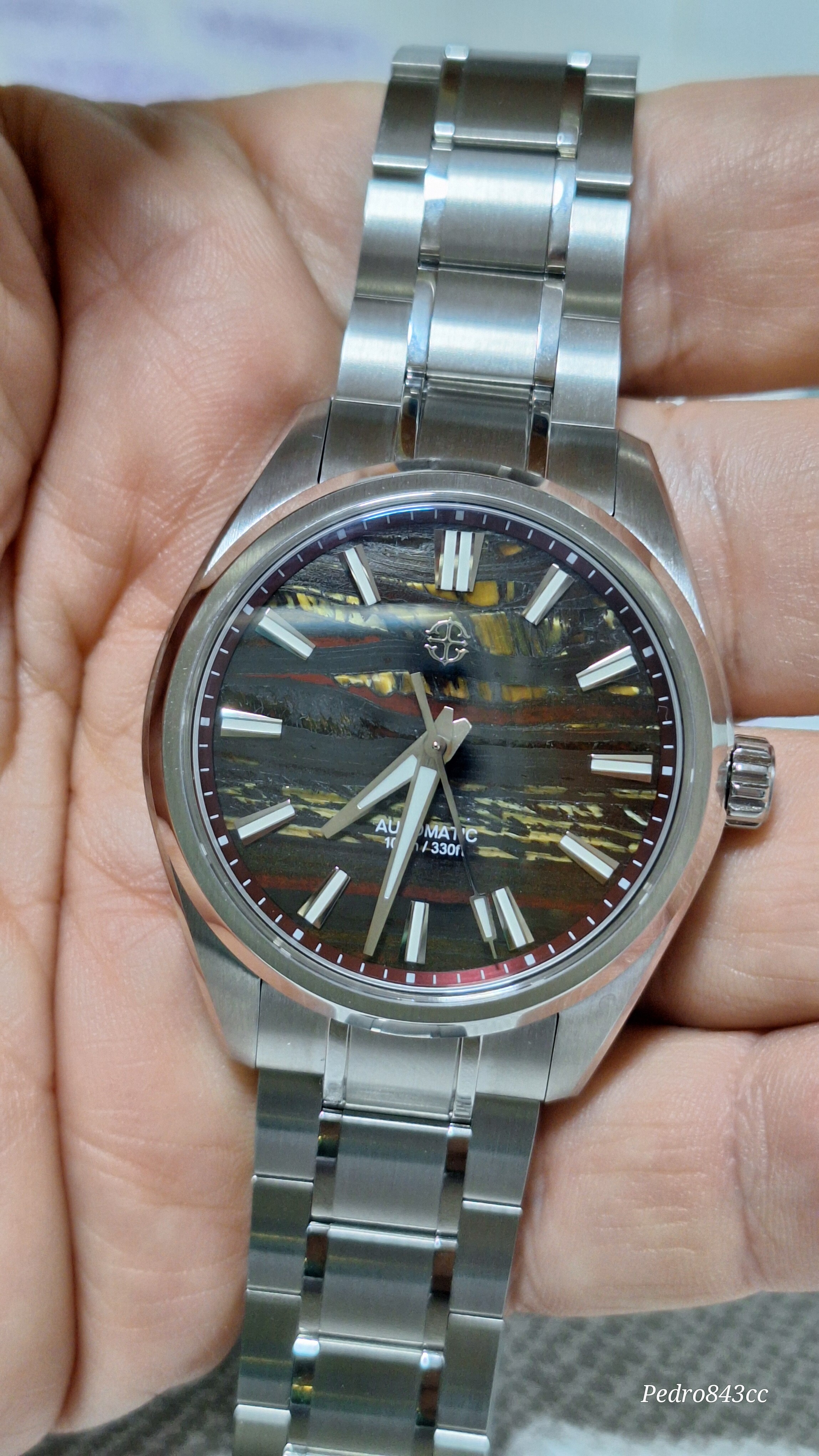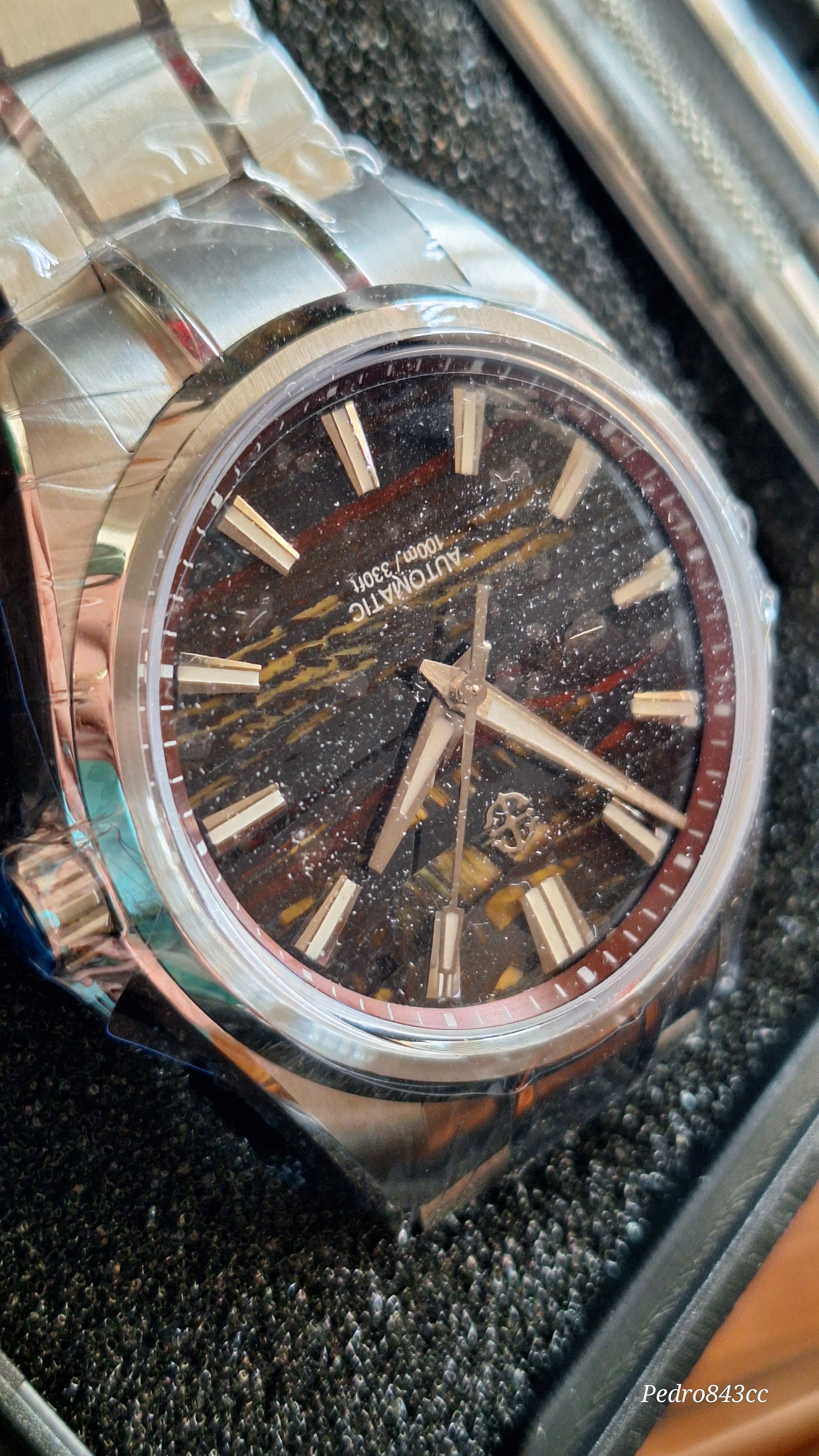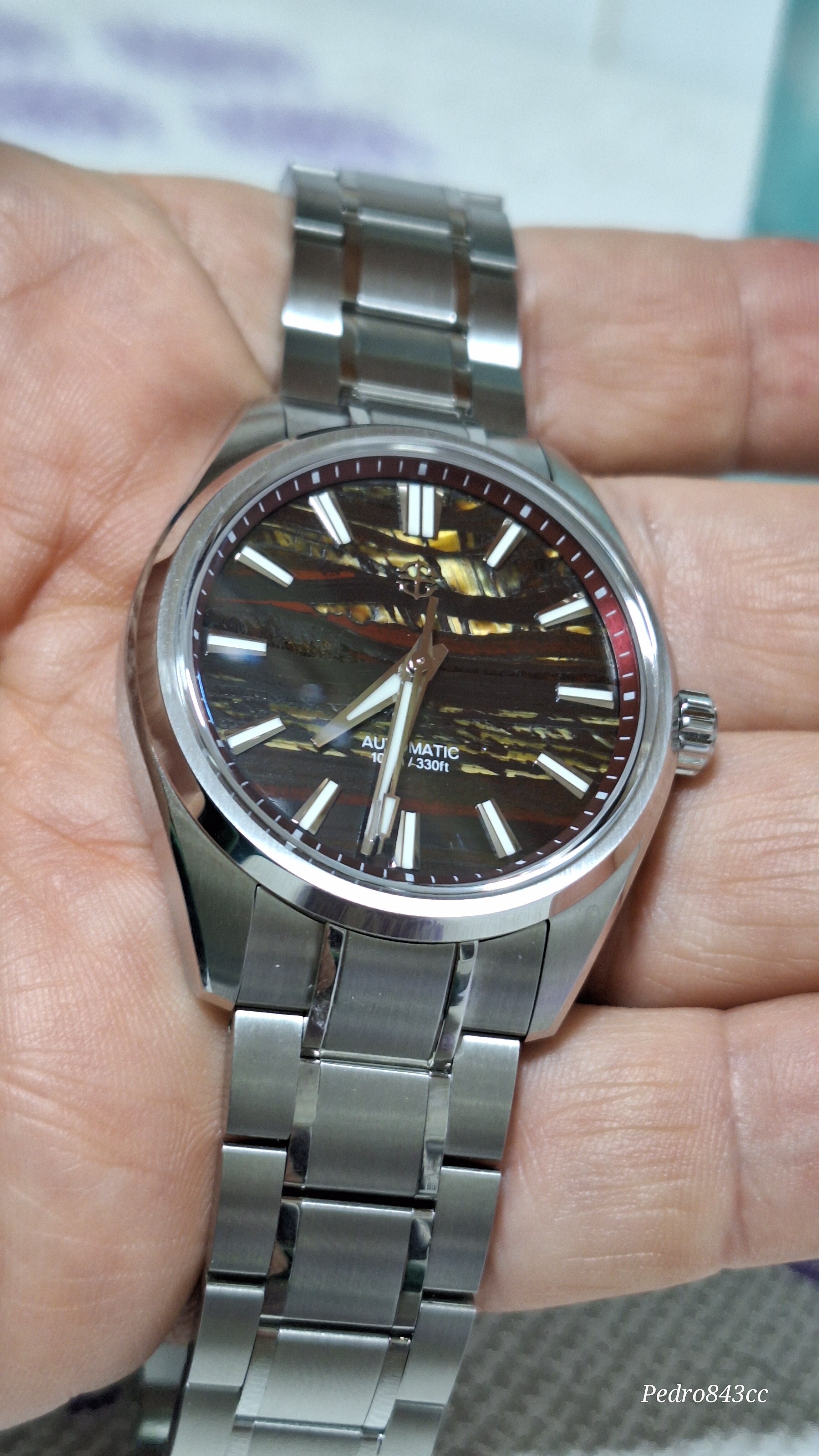 Me gusta mucho este tuyo. Se ve bien acabado, tiene aspecto de mas reloj de lo que sugiere su PVP, la esfera es rojizo o rojo amarronado?, las vetas son color mostaza creo, con el monitor no capto bien la pequeñadiferencia. Yo al final cancele el Shard Turquoise, porque se demoraba mucho y compre el patina Green, que tiene un proceso controlado de oxidacion en la esfera, con lo cual tampoco hay dos relojes iguales.