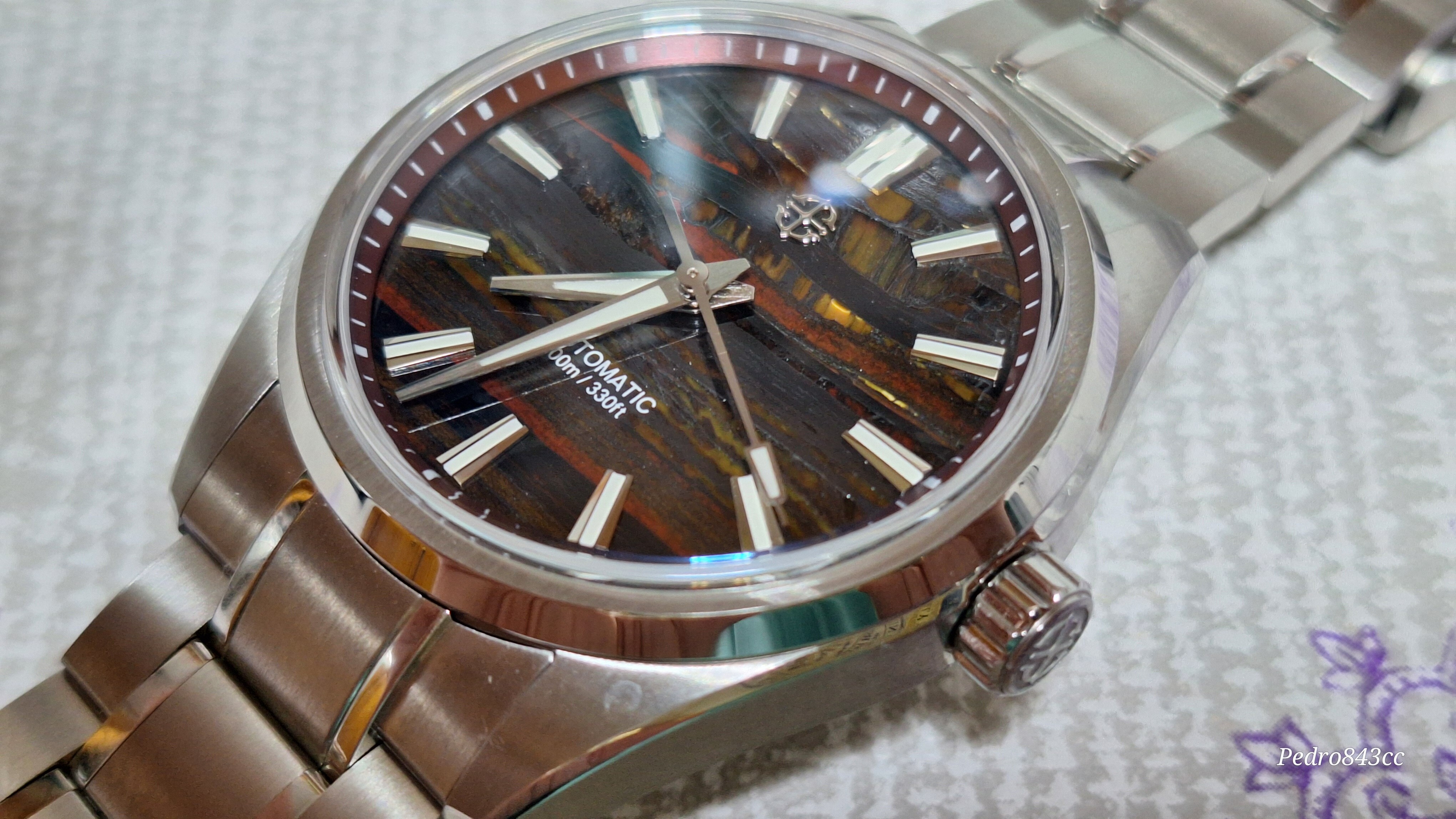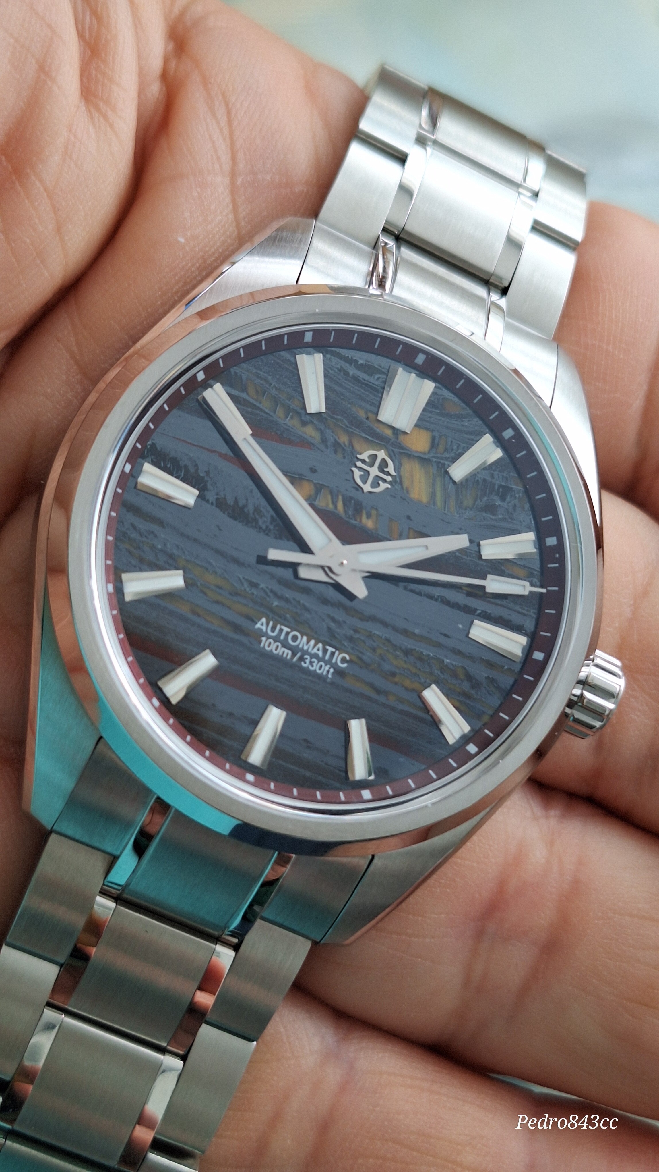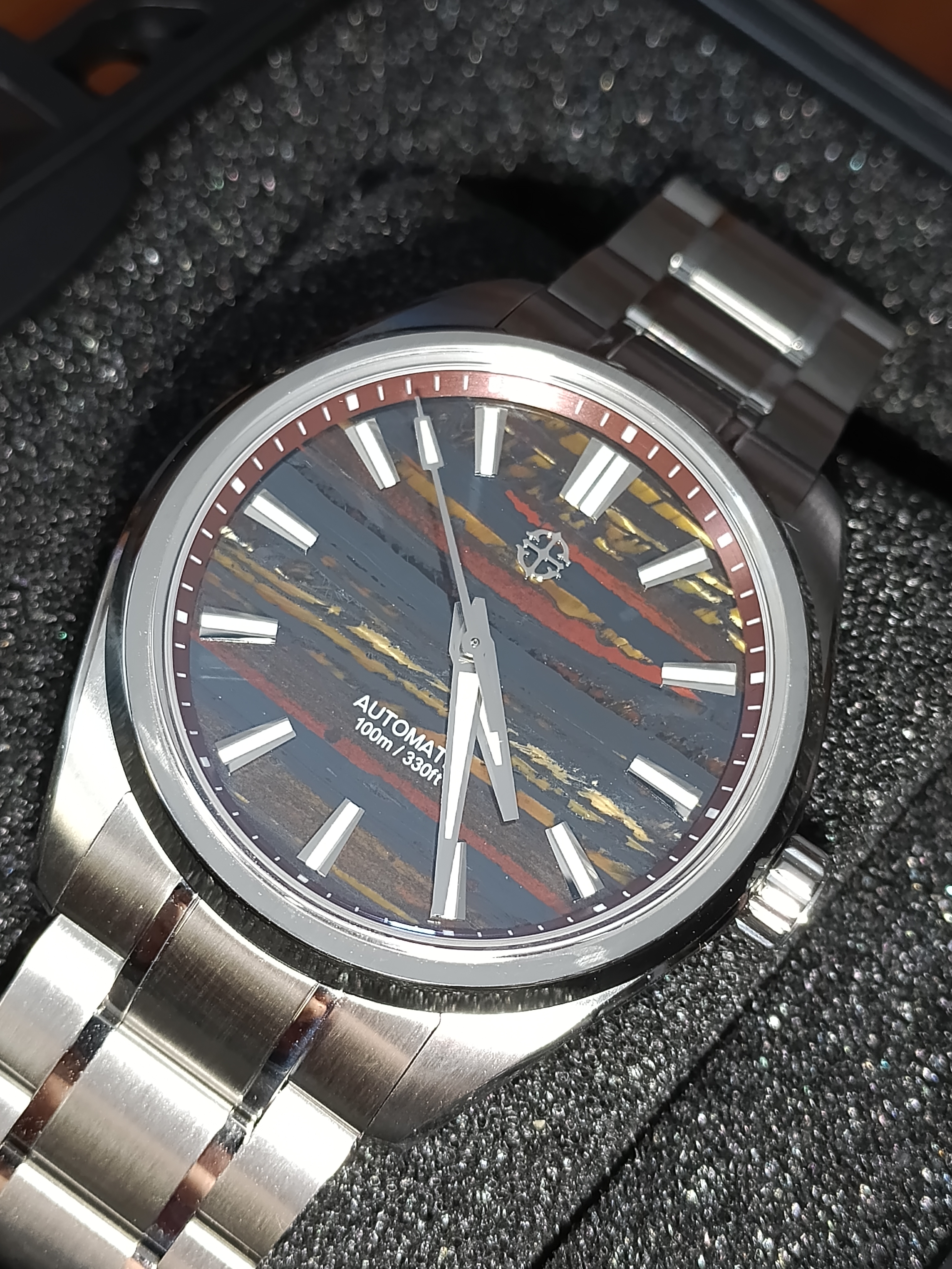 Me gusta mucho este tuyo. Se ve bien acabado, tiene aspecto de mas reloj de lo que sugiere su PVP, la esfera es rojizo o rojo amarronado?, las vetas son color mostaza creo, con el monitor no capto bien la pequeñadiferencia. Yo al final cancele el Shard Turquoise, porque se demoraba mucho y compre el patina Green, que tiene un proceso controlado de oxidacion en la esfera, con lo cual tampoco hay dos relojes iguales.