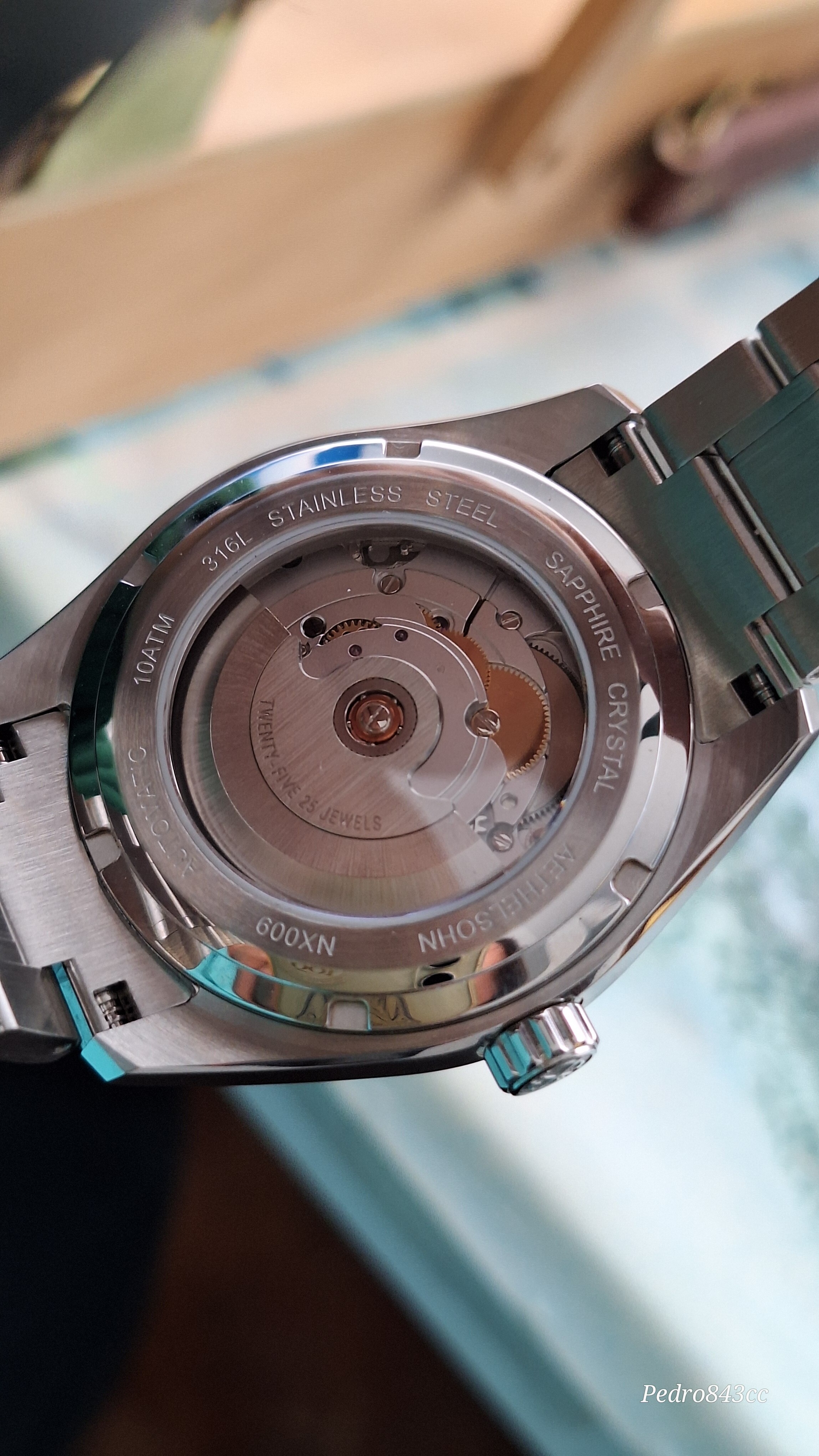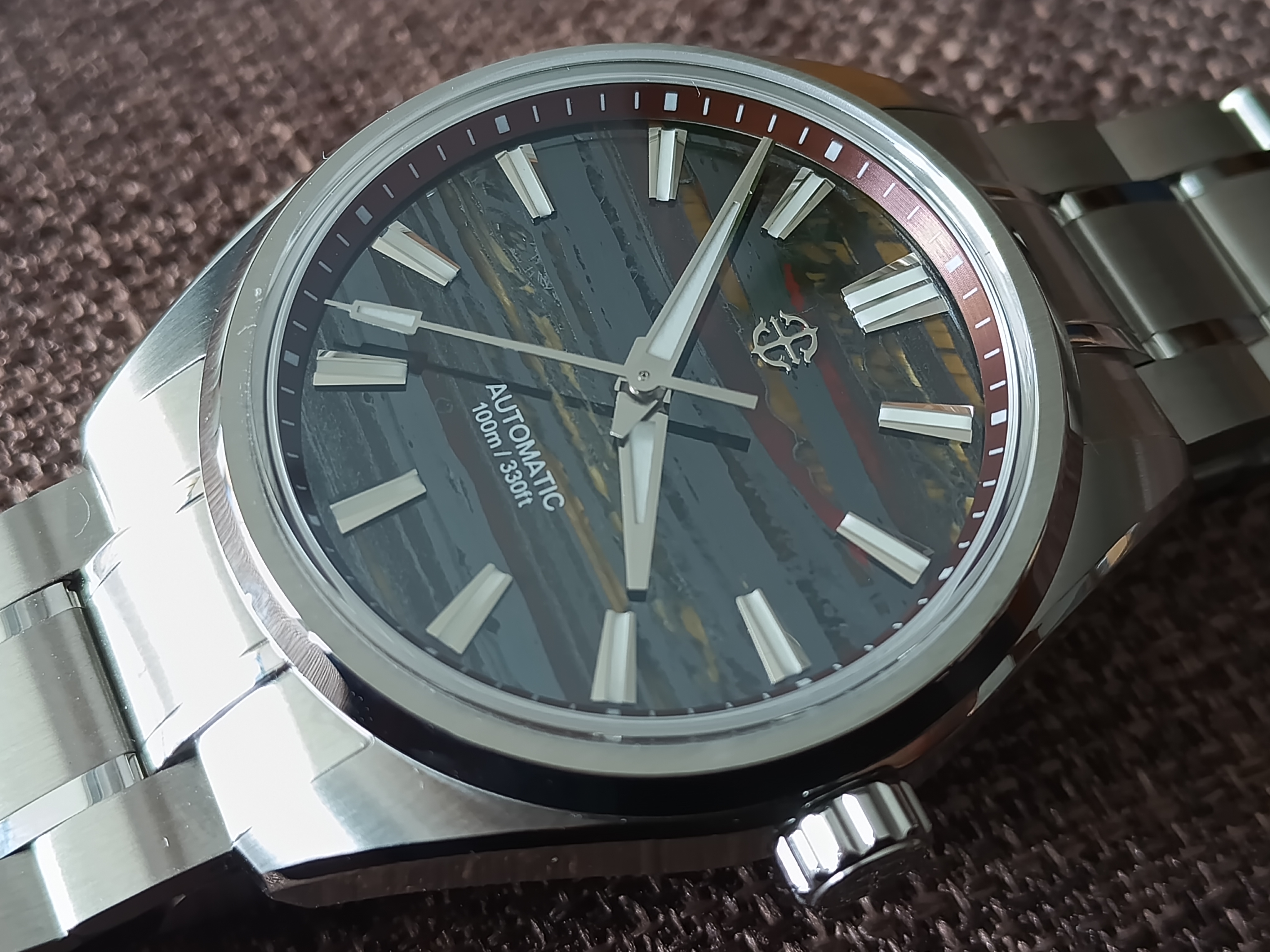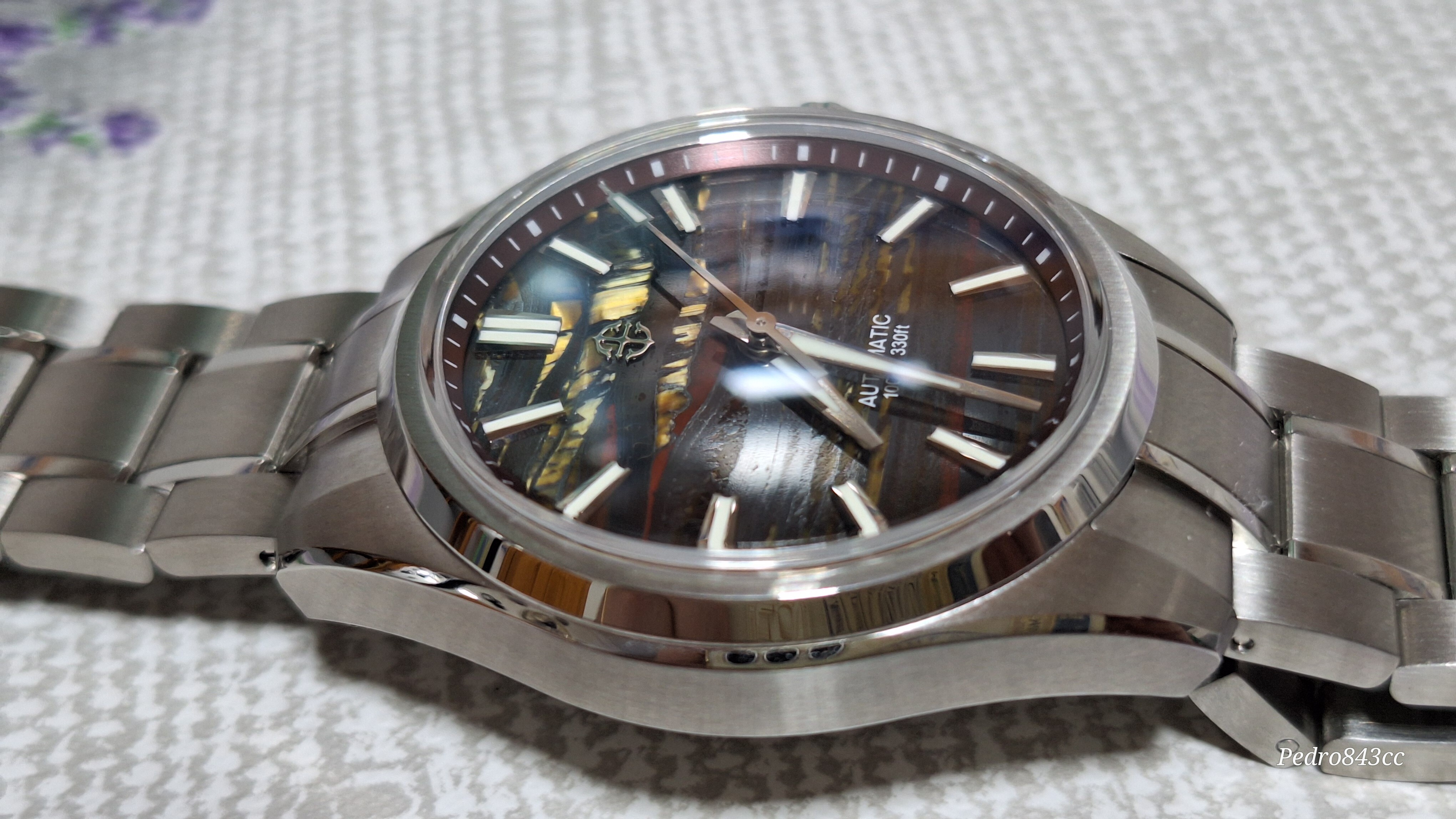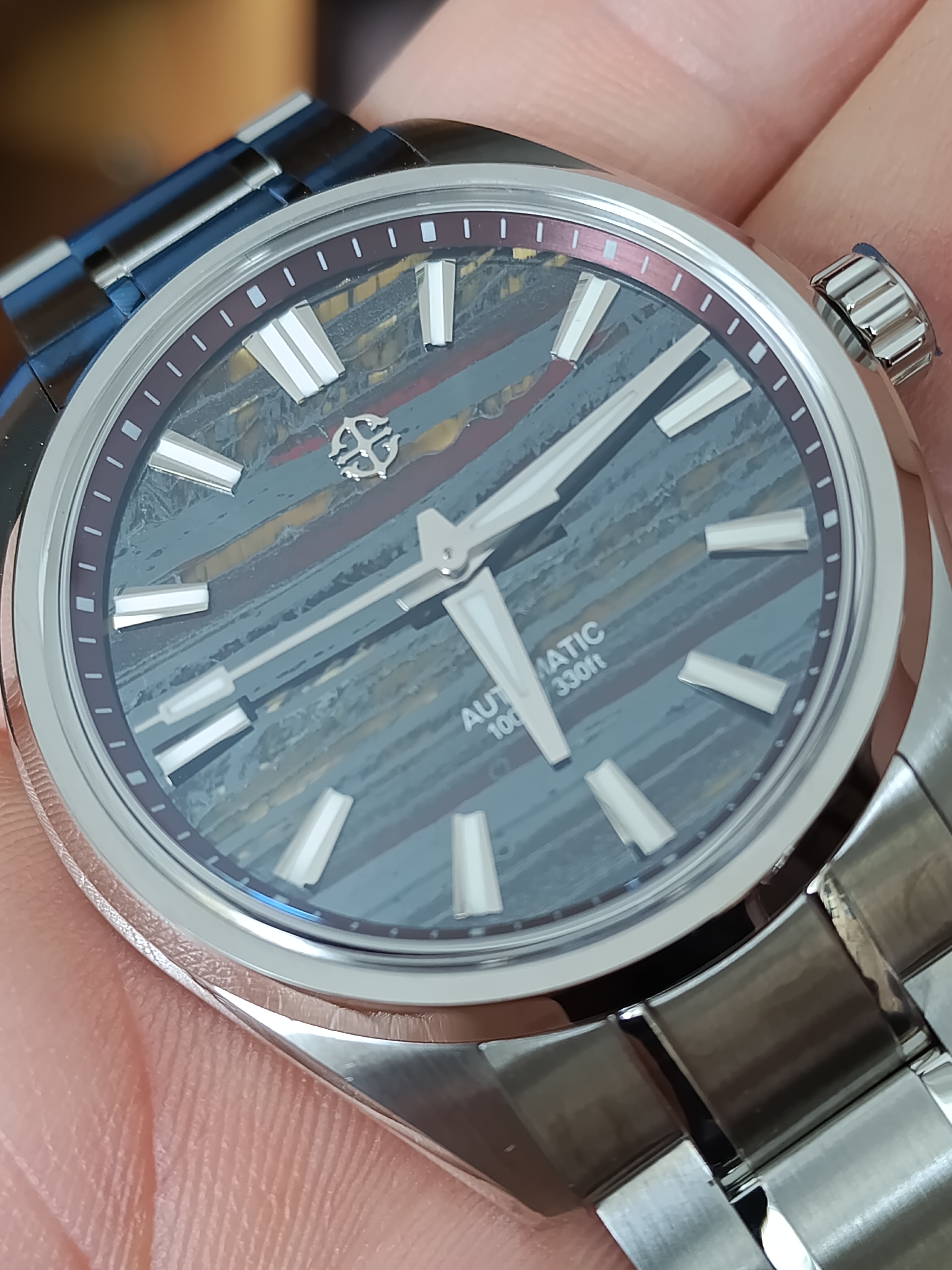 Me gusta mucho este tuyo. Se ve bien acabado, tiene aspecto de mas reloj de lo que sugiere su PVP, la esfera es rojizo o rojo amarronado?, las vetas son color mostaza creo, con el monitor no capto bien la pequeñadiferencia. Yo al final cancele el Shard Turquoise, porque se demoraba mucho y compre el patina Green, que tiene un proceso controlado de oxidacion en la esfera, con lo cual tampoco hay dos relojes iguales.