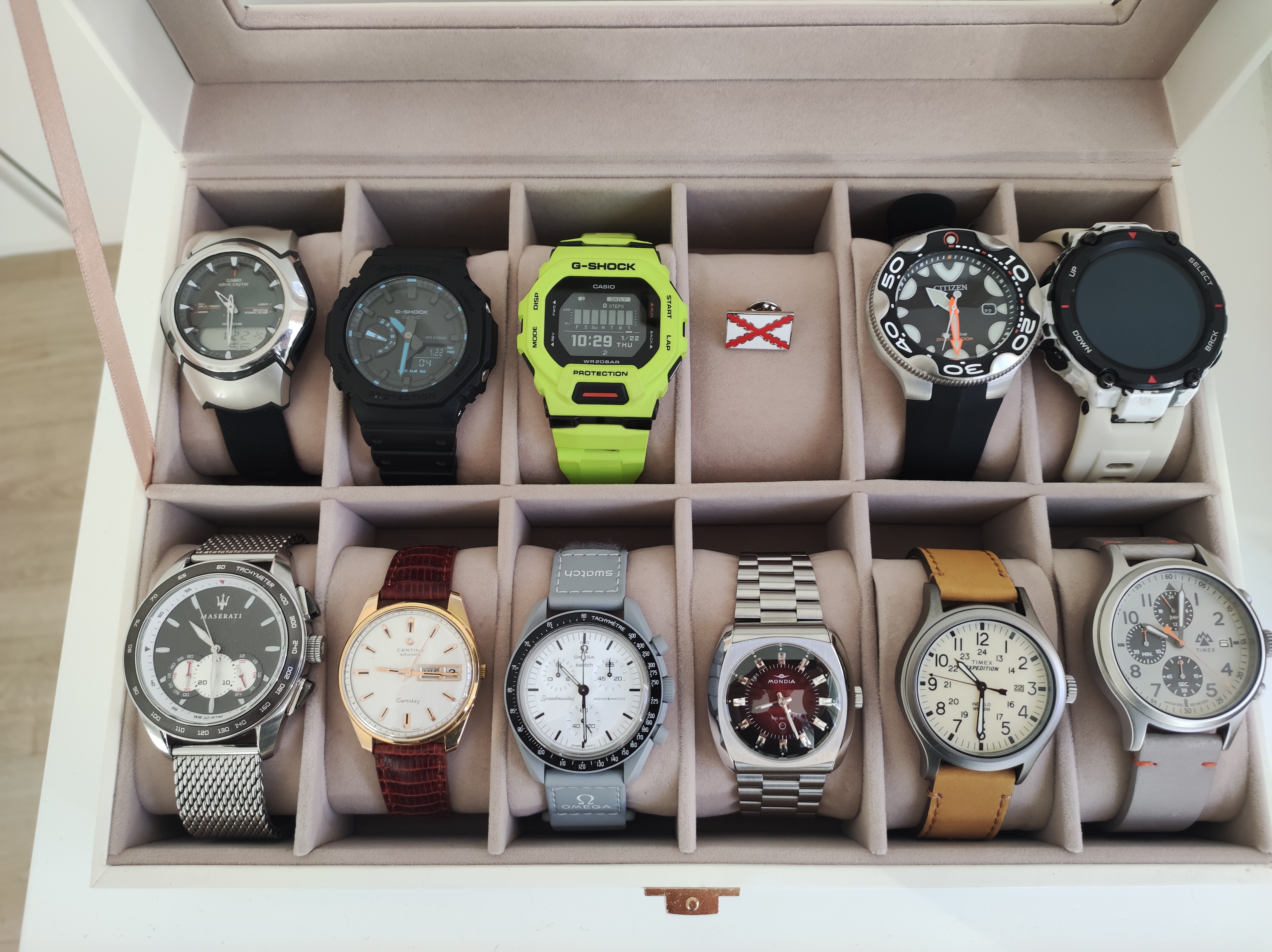 Aquí os dejo una foto de mi caja con mis por ahora 11 relojes. Dejo una pequeña descripción de arriba a abajo: