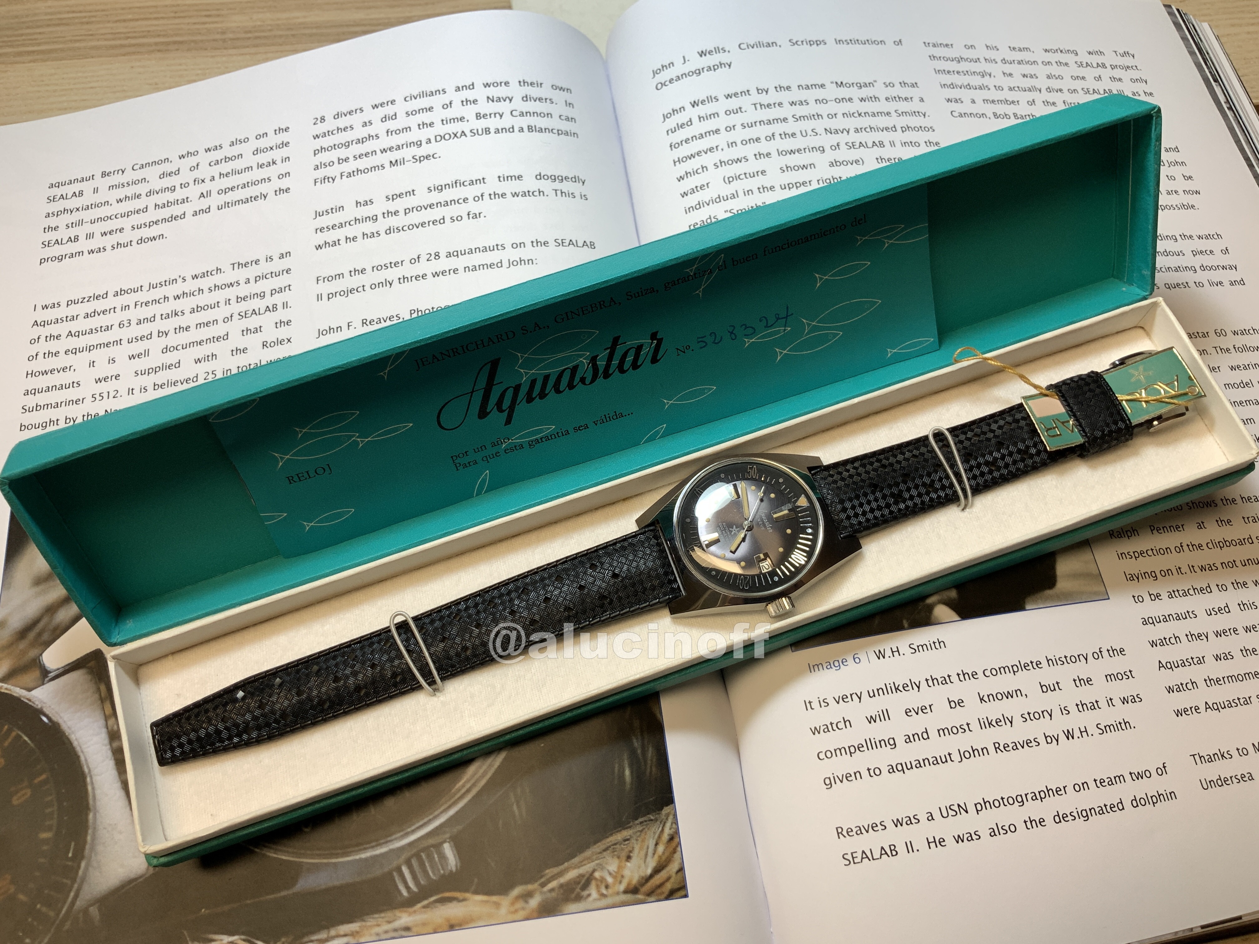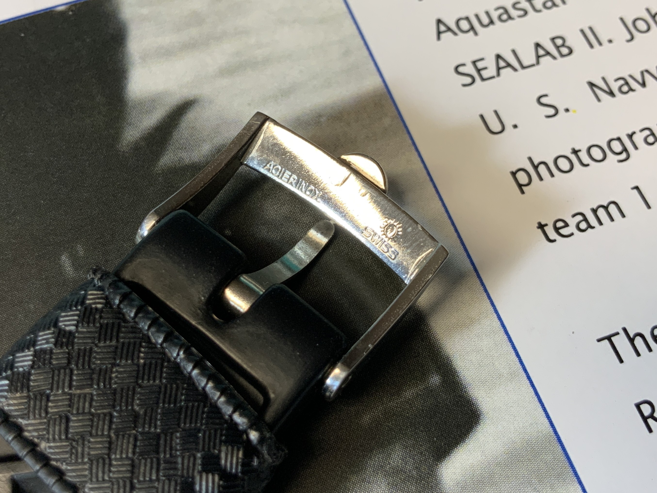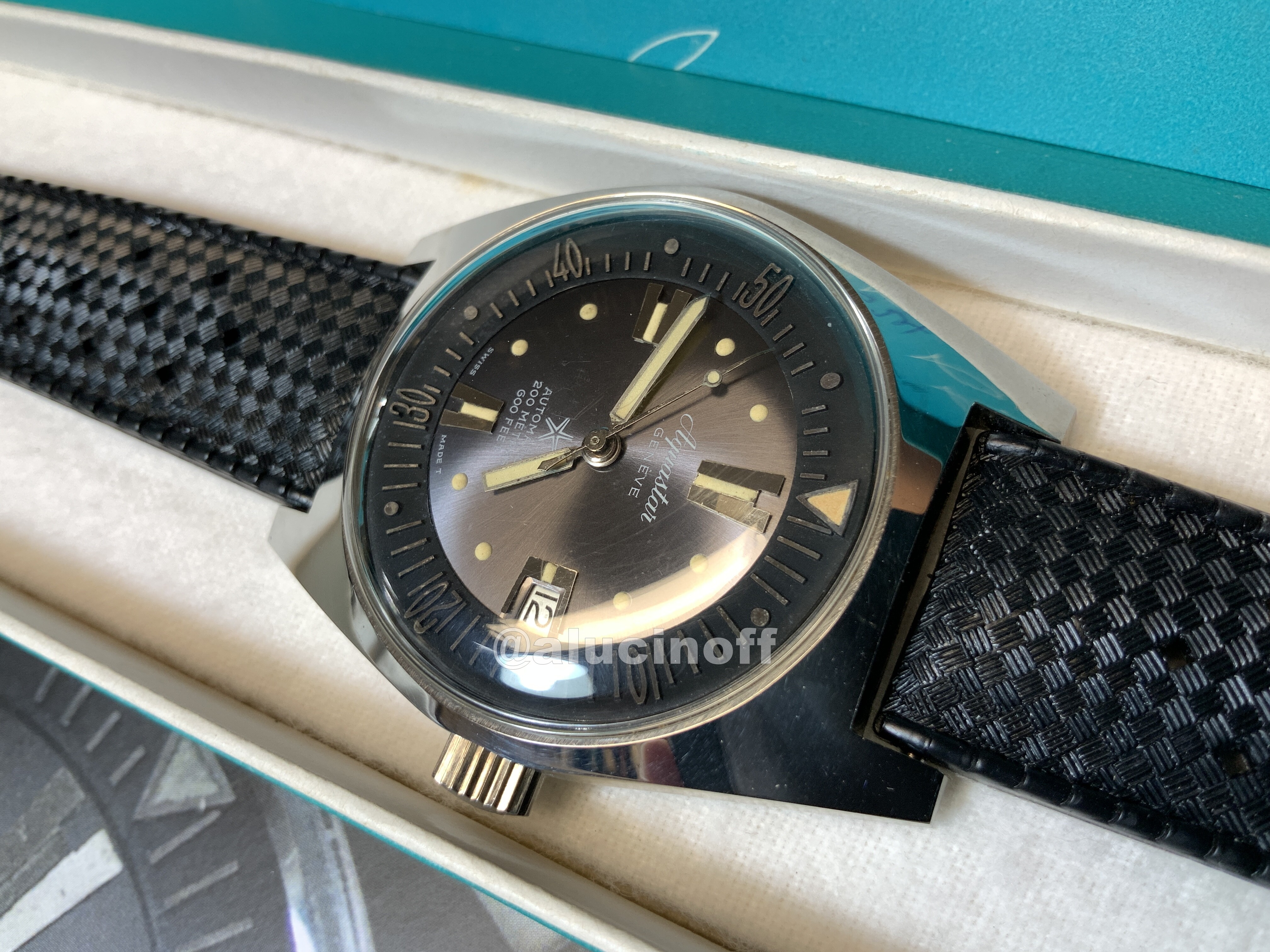 Como características técnicas, recordemos que estos relojes tienen la típica caja de los skin diver de la época. Caja en la que se basó Seiko para hacer su primer diver, el 62mas. Básicamente Seiko desarrolló un diver a toda prisa mientras echaba el resto con los cronos destinados a sus JJOO, y aprovechó la caja de los relojes de buceo suizos, e incluso la correa, ya que incluyó también una Tropic Swiss made.