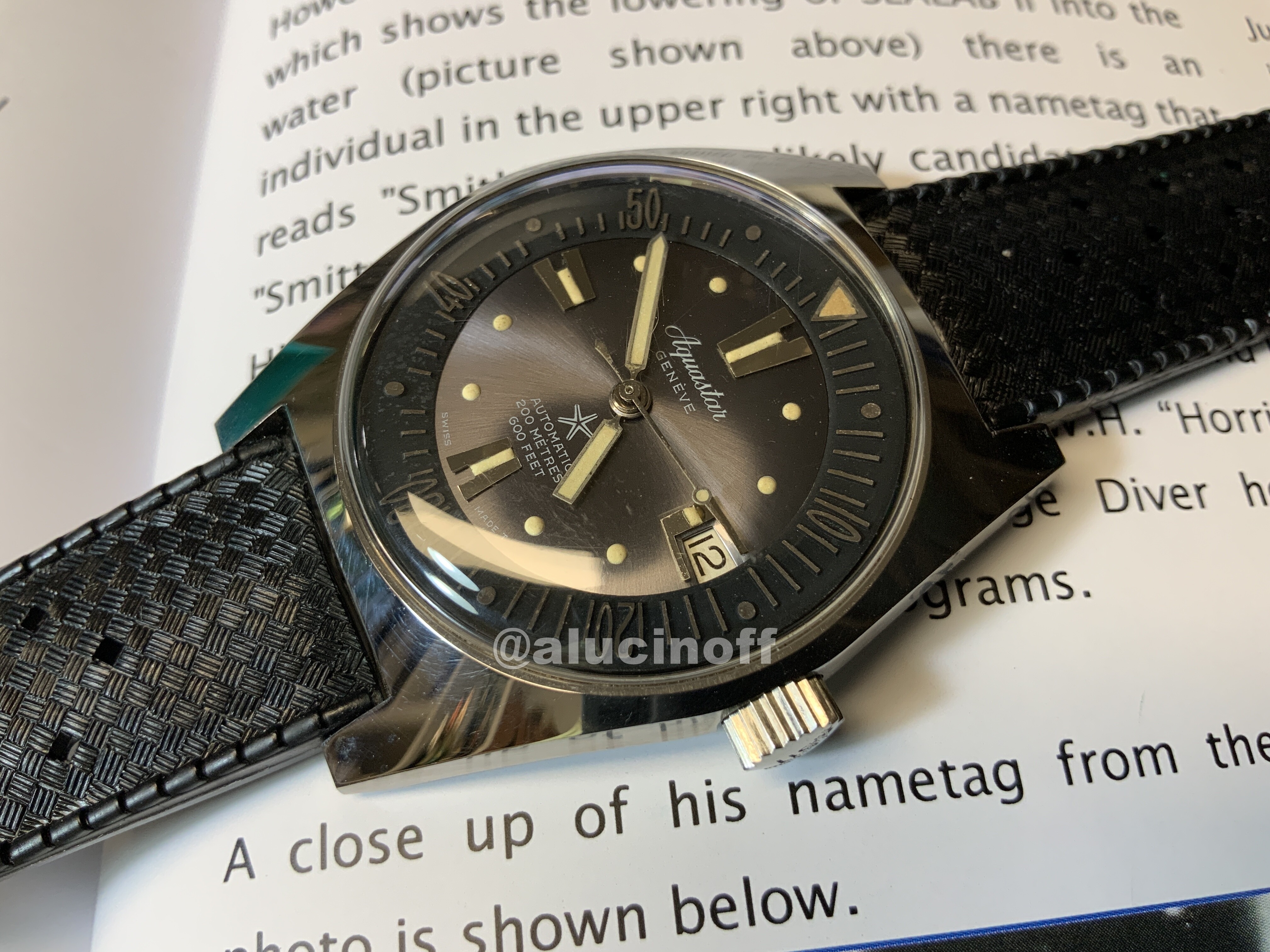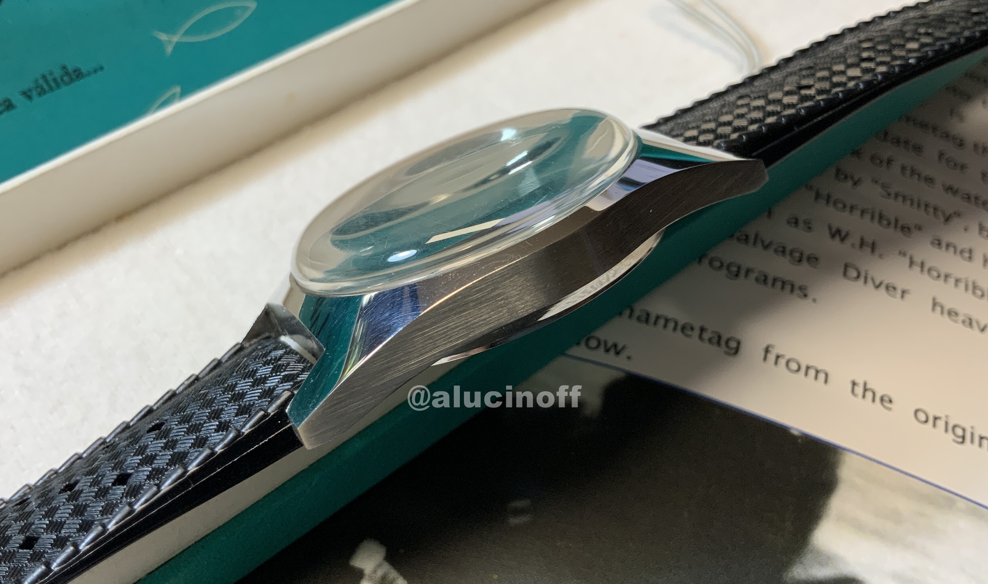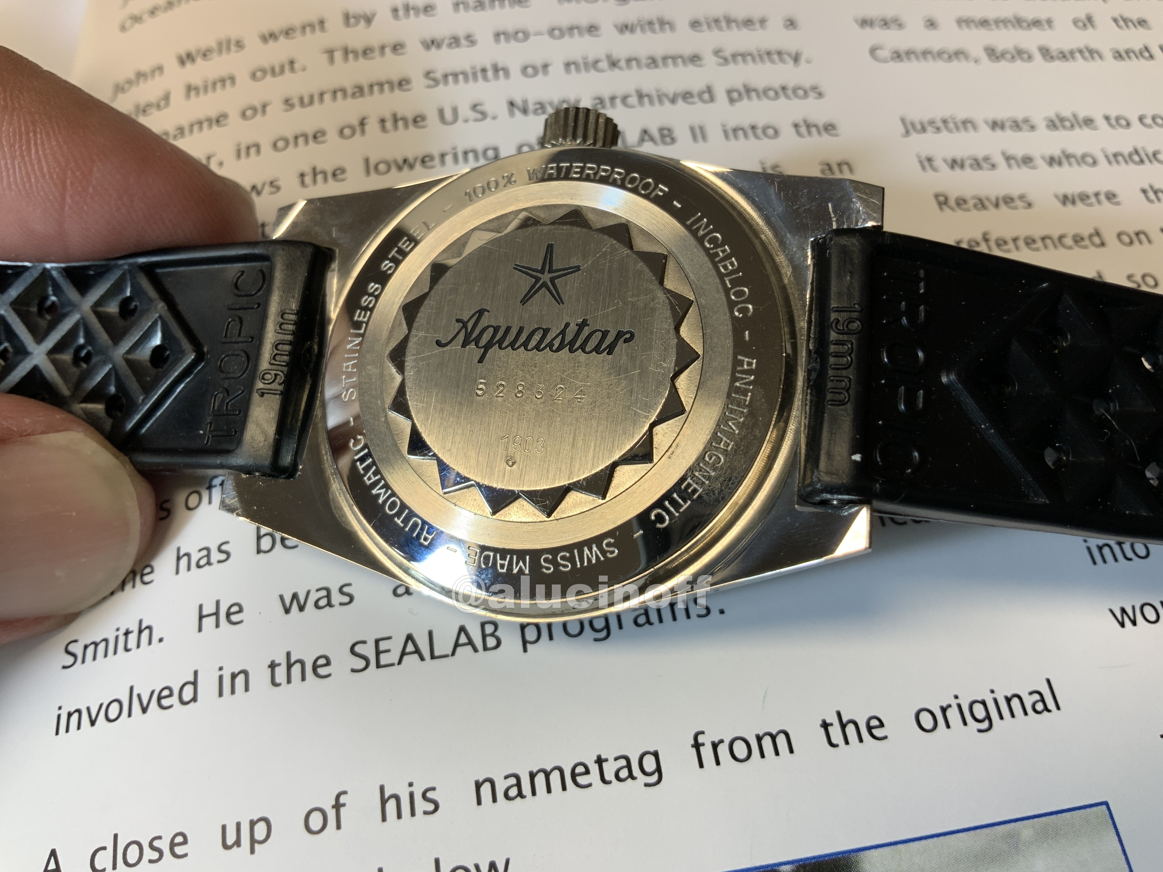 Como características técnicas, recordemos que estos relojes tienen la típica caja de los skin diver de la época. Caja en la que se basó Seiko para hacer su primer diver, el 62mas. Básicamente Seiko desarrolló un diver a toda prisa mientras echaba el resto con los cronos destinados a sus JJOO, y aprovechó la caja de los relojes de buceo suizos, e incluso la correa, ya que incluyó también una Tropic Swiss made.