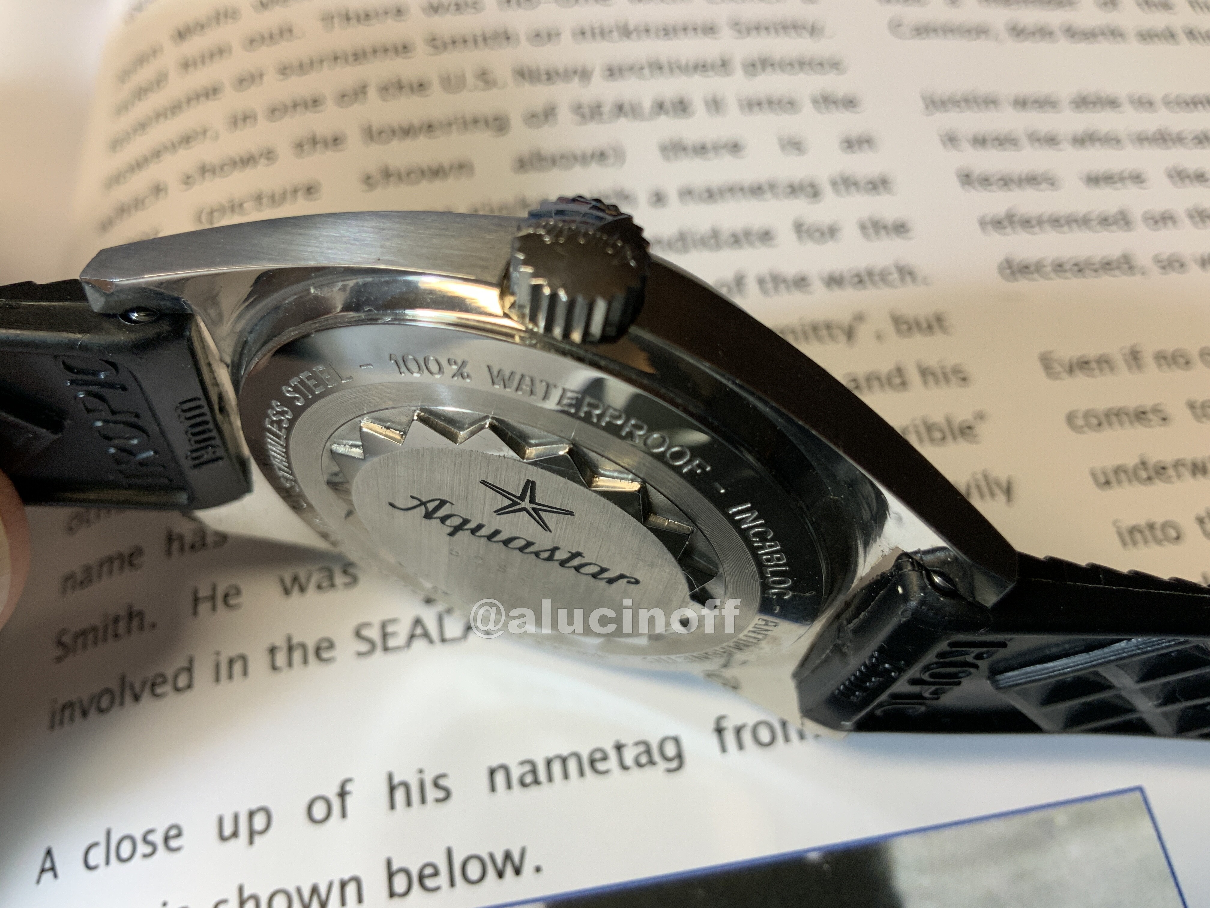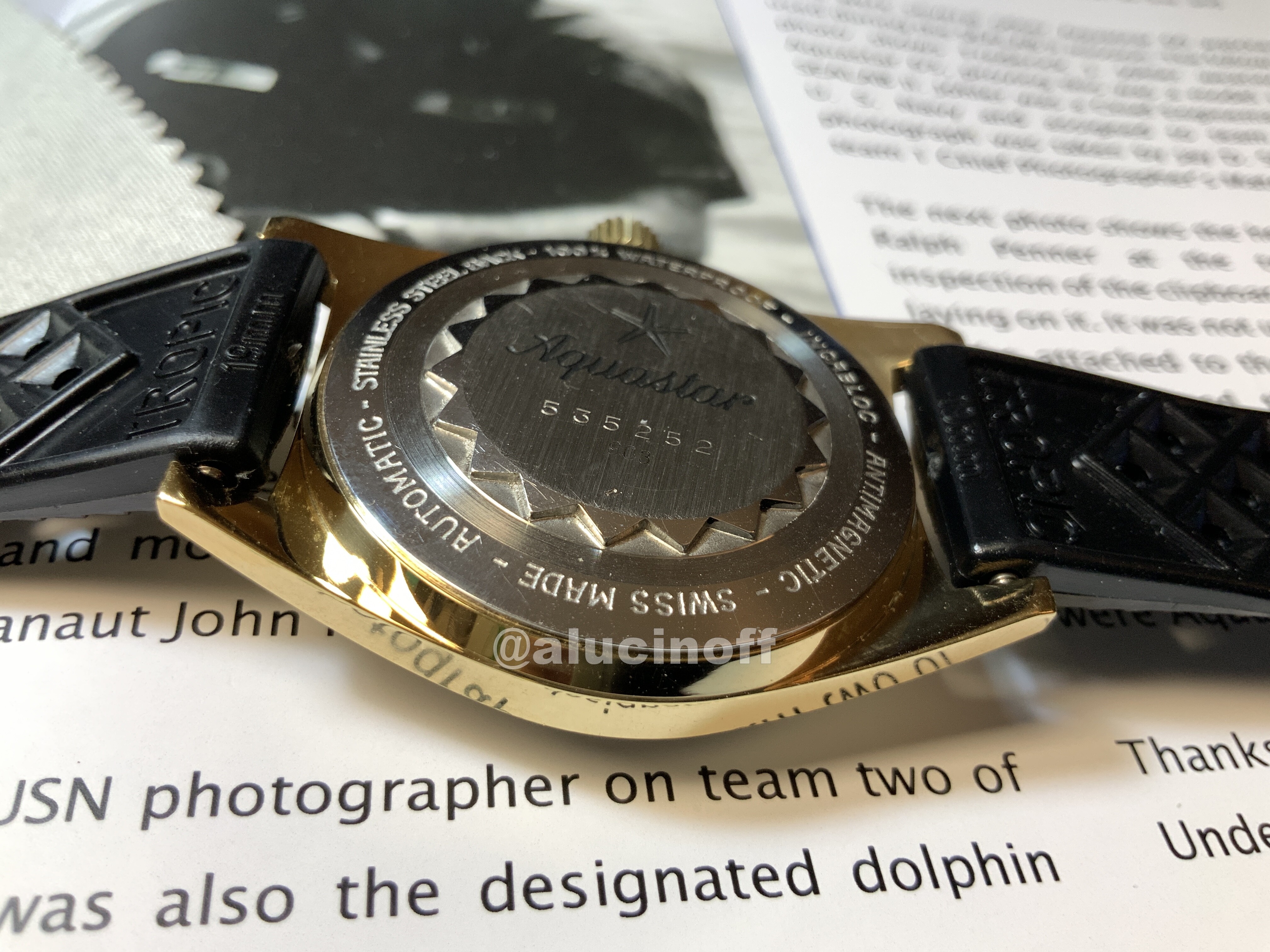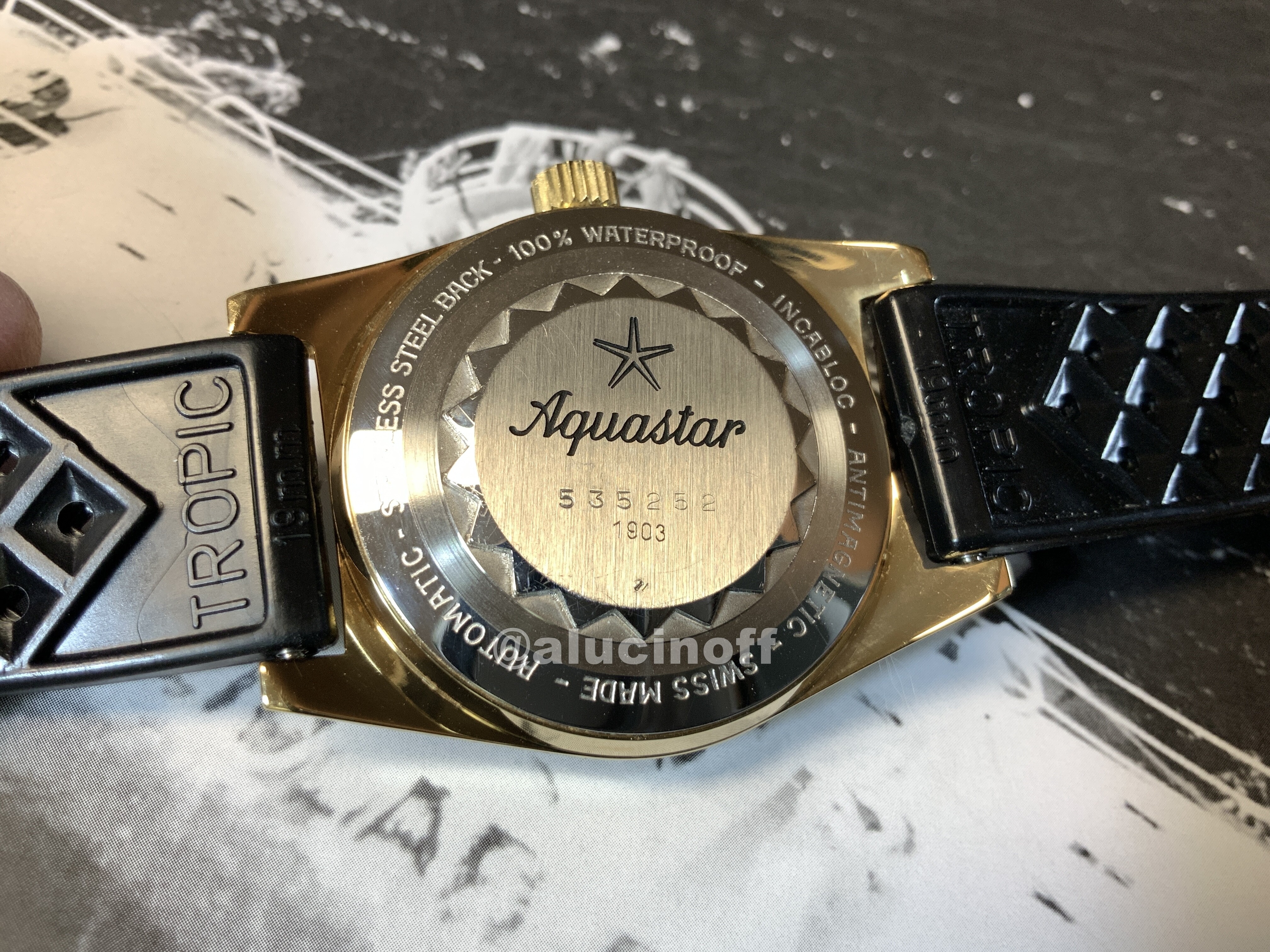 Podemos pasar ahora a la trasera. Aquastar se caracterizó por diseñar una tapa trasera que hace las delicias de los actuales coleccionistas, pero no de los relojeros. Es una pena, pero la falta de la herramienta adecuada ha hecho que muchas de estas tapas estén destrozadas por relojeros ñapas…