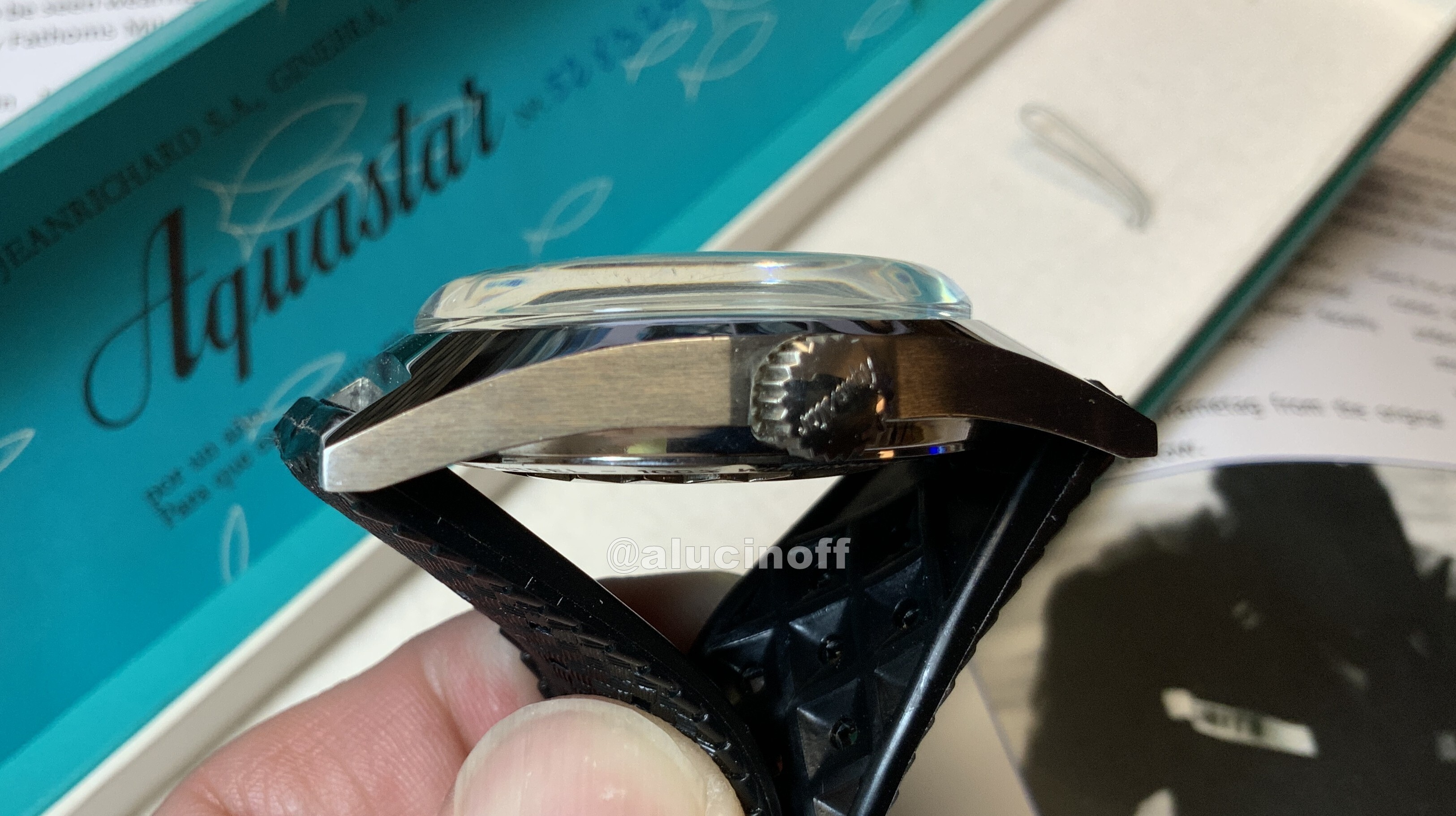 Este bisel fue una invención de la propia Aquastar, y así queda registrado en la patente suiza nº CH171362A4, Pièce d’horlogerie comprenant un organe de remontage et de mise à l’heure et une lunette rotative par rapport au cadran, montée à l’intérieur de la boîte