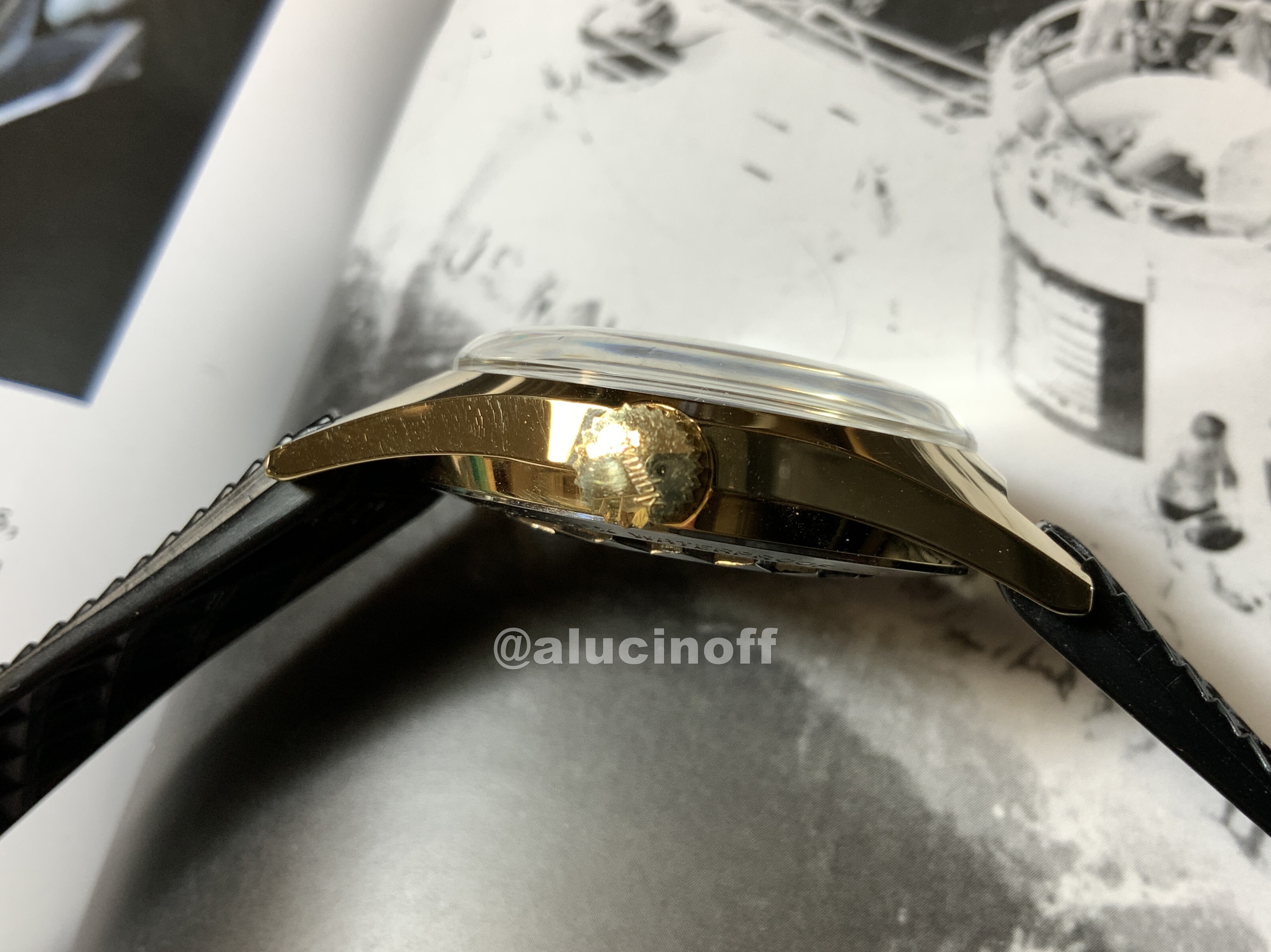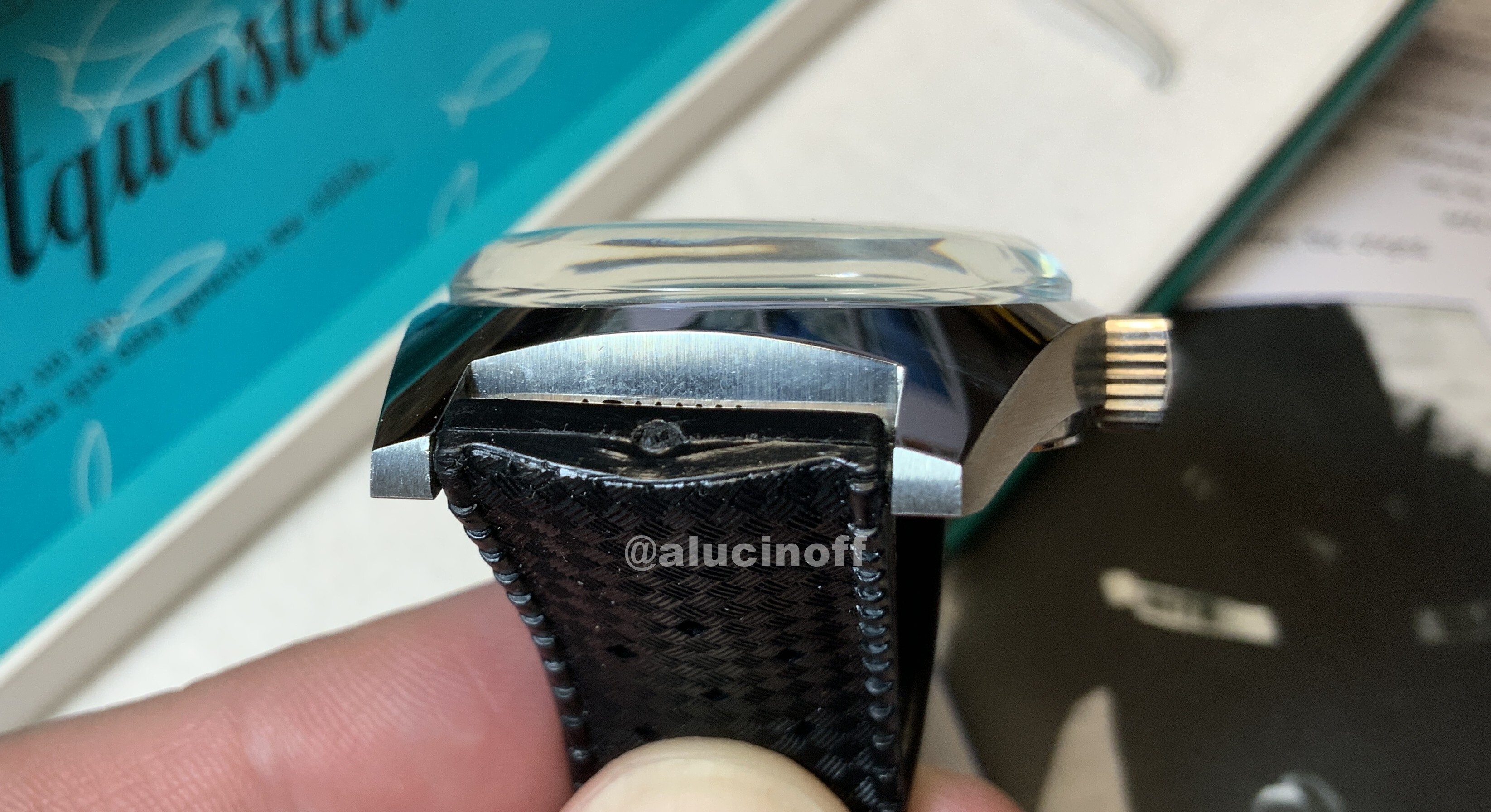 Los laterales de la caja son cepillados en las versiones de acero, y brillo en la chapada en oro. Las aristas de la caja no tienen ningún biselado. Vamos, la caja, estándar de los skin divers, tenía una forma bastante tosca. Al fin y al cabo, estos relojes eran una herramienta, y no se cuidaban tanto estas cosas.
