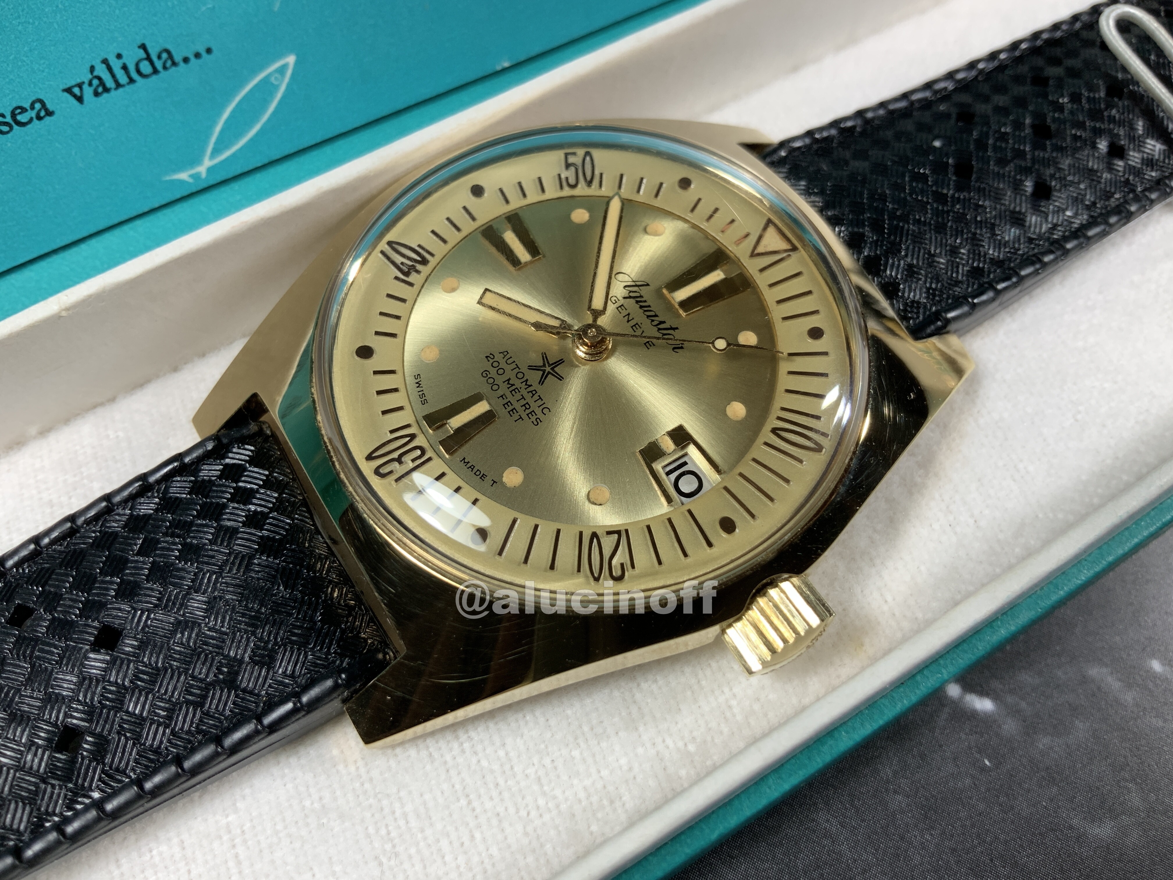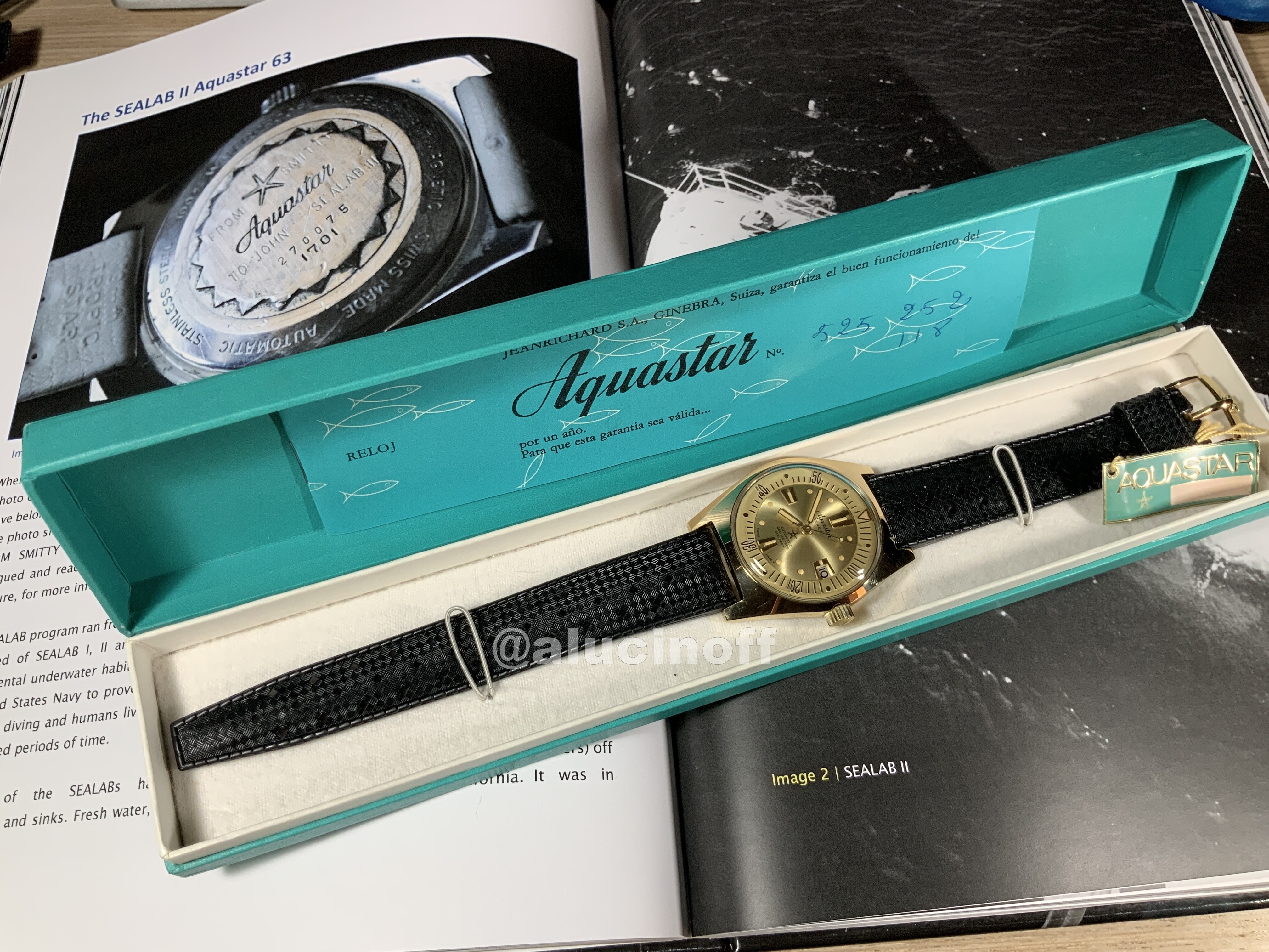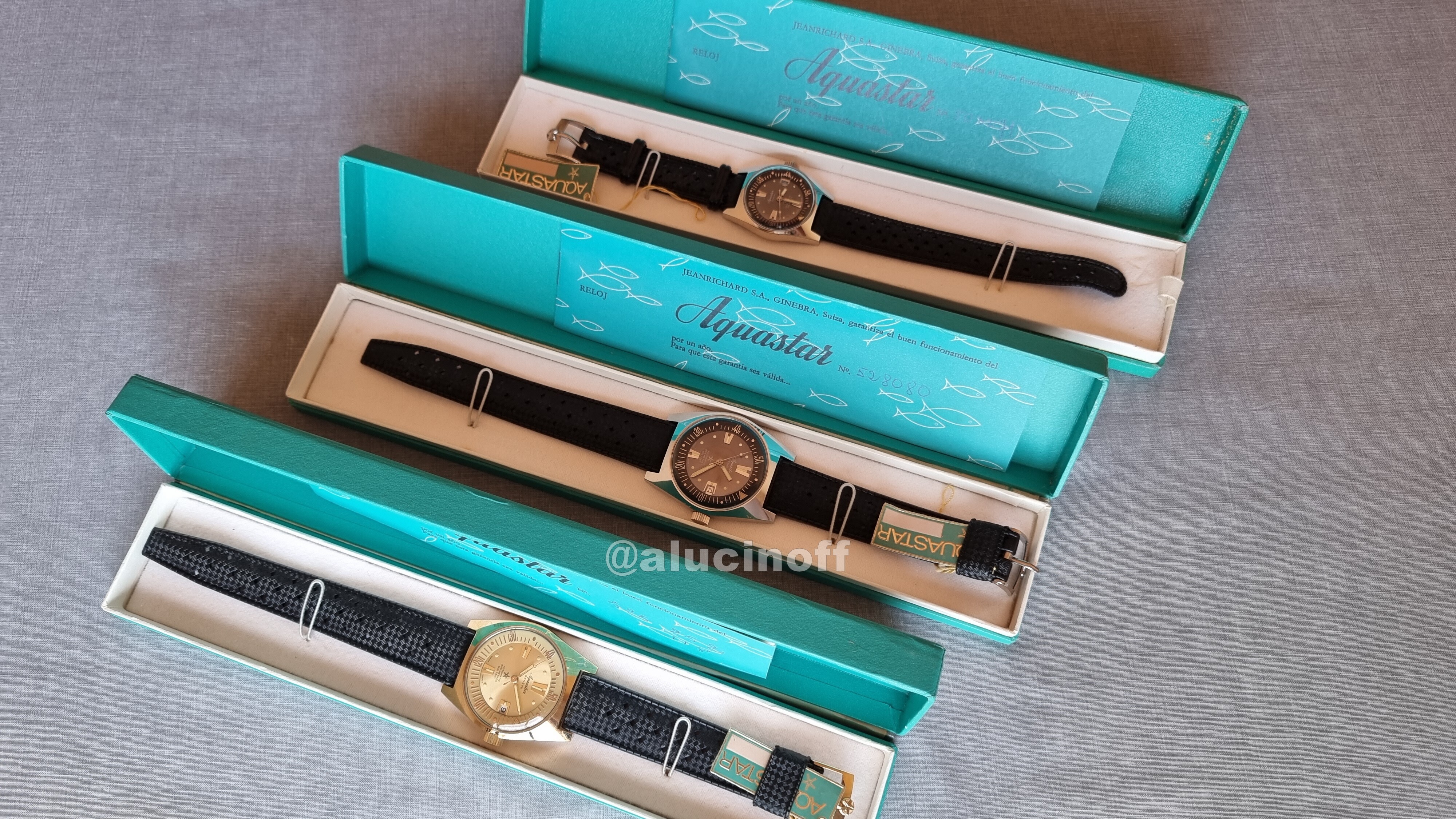 A través de un anuncio inocente y mal fotografiado, en el que se vendía un único reloj, acabé comprando varias unidades del modelo 63 de Aquastar en sus tres versiones, acero, chapado en oro, y de señora.