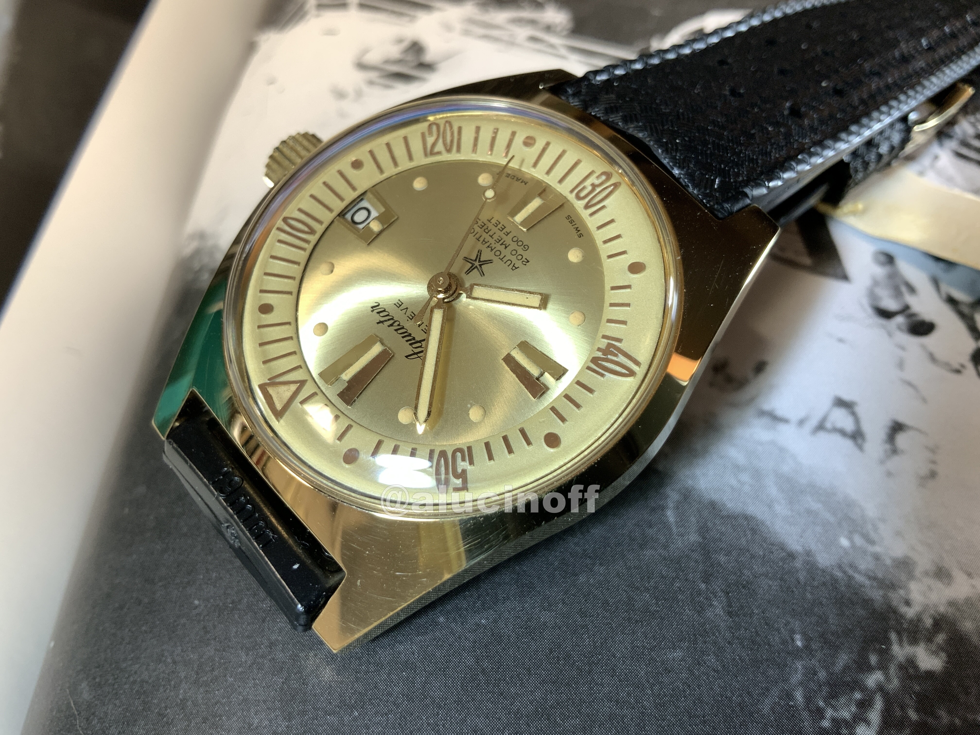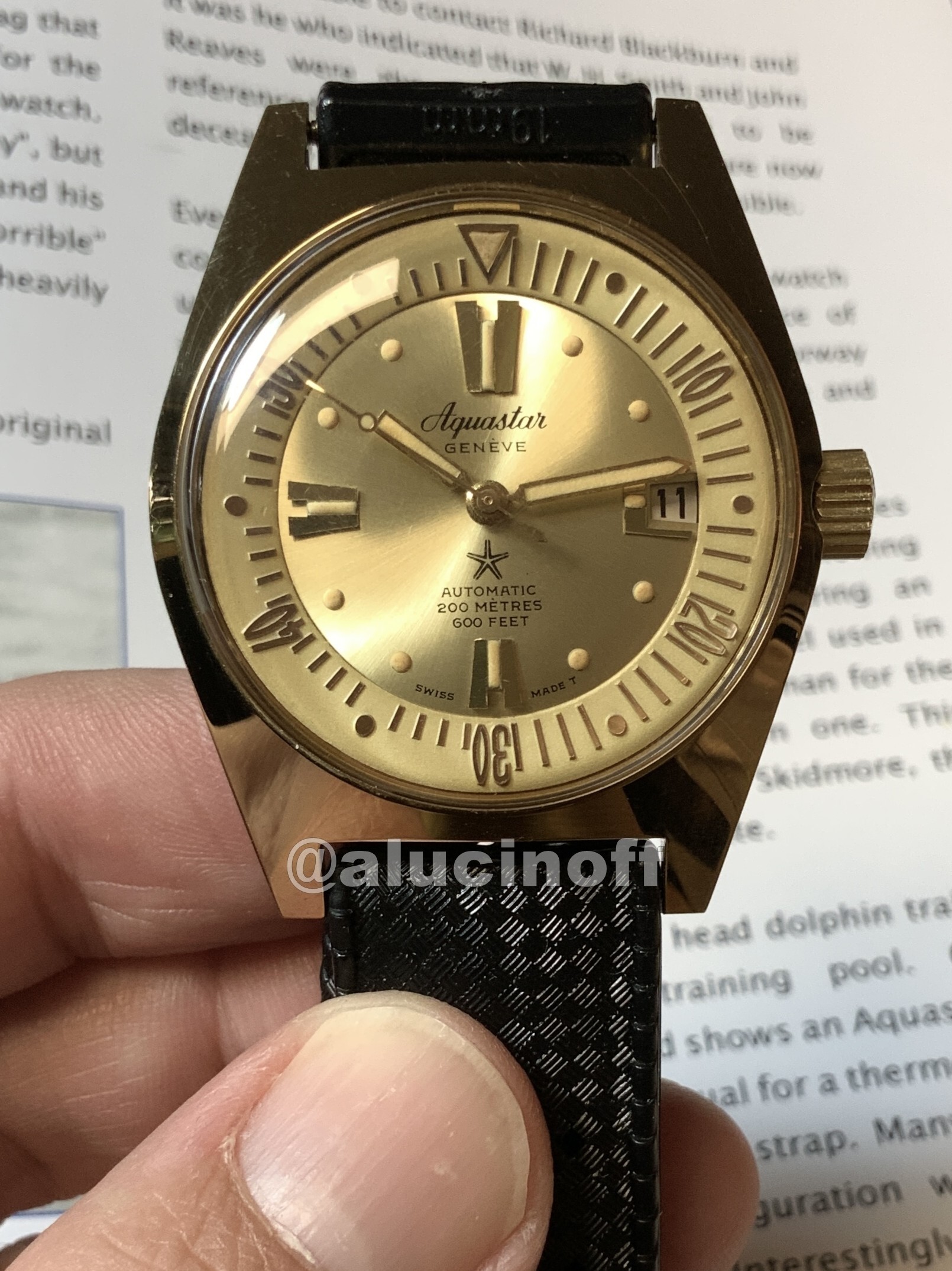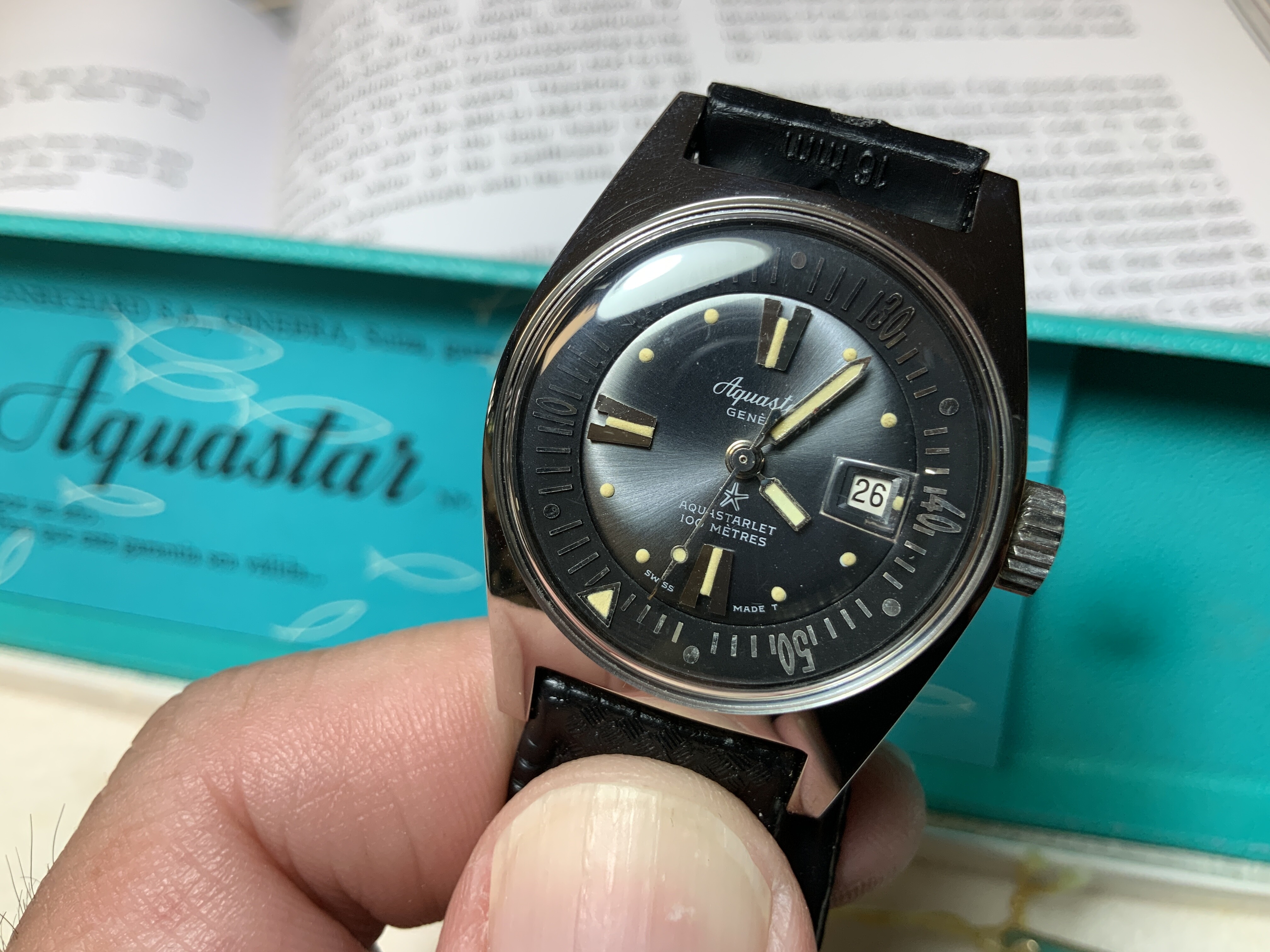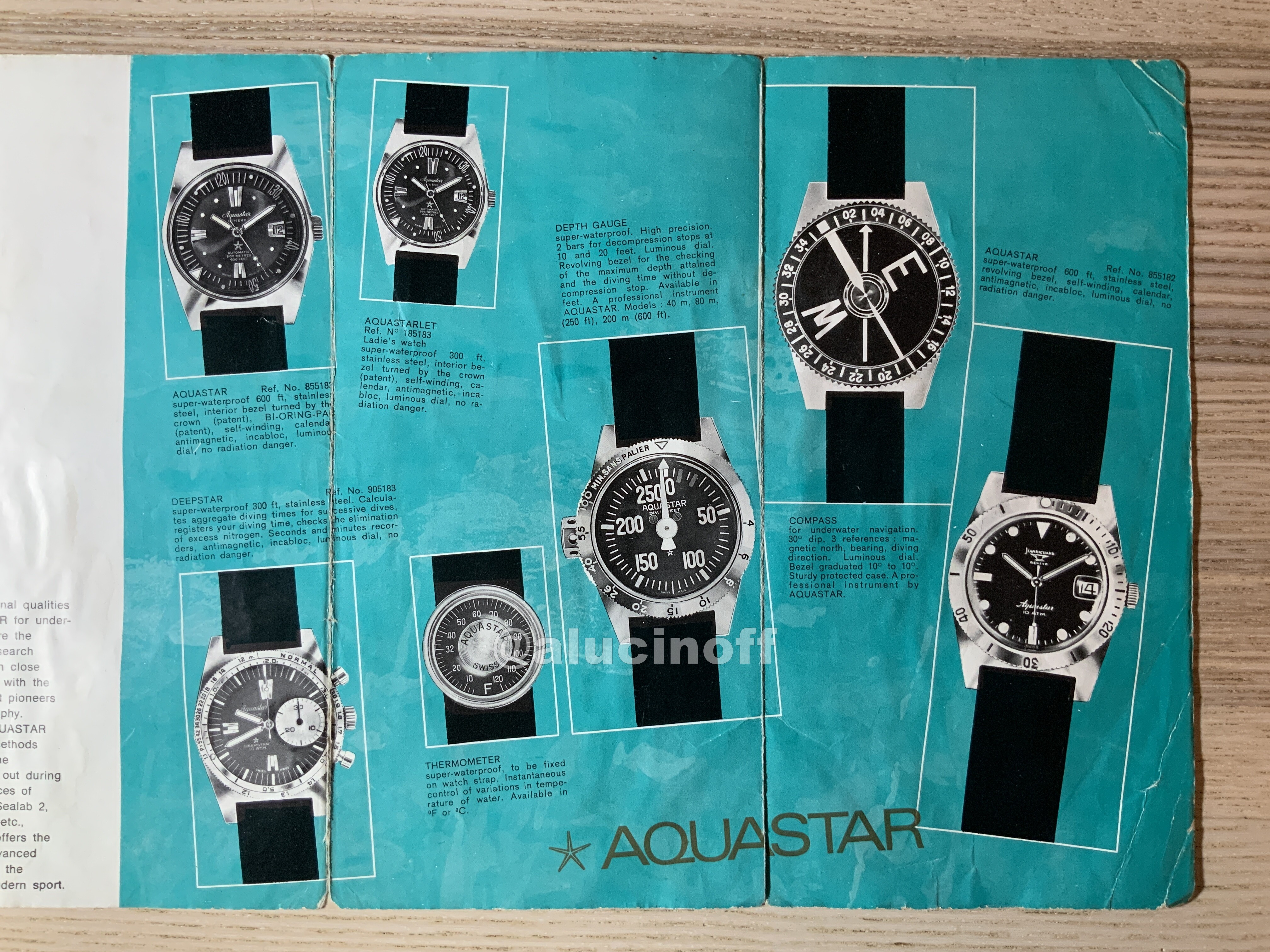 A través de un anuncio inocente y mal fotografiado, en el que se vendía un único reloj, acabé comprando varias unidades del modelo 63 de Aquastar en sus tres versiones, acero, chapado en oro, y de señora.