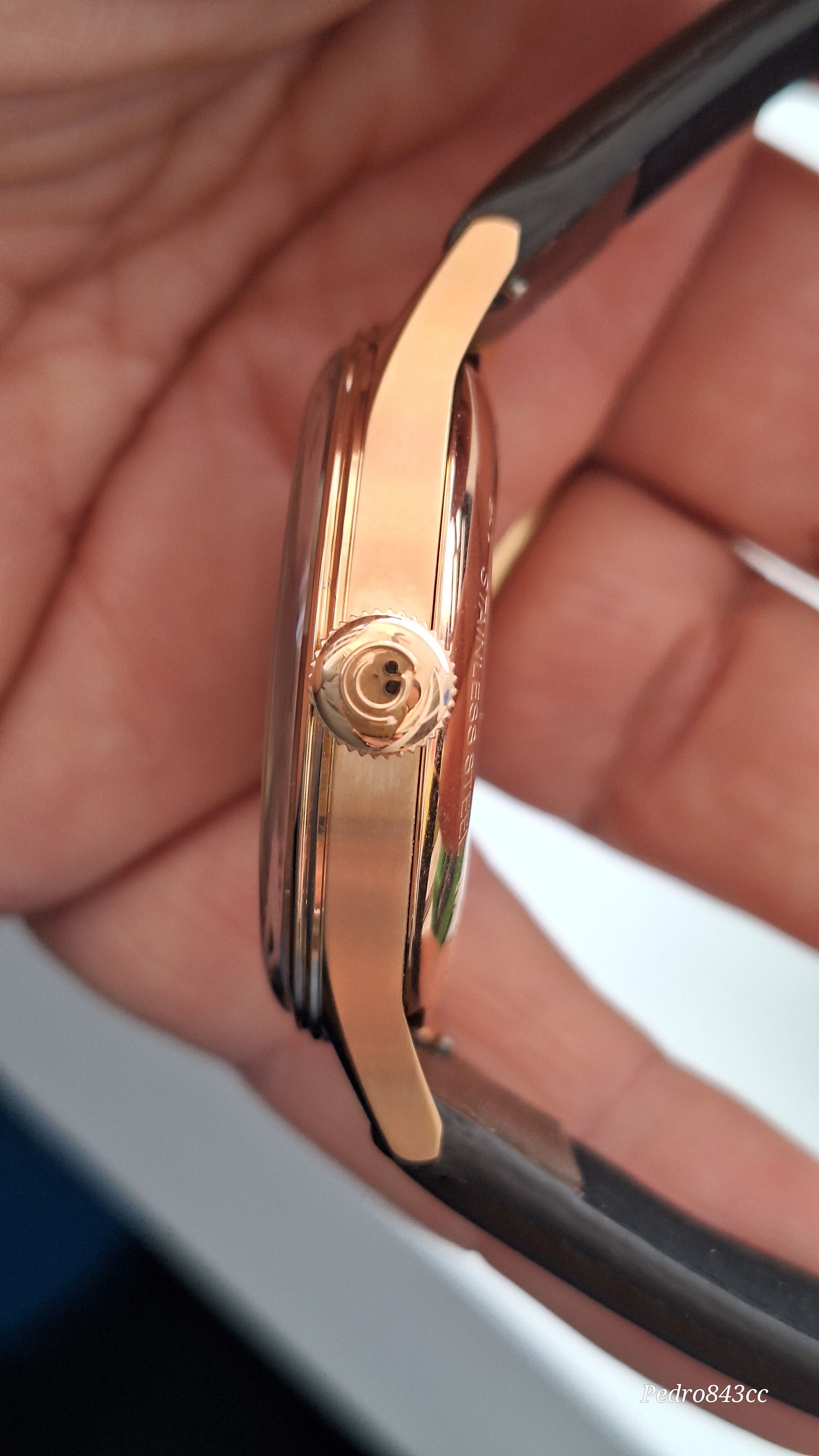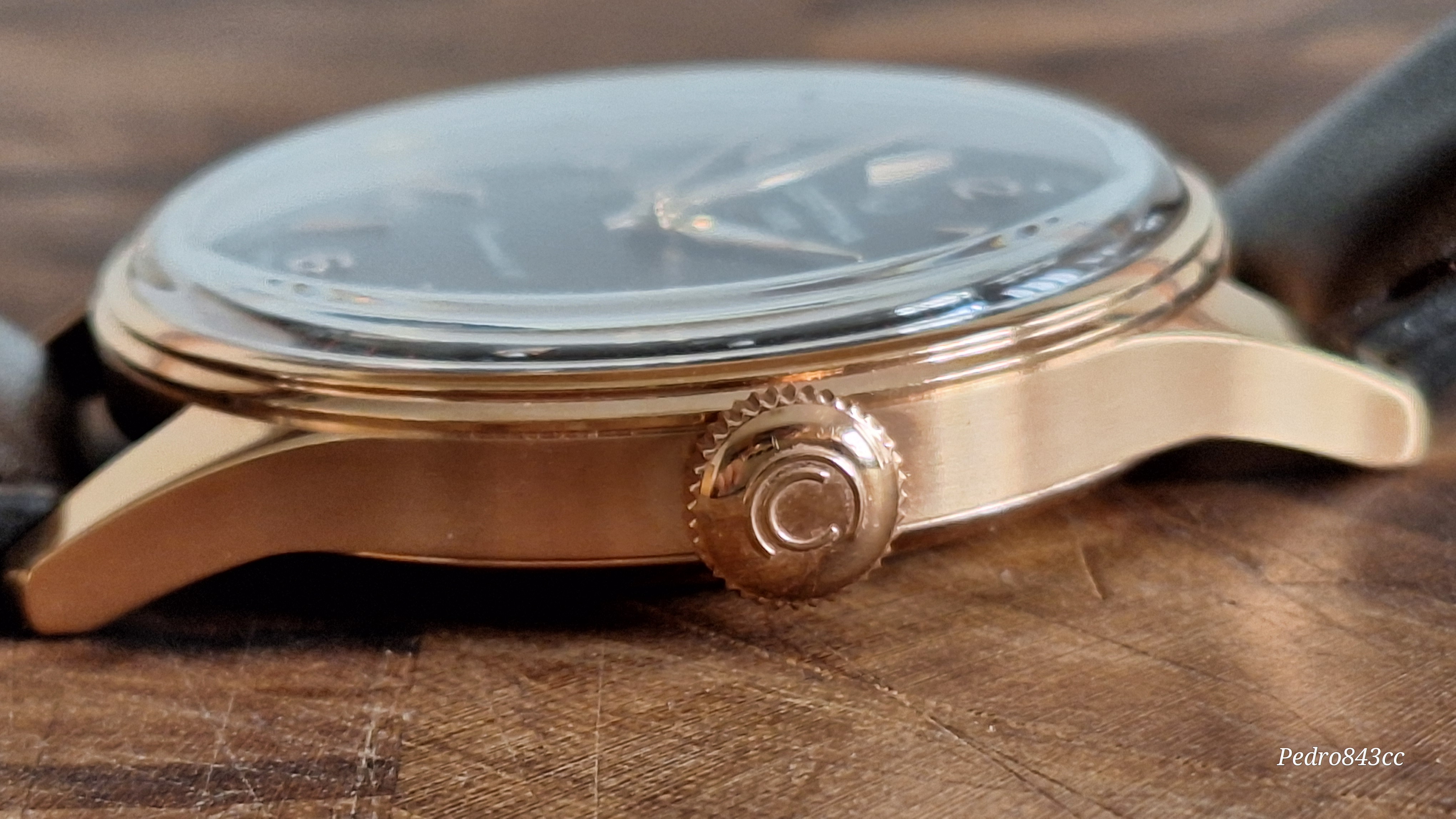El acabado PVD se ve bien hecho, con un color dorado cobrizo muy elegante. La correa, algo rígida, pero como @fus ya me advirtió, se va amoldando a la muñeca sin gran esfuerzo.