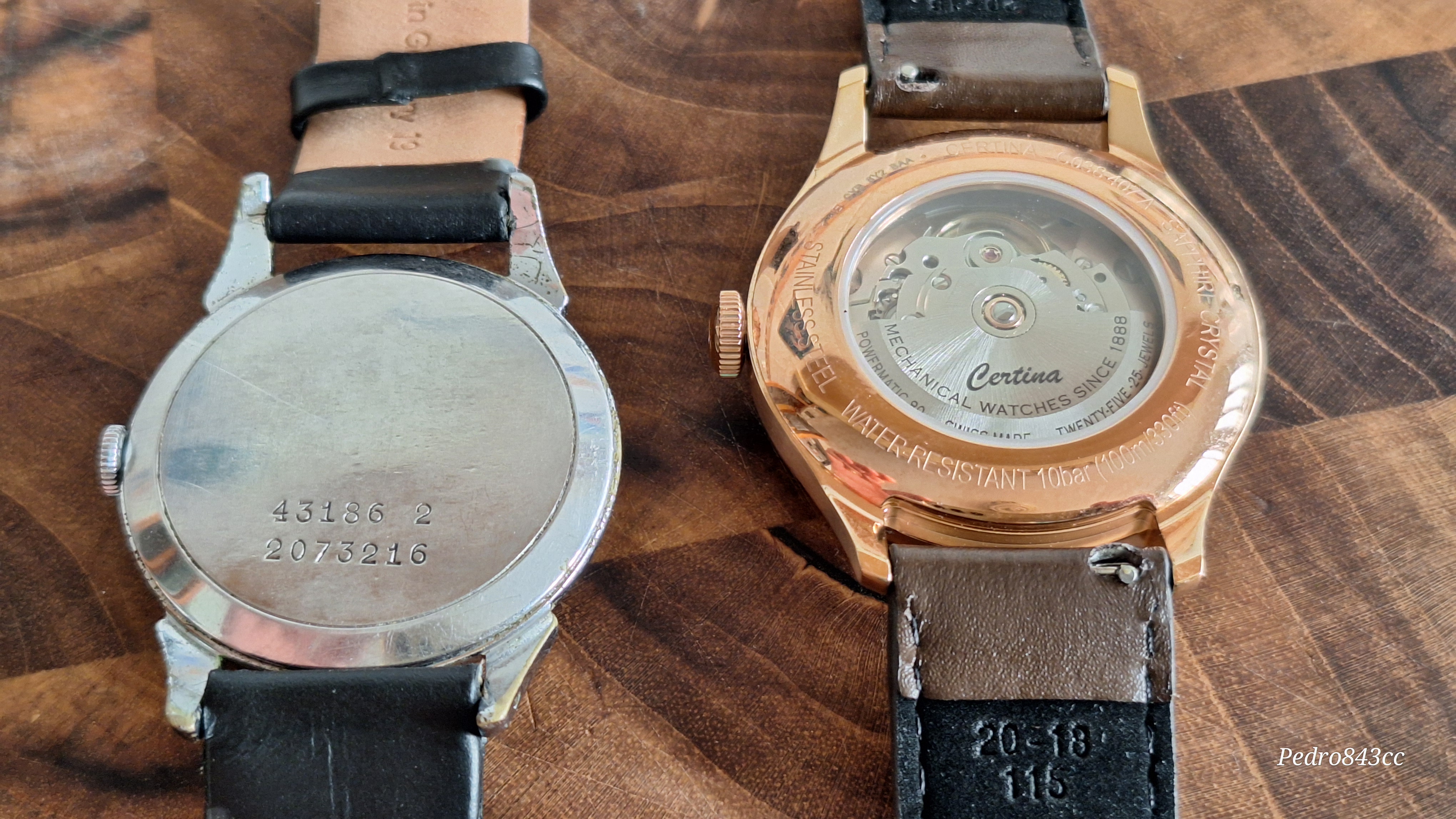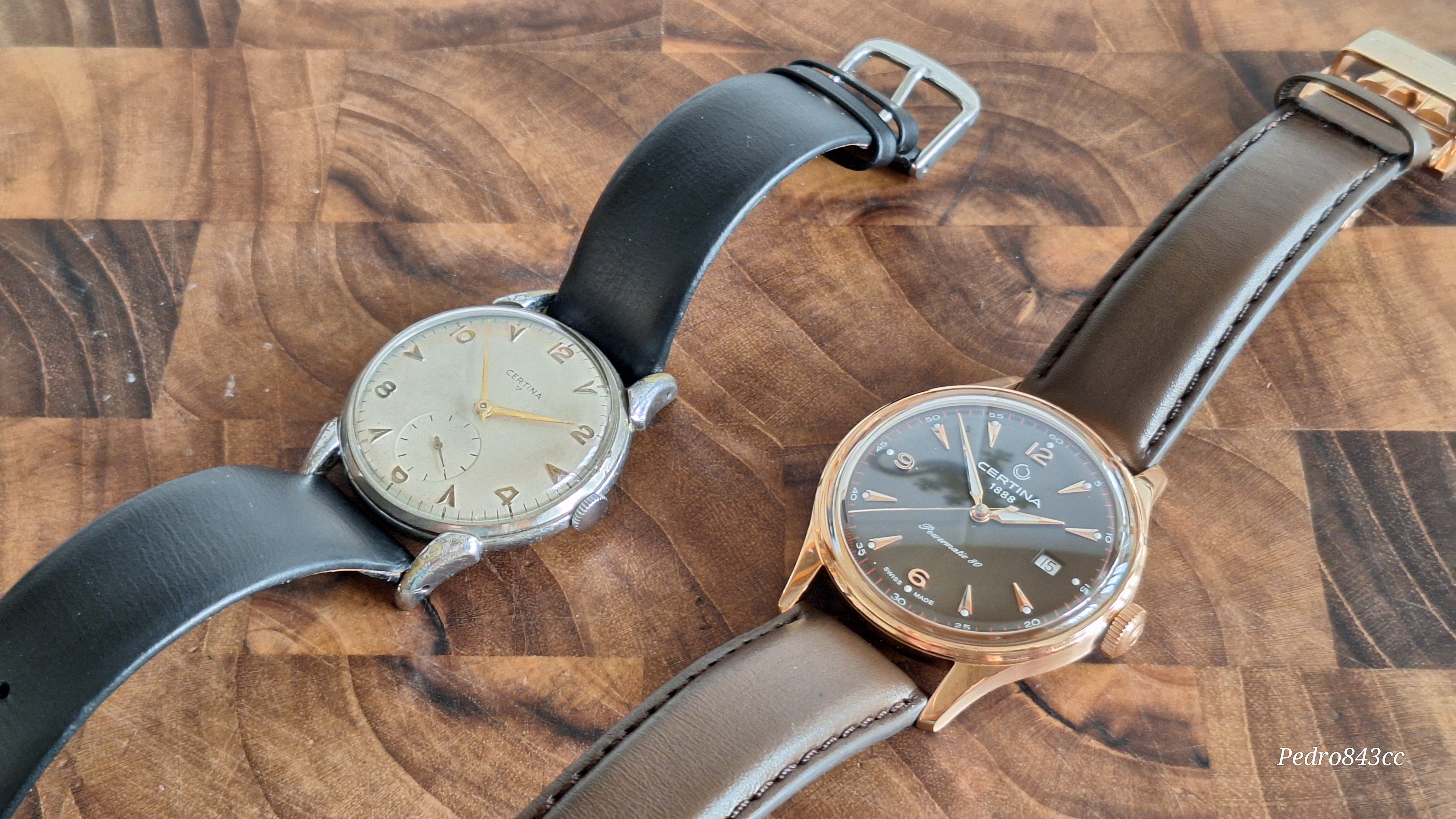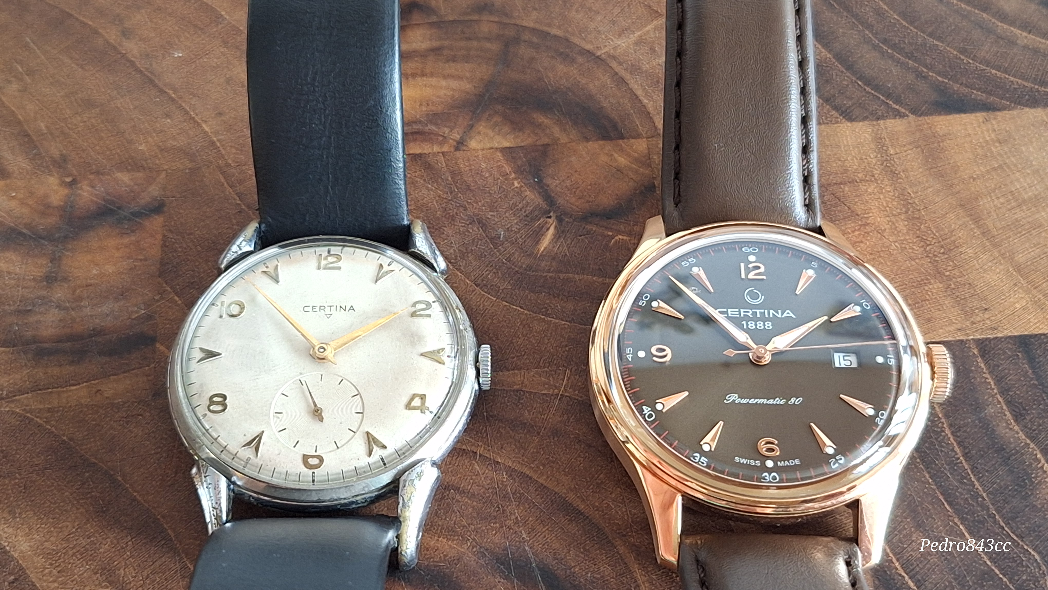 Aqui, junto a su “abuelo”, un bonito Certina de mi colección, con la particularidad del triangulo invertido en la esfera. Diferentes, pero con el mismo ADN.