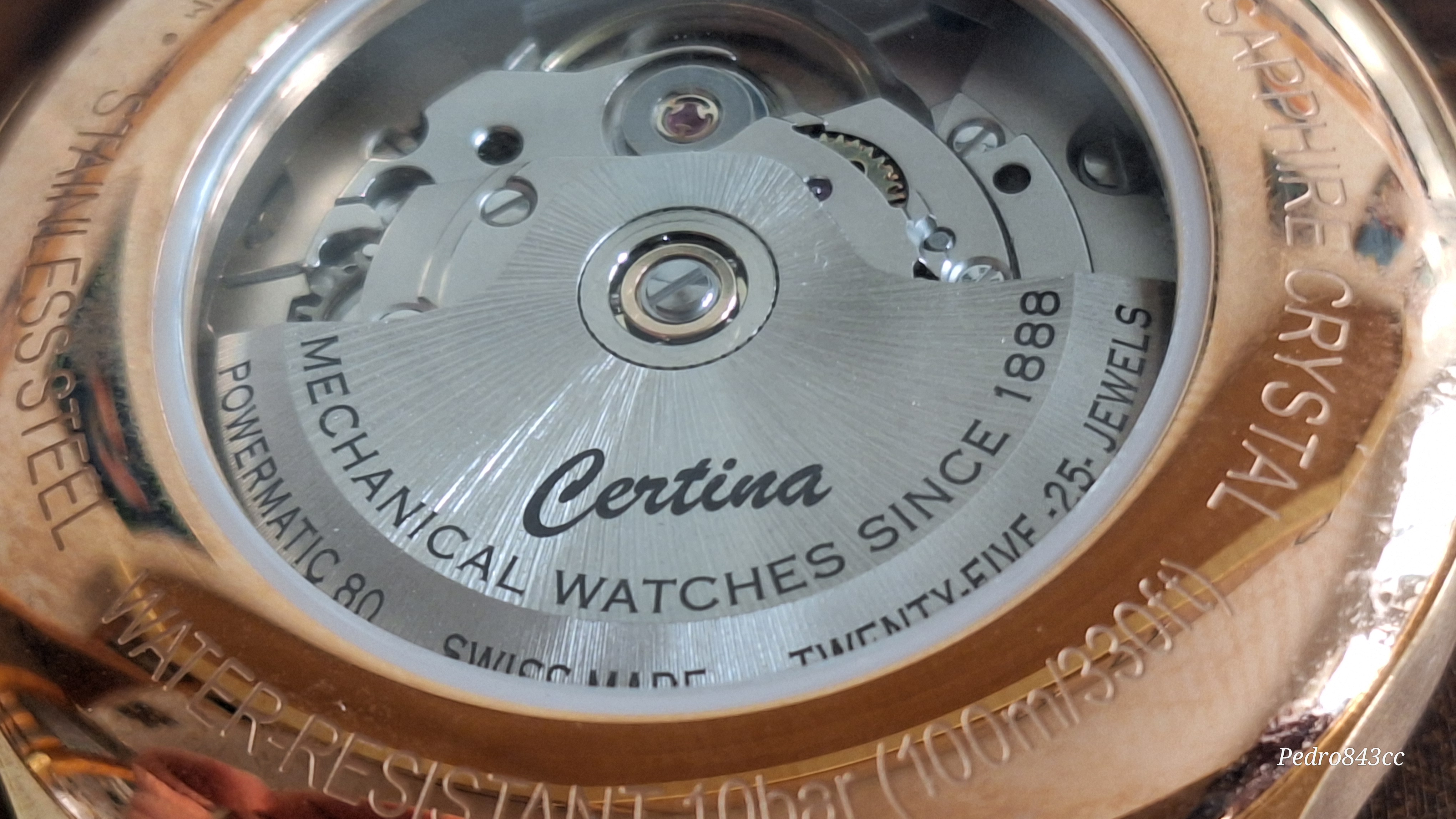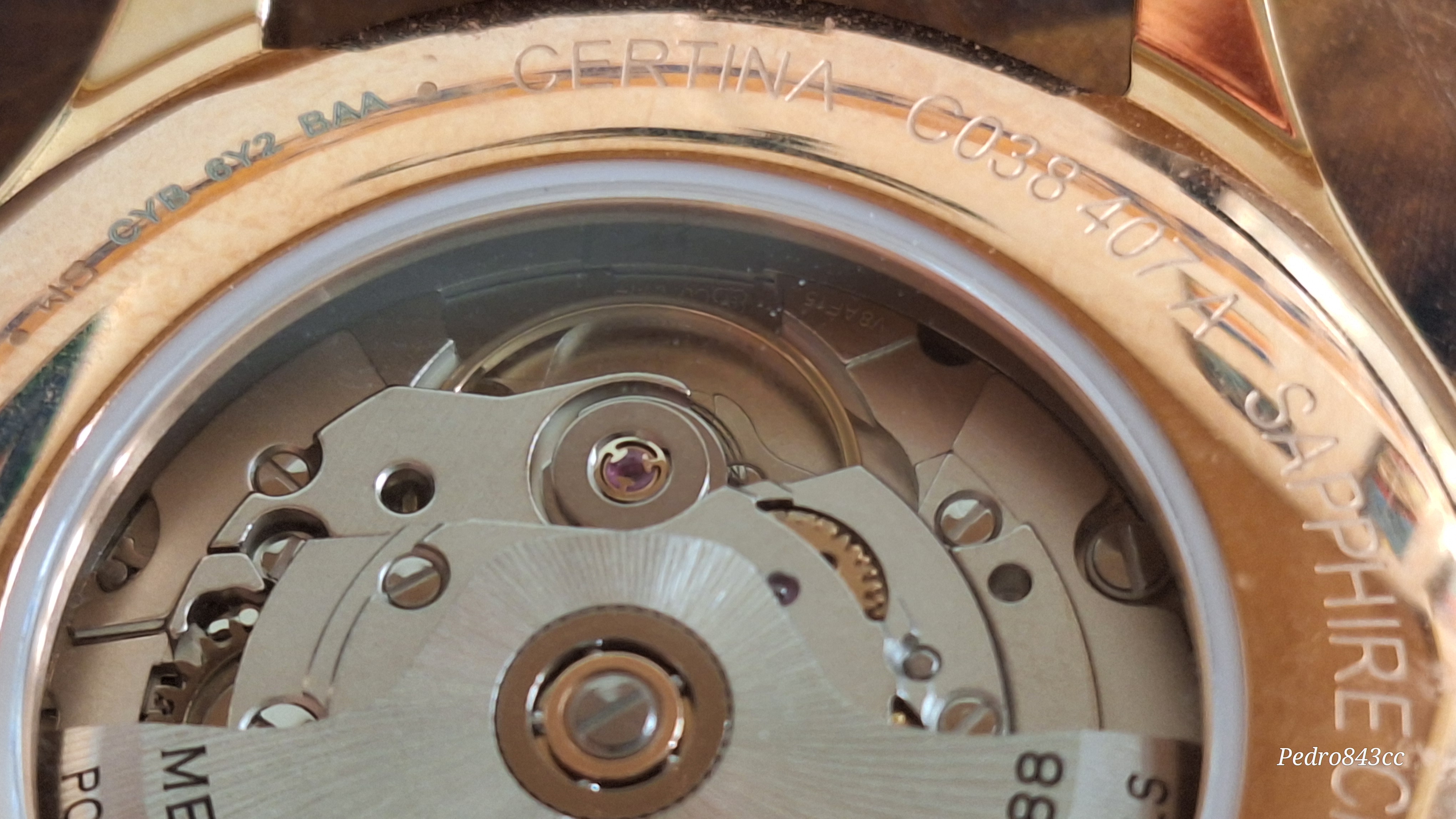 La trasera, a la altura, mostrando su calibre (ojalá fuese un KF, pero es un Powermatic 80 acabado C07.611, con escape metálico, que tanta polémica ha levantado, pero que a la vez ha demostrado un comportamiento estupendo en cuanto a reserva de marcha, fiabilidad y estabilidad de funcionamiento.