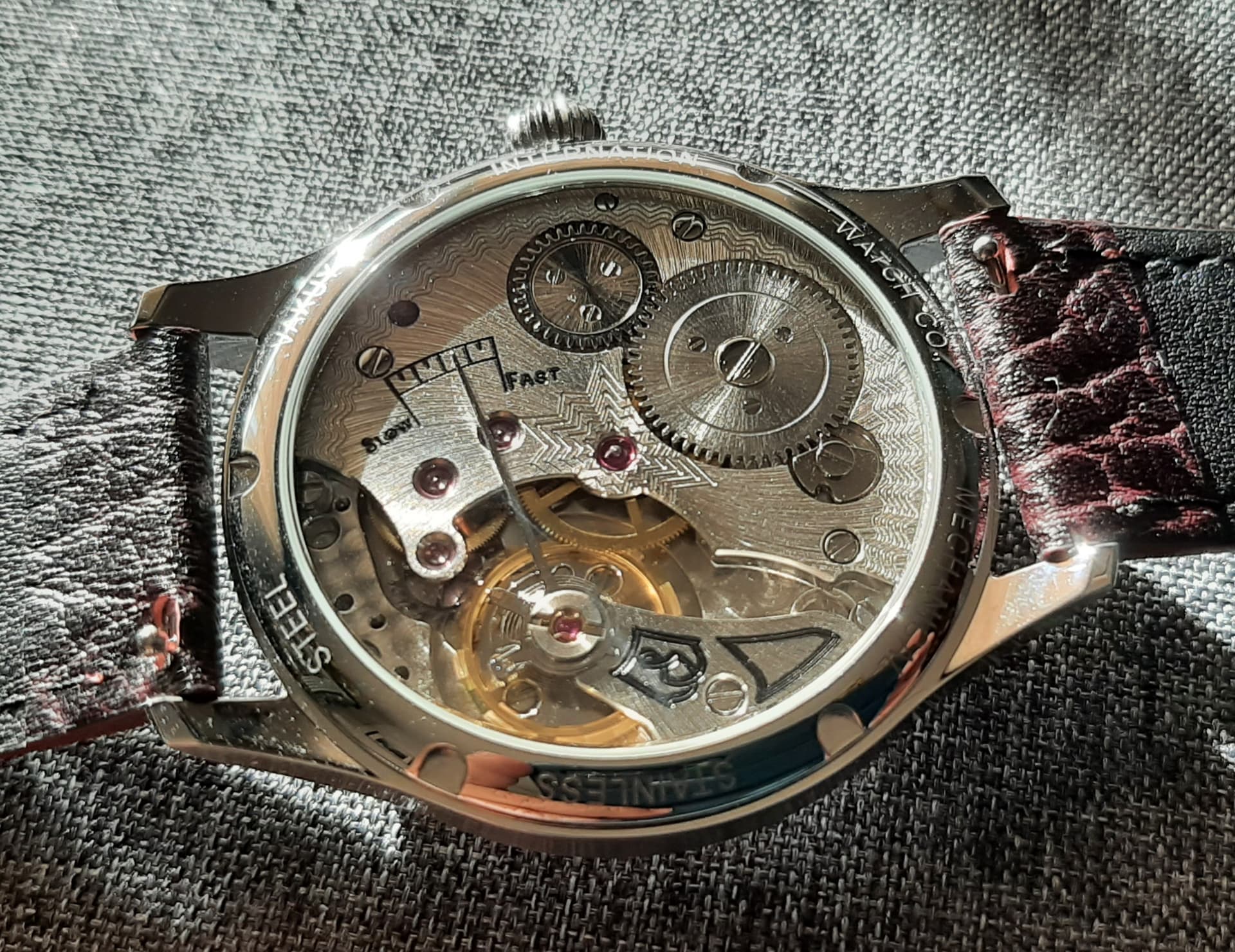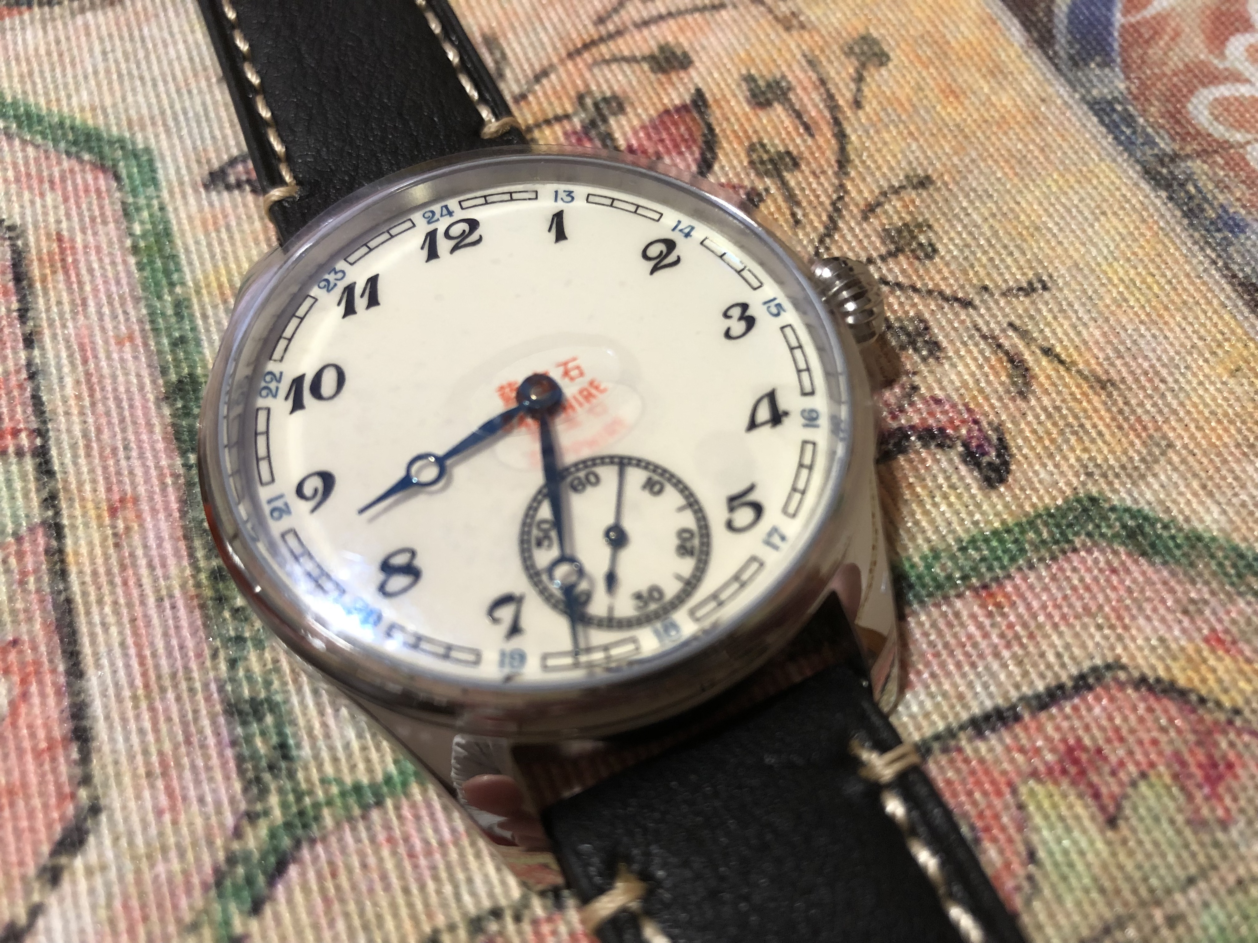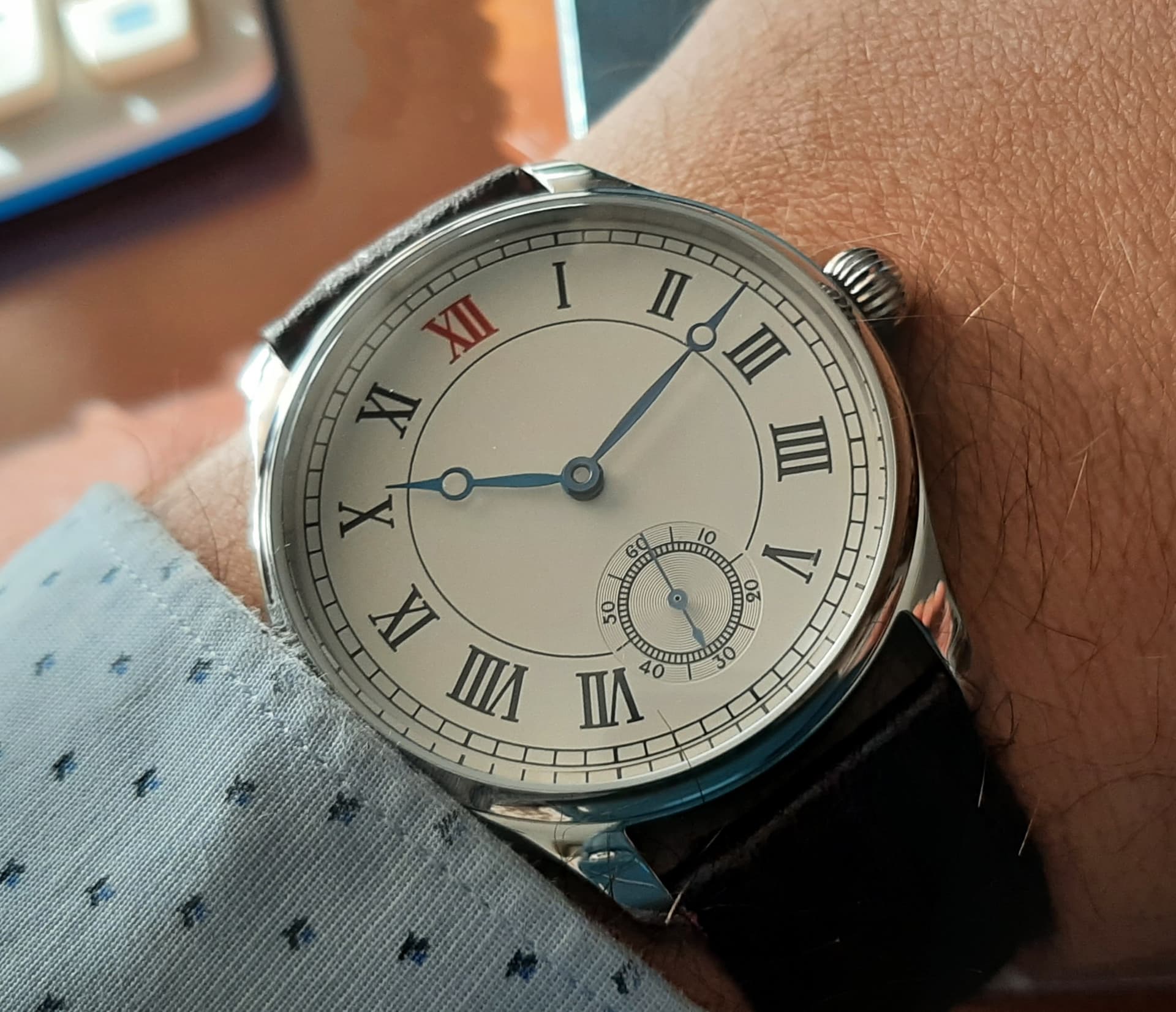 Calza correas de 22 (la suya ya está en la basura, traía la tradicional correa pseudo cocodrilo plasticosa), y equipa un fiable y bonito calibre Seagull ST3621.