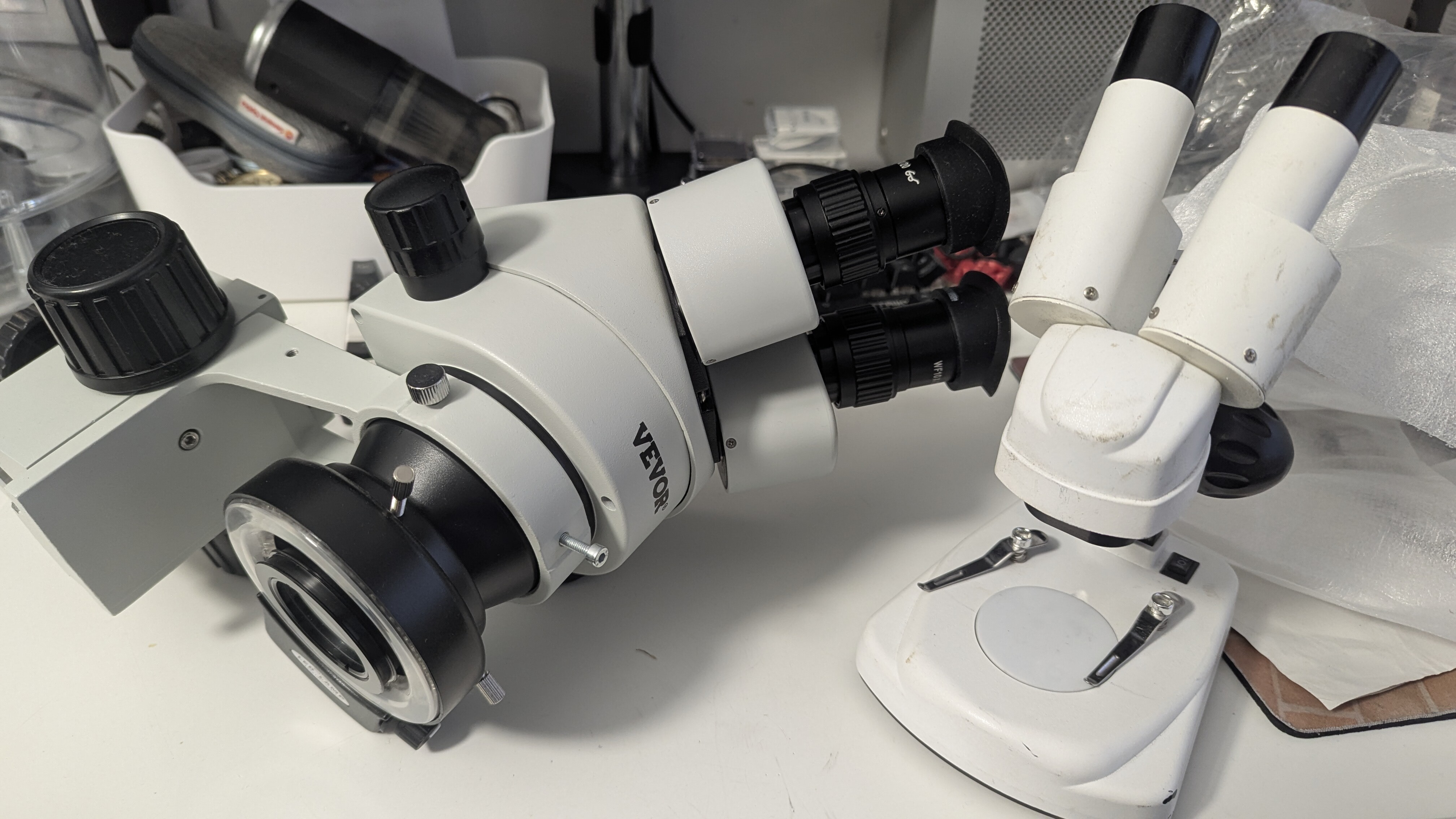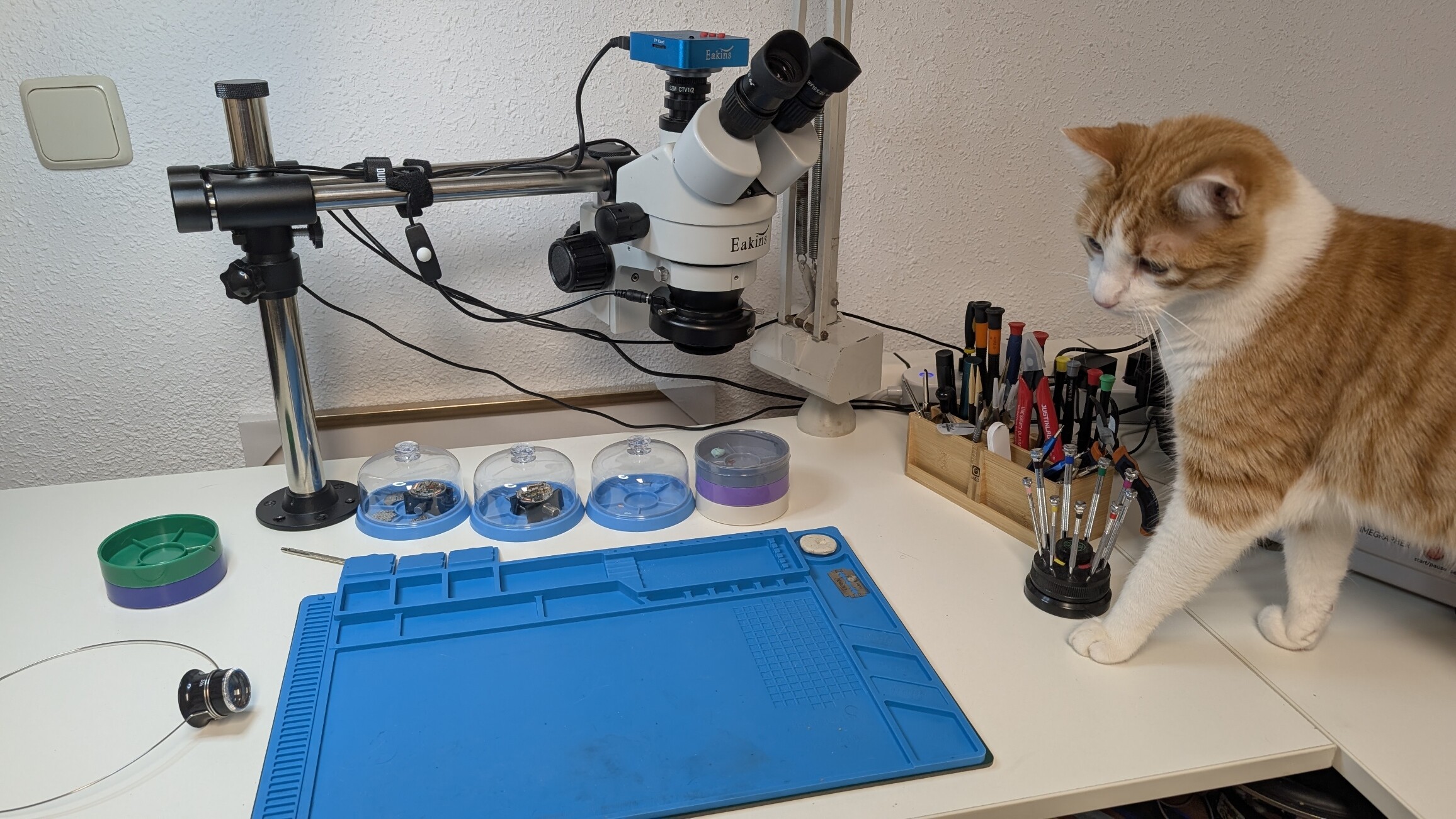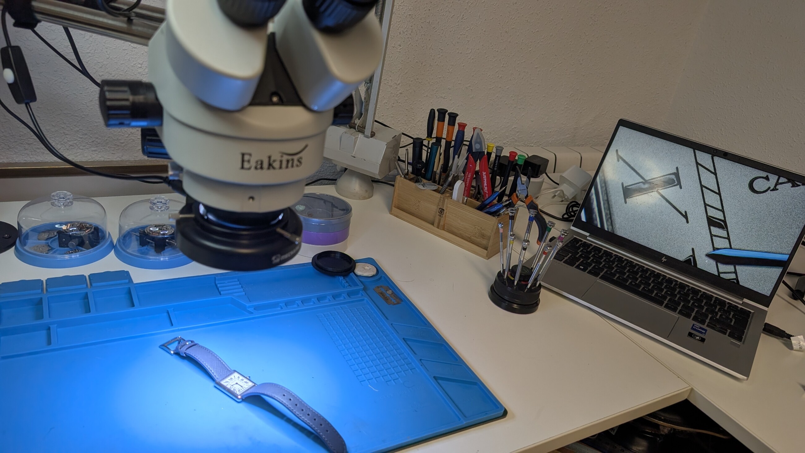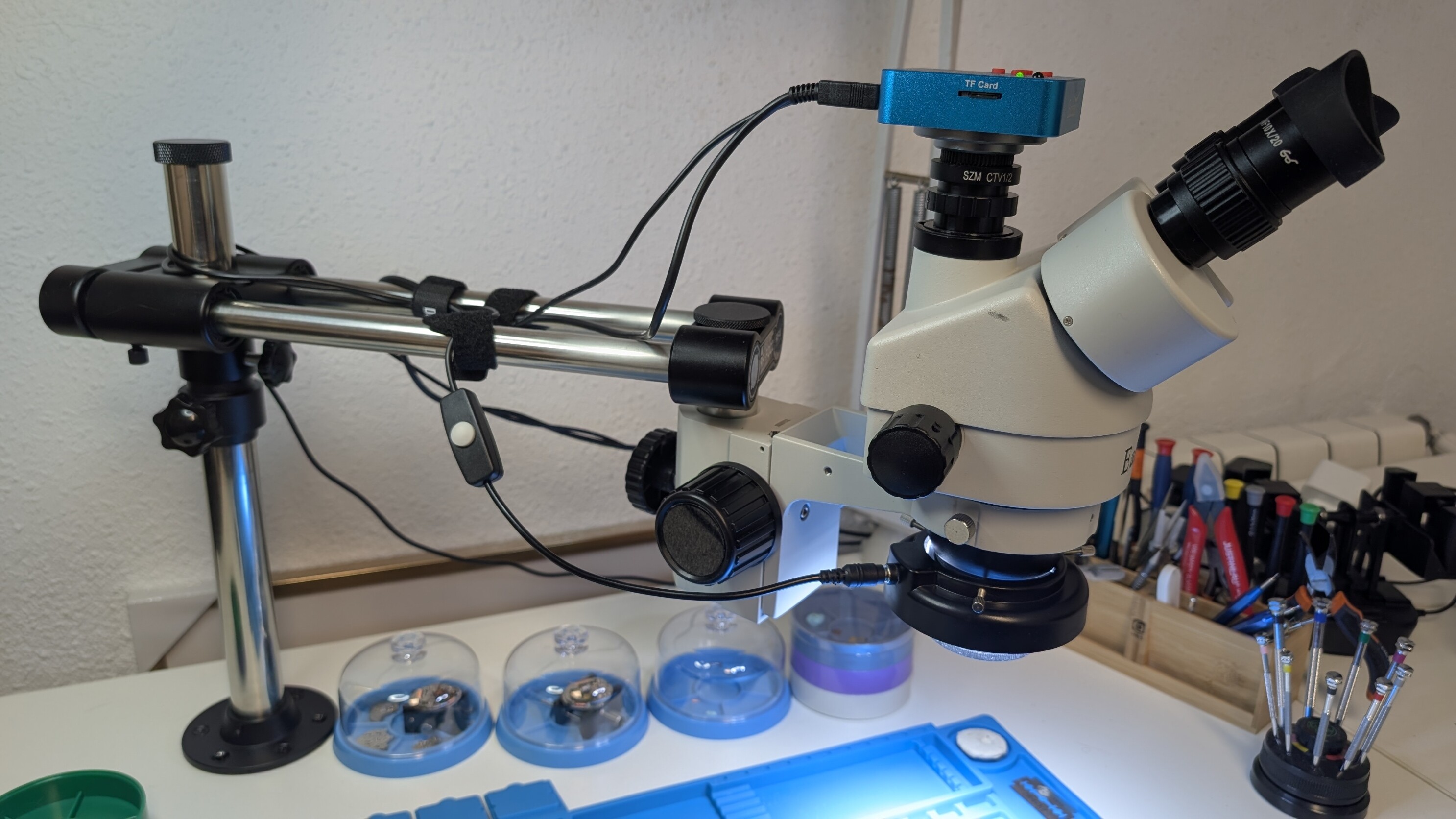 Probé inicialmente un microscopio de cámara digital con pantallita, pero me resultó incomodísimo. La imagen que generan estos microscopios está bien siempre y cuando se trabaje en un plano, como sucede con las reparaciones de placas electrónicas. Pero para algo más “corpóreo” como un reloj o un calibre, no se ve bien, y además el espacio de trabajo entre el microscopio y la mesa no es el adecuado.