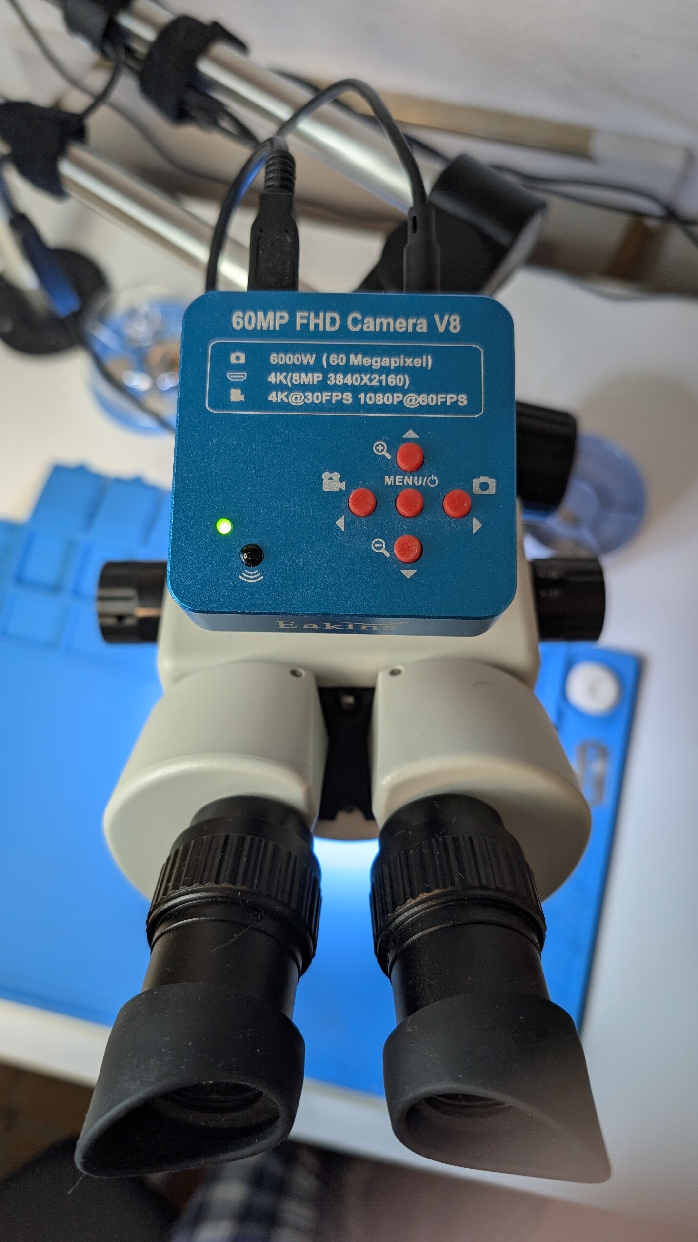 Y entonces, lo de trinocular qué narices es? Sencillo, un microscopio trinocular es como un binocular estereoscópico pero con un tercer “ocular” en la parte superior para acoplarle una cámara. Si, había dicho antes que los mircroscopios con cámara no eran buenos. Pero esto es un complemento. Se trabaja con el óptico, no con la cámara, y cuando quieres capturar imagen, o video, pulsas el botoncito, y se hace la magia!