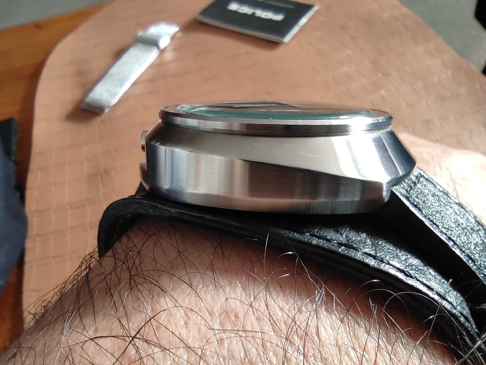 el reloj está hecho en acero inoxidable y tiene una caja muy masiva que con la bund lo hace aún más voluminoso ,tiene una medida de casi 44 mm,y en la parte más gruesa casi 15 mm :Ahora unas fotillos del reloj puesto y del detalle del grosor y de los pulsadores: