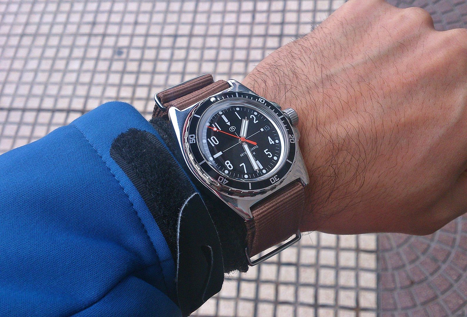 Hoy iba dispuesto a cambiarle la correa por una de caucho, pero he visto una nato marrón de su medida, y como había visto este modelo en la tienda con esa combinación y me gustaba mucho, pues se la he probado hoy todo el día, y la verdad es que me encanta…:beauty: