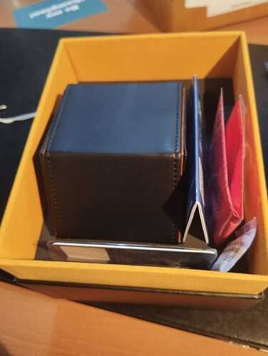 Dentro de la caja tenemos un portarreloj hexagonal de cuero muy bonito, una tarjeta de garantía sin sellar, un folleto de instrucciones y una gamuza roja sin marca.