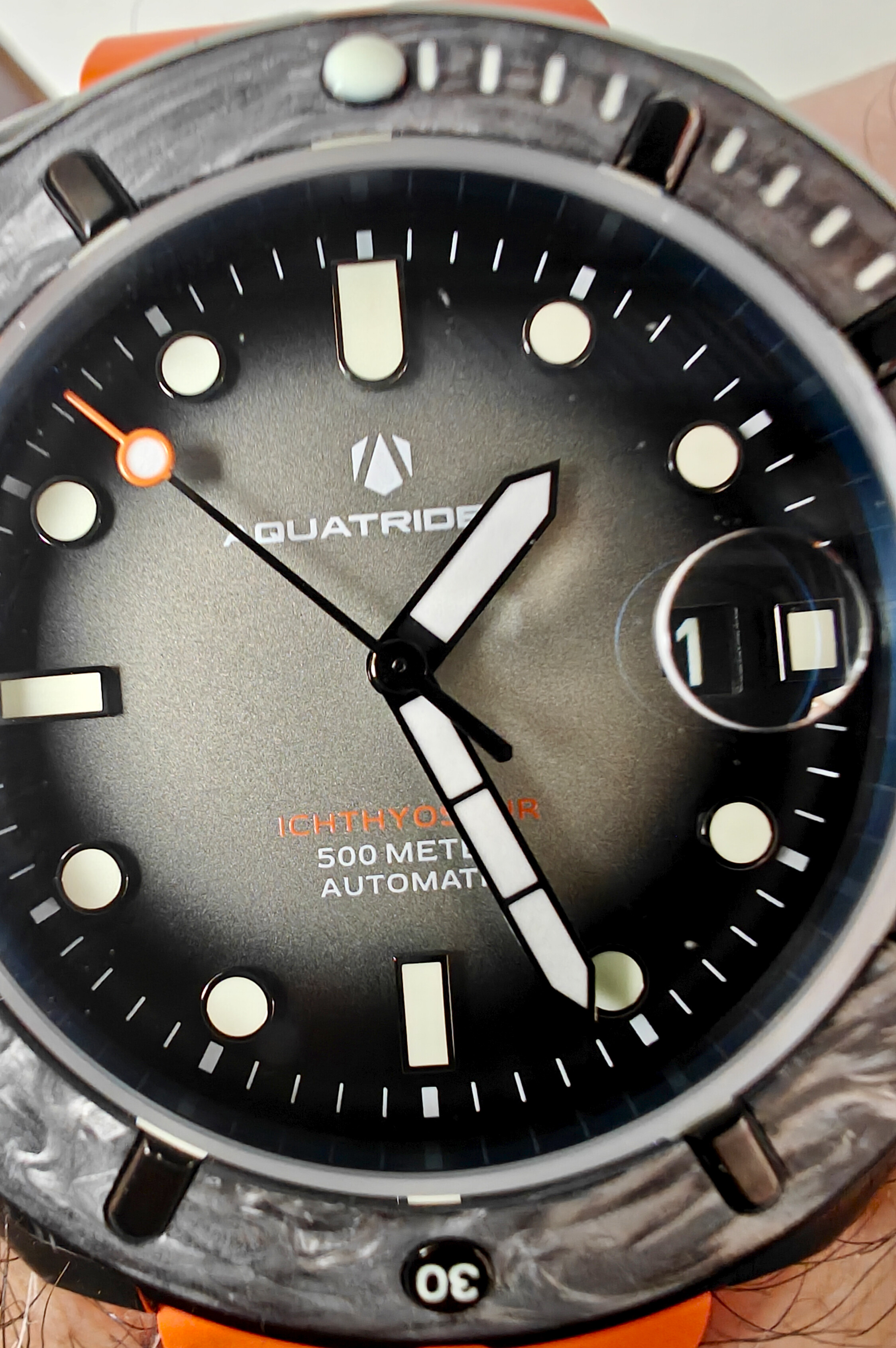 El inserto es de fibra de carbono, el cristal de zafiro con lupa, bastante discreta (el fechador es pequeño y con fondo negro, que se ve poco), el movimiento NH35 (es un reloj de 250€, no se puede pedir más) . El seguro de la corona es estilo Panerai, con diseño propio, moderno y bonito. El reloj es de 500 m y tiene válvula de helio en el lado izquierdo. La tapa es ciega con un ictiosaurio, no está mal. La correa es de goma y tiene una hebilla grande, decorada con el logo de la casa, una A. La caja es gruesa, unos 14 mm, pero queda equlibrada por su gran diámetro, y la verdad es que pesa un egg y medio.
