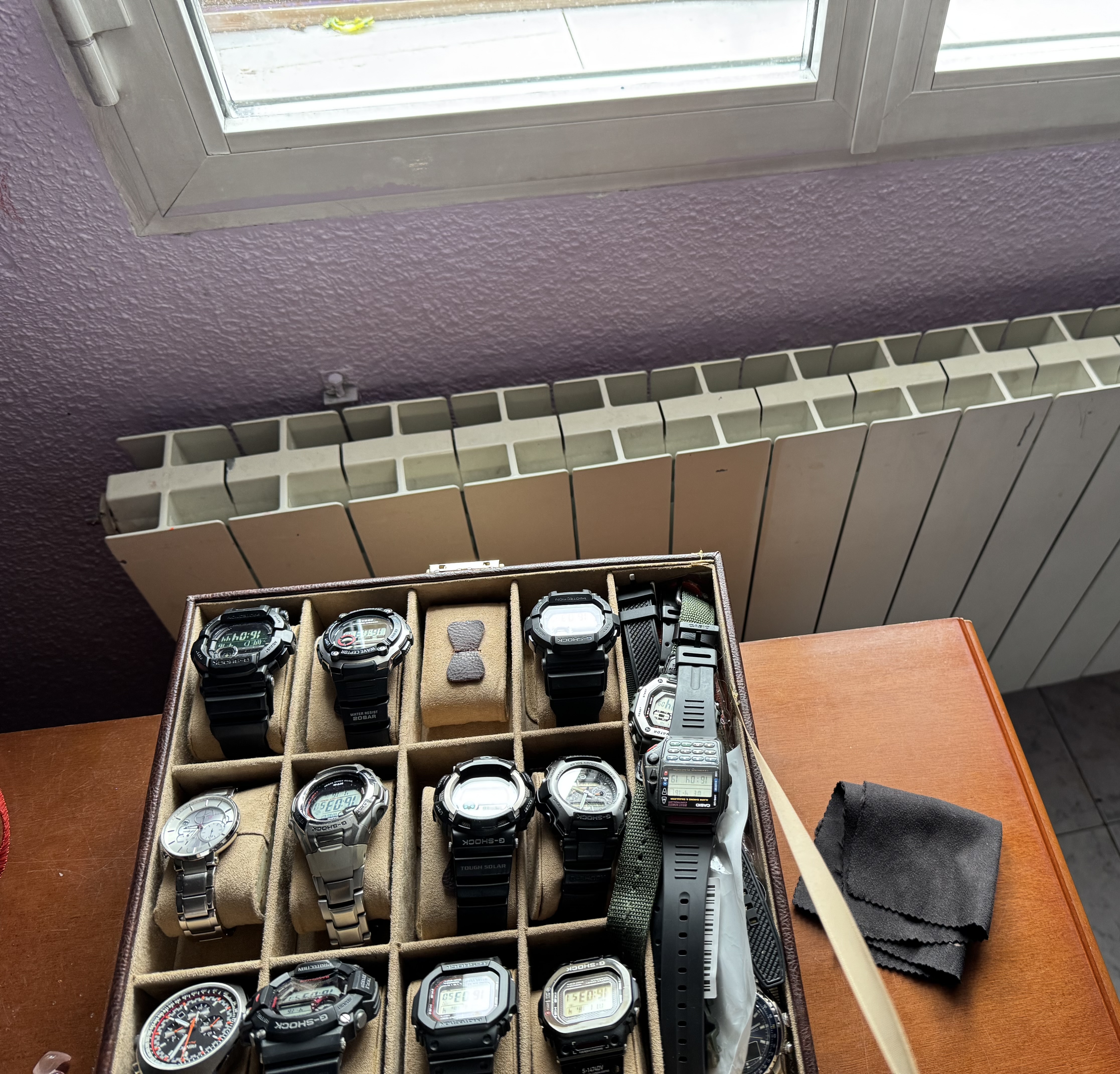 Muchísimas gracias por el aviso, bien informado. Pues si te soy sincero, si se tenían que morir, ya estarán muertos. Te comento, el MTG lleva años viviendo ahí, fácil unos 10 calculo, y solo sale cuando me lo pongo; el Arnie lleva 3 años; el Citizen eco-drive parecido y el último que entró, el RSWC, cuando lo recibimos. Cierto es que por la orientación de la ventana, nunca reciben directamente la luz solar y encima, mi “huerta” solar para mis relojes está próxima a la desaparición, nos obligan a quitar las contraventanas al instalar bufanda al edificio. Ahora empezarán las movidas en casa para ver donde los dejo que tengan luz todo el día. Foto de la huerta: