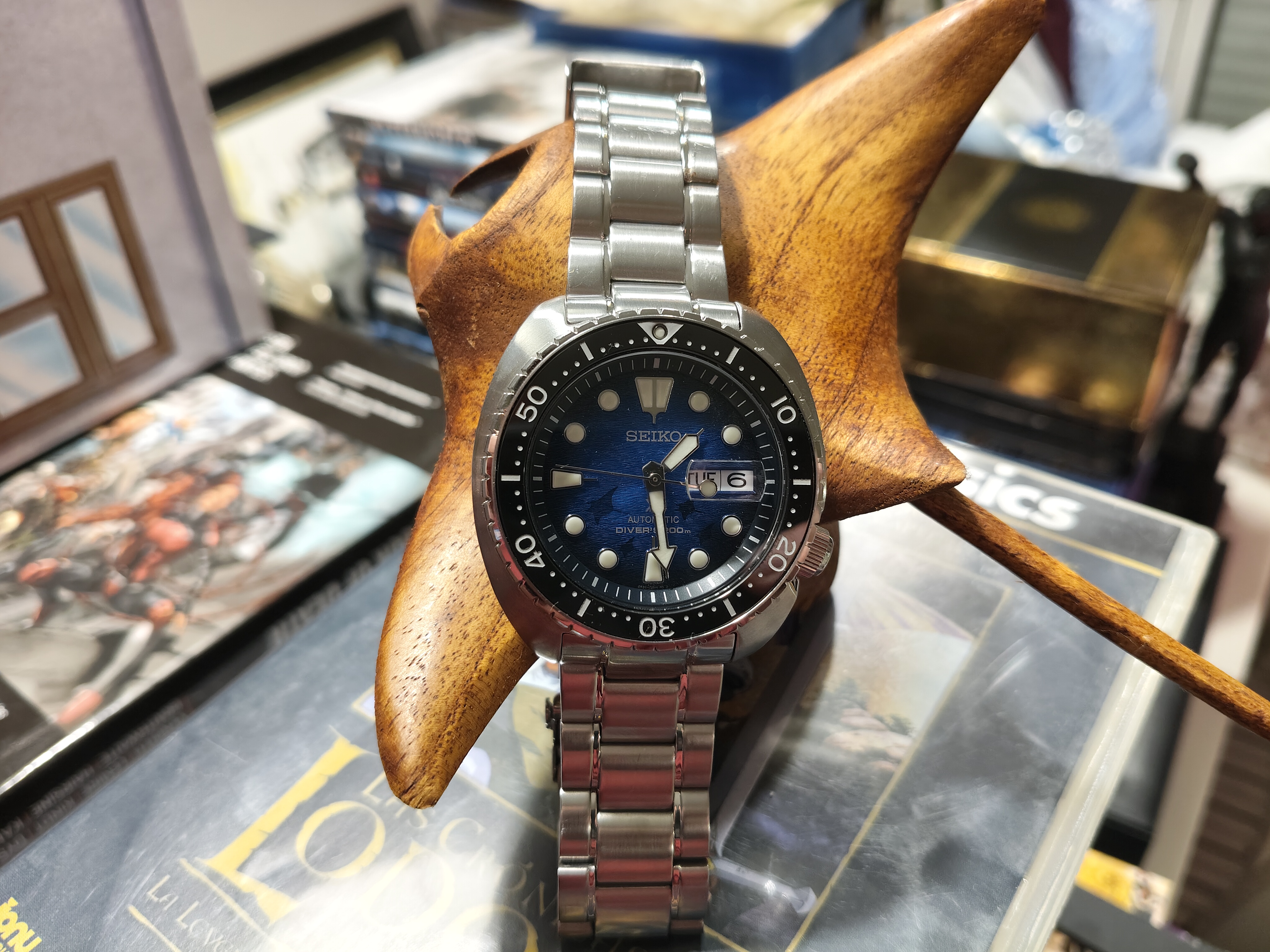 Pues ateniéndome a lo que ya he comentado, y aún cuando mi vertiente purista respecto a esta afición se ha apaciguado mucho, para mí el Tortuga es con dial y bisel negro, lo más fiel posible al 6309. Más allá de eso, emo, el Tortuga ha tenido y tiene tantas versiones que es complicado recomendar una, y responderá a gustos personales, en mi caso junto con la versión ya mencionada me gusta algún Save the Ocean, concretamente el Manta Raya (si Seiko no hubiese incorporada la sombra de dicho animal en el dial seguramente tendría ese reloj en la caja) y sobretodo el White Shark