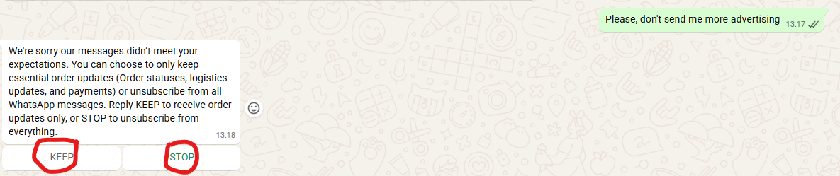 Enseguida me respondieron que podía bloquearlo todo o sólo recibir actualizaciones de mis pedidos.