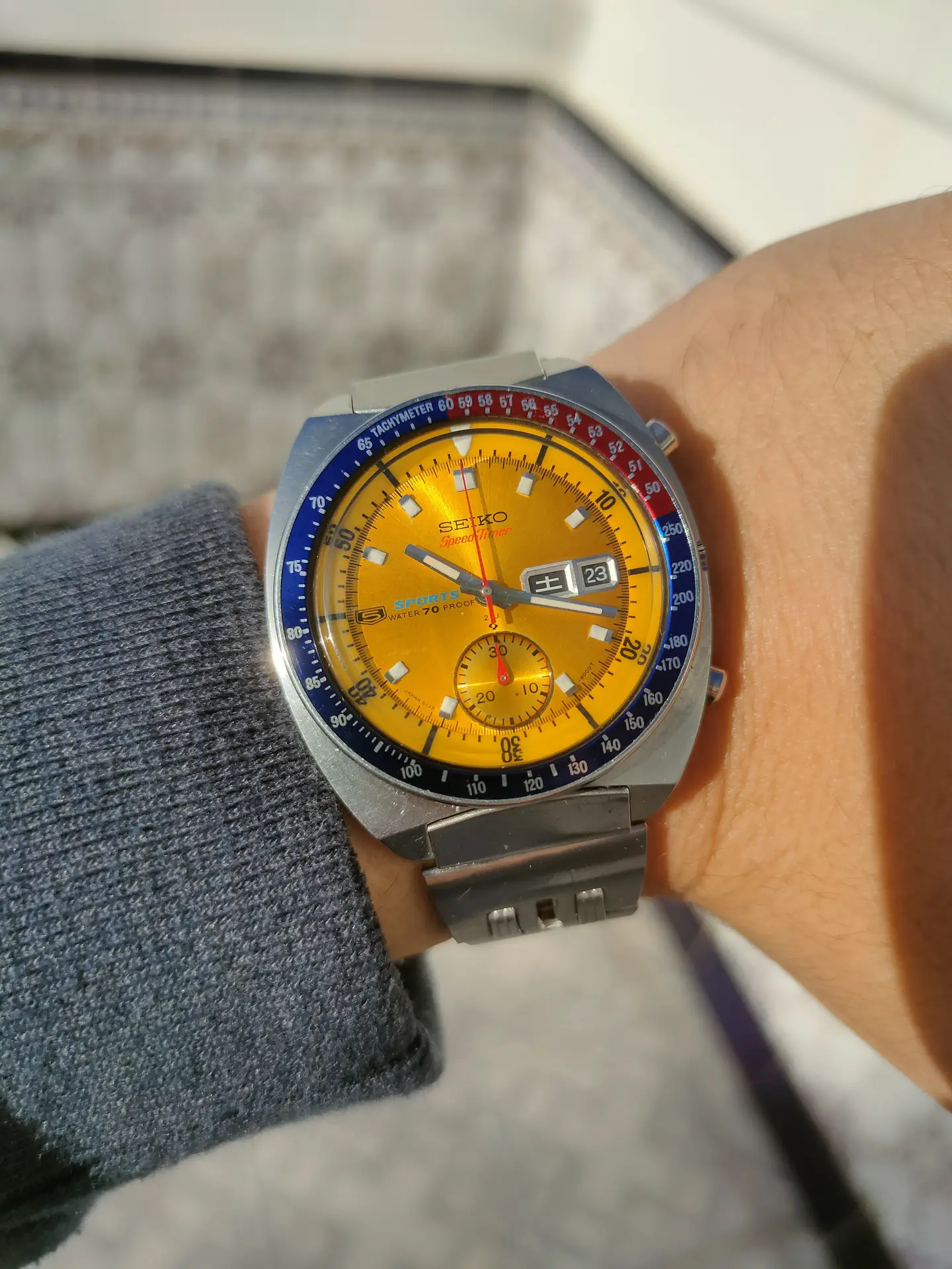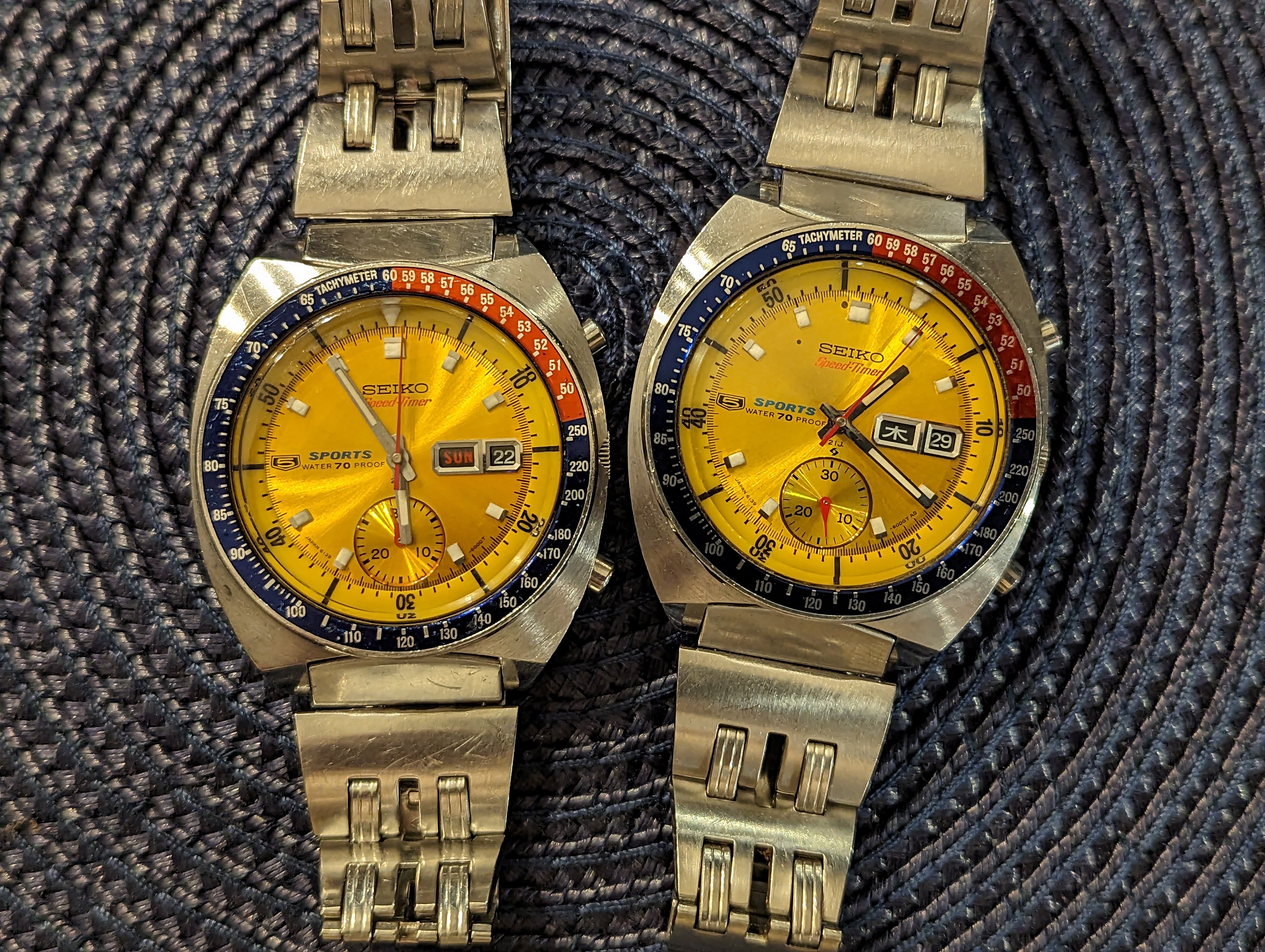 Aquí os paso una foto en la que se ven las diferencias que os comento entre dos unidades del 69. Curiosamente, la unidad antigua también es de mayo del 69, como la mia, y esa si conserva los números antiguos y el dial marcado como T-AD (cosas de Seiko y los popurrí que hacía entonces).