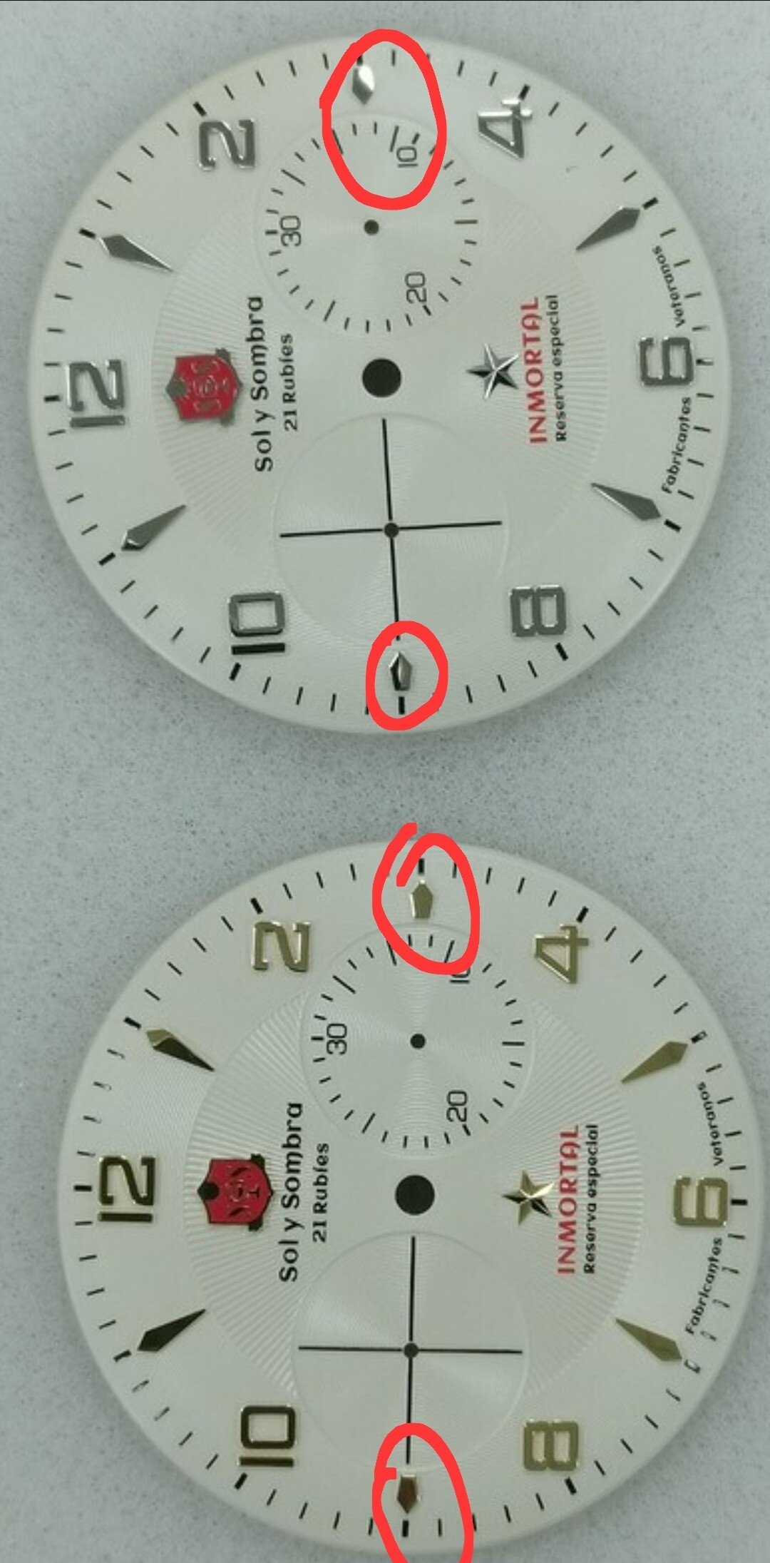 También parece que sea un poco distinto el color en la foto de los diales más plateado arriba y más color marfil debajo (?)