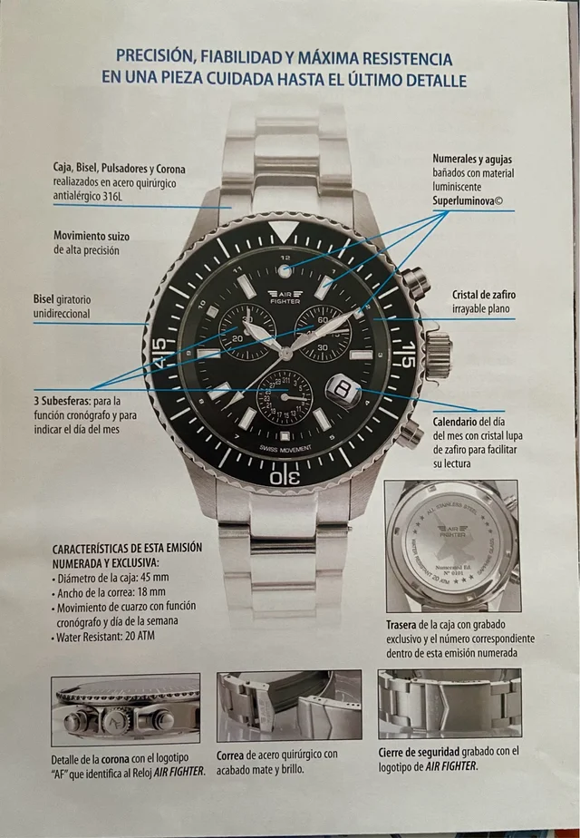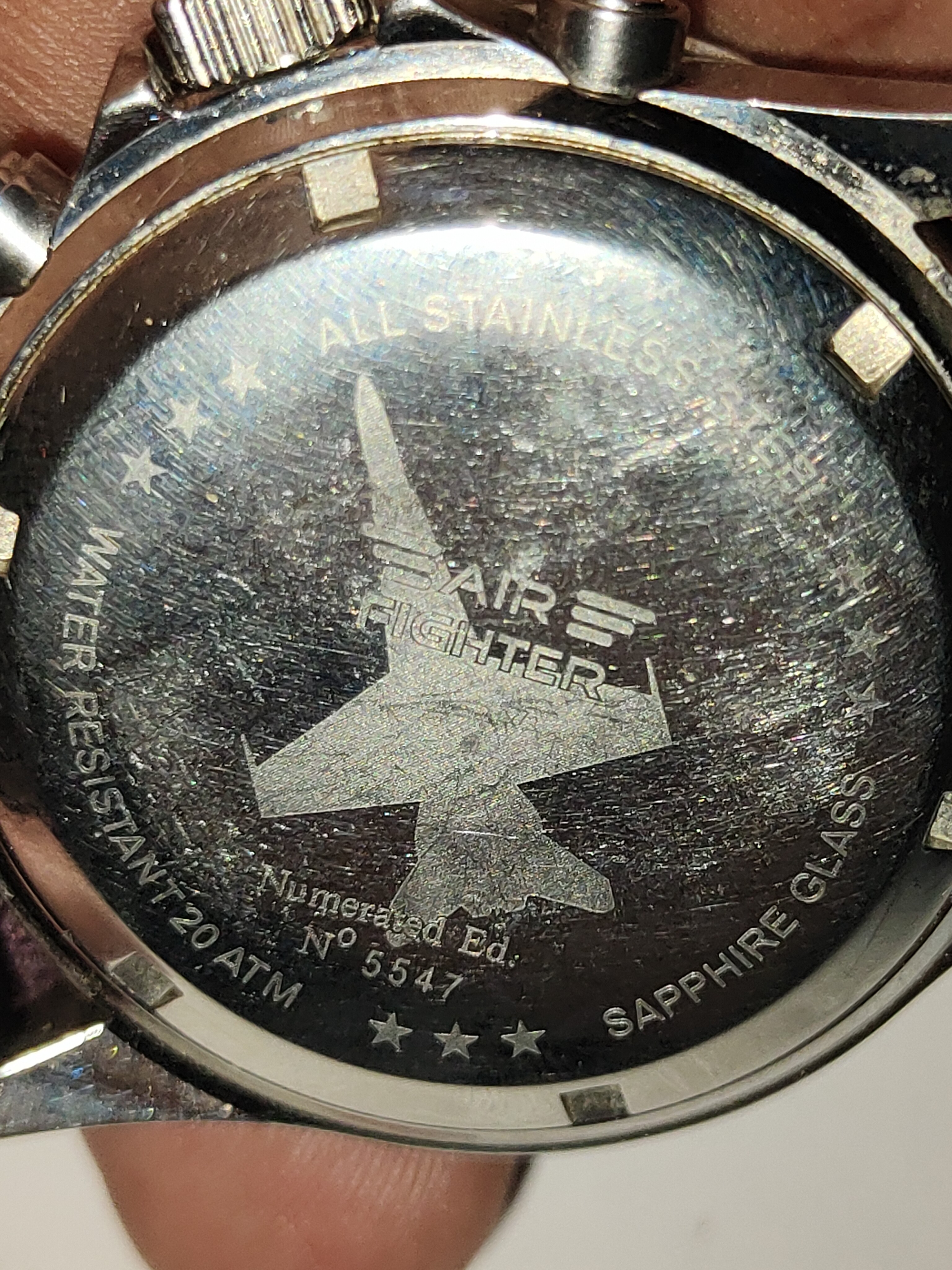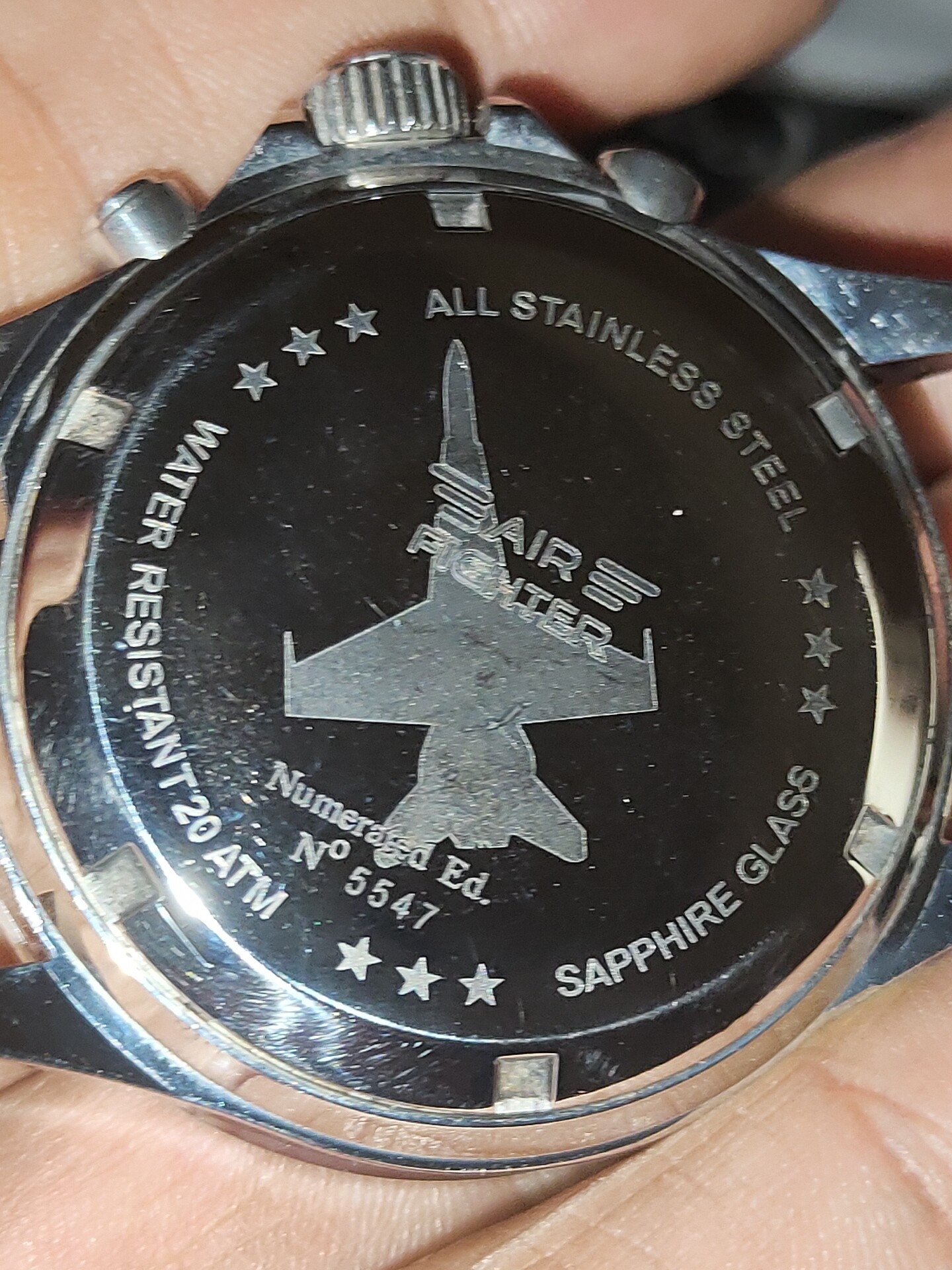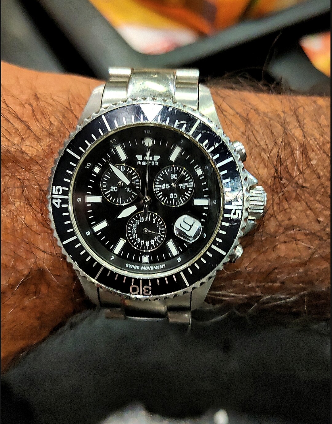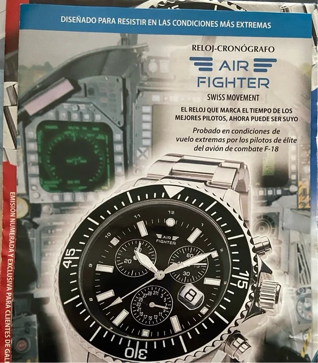 Después me ha dado por ir a visualizar lo que había en Cash Converter y je acabado por hacerme con este “Air Fighter”. Un Crono suizo con calendario doble (cosa que no entiendo).