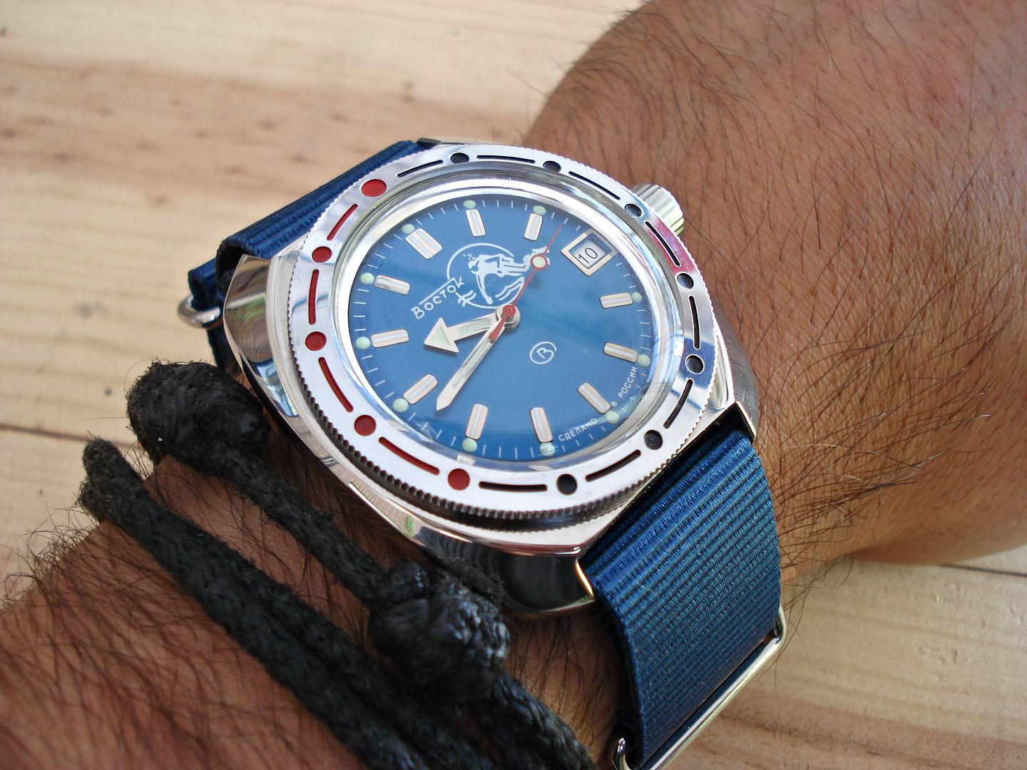 El que has puesto con el dial que incluye un submarino pequeño bajo la estrella roja, es el primero que me compré… (ya tengo 6 Boctok o Vostok, de todos). En mi opinión el que te comento (el del submarino) es muy bonito a la vista y en lo que me lo he puesto va de cine. La pena, el armis…, que es un poco “espartano”. Pero como reloj, a mi gusto de lo más bonito dentro de los Komandirskie.