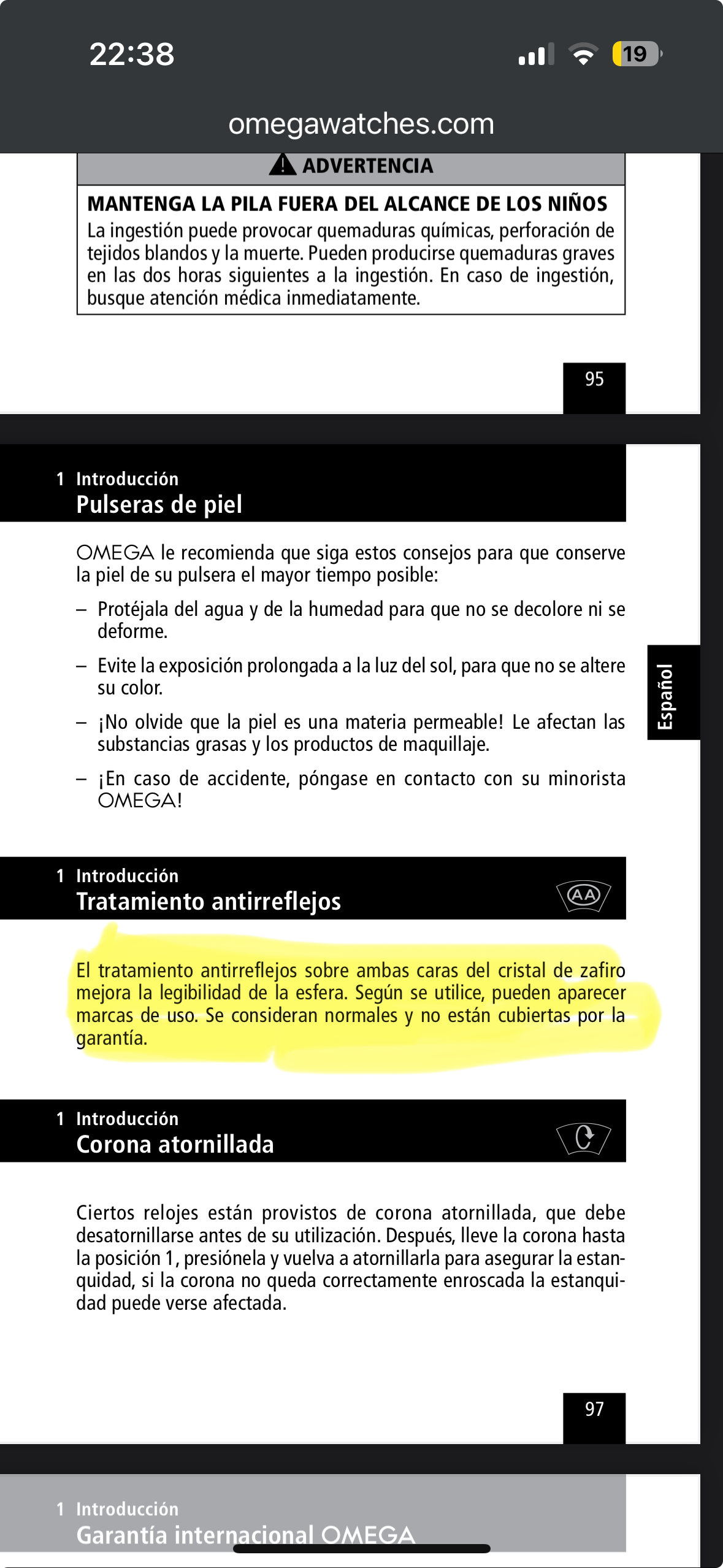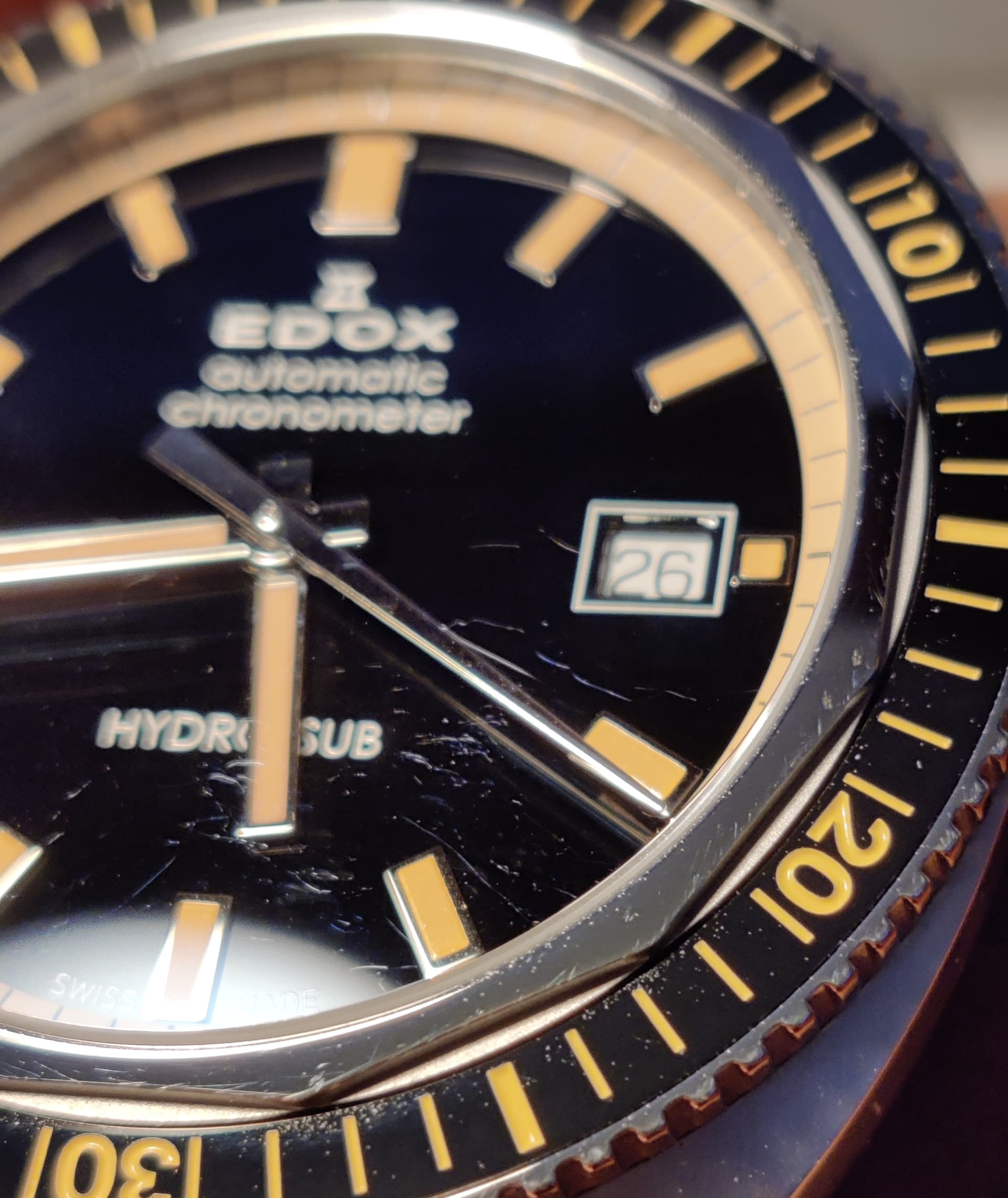 Desde que me llegó con cristal nuevo, 10-15 usos, en su mayoría laborables de oficina y salidas de finde tranquilas, ni playa, ni montaña ni actividades movidas, para eso uso otros o ninguno, este lo tengo como el más elegante, dentro de la informalidad. Ni siquiera ha tocado agua del grifo ni toallas de mano, nada que no sea la manga de la camisa/jersey y el paño Pagani Design de la caja de relojes.