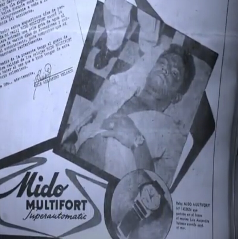 Recuerdo haberlo leído hace unos años, narra la historia de Luis Alejandro Velasco Sánchez y su naufragio. He hecho alguna búsqueda rápida por Google y hay algunas imágenes pero en ninguna se aprecia un reloj, quizá sea interesante como dices echar un ojo a la hemeroteca colombiana, aunque es probable que ahí tampoco lo especifiquen…