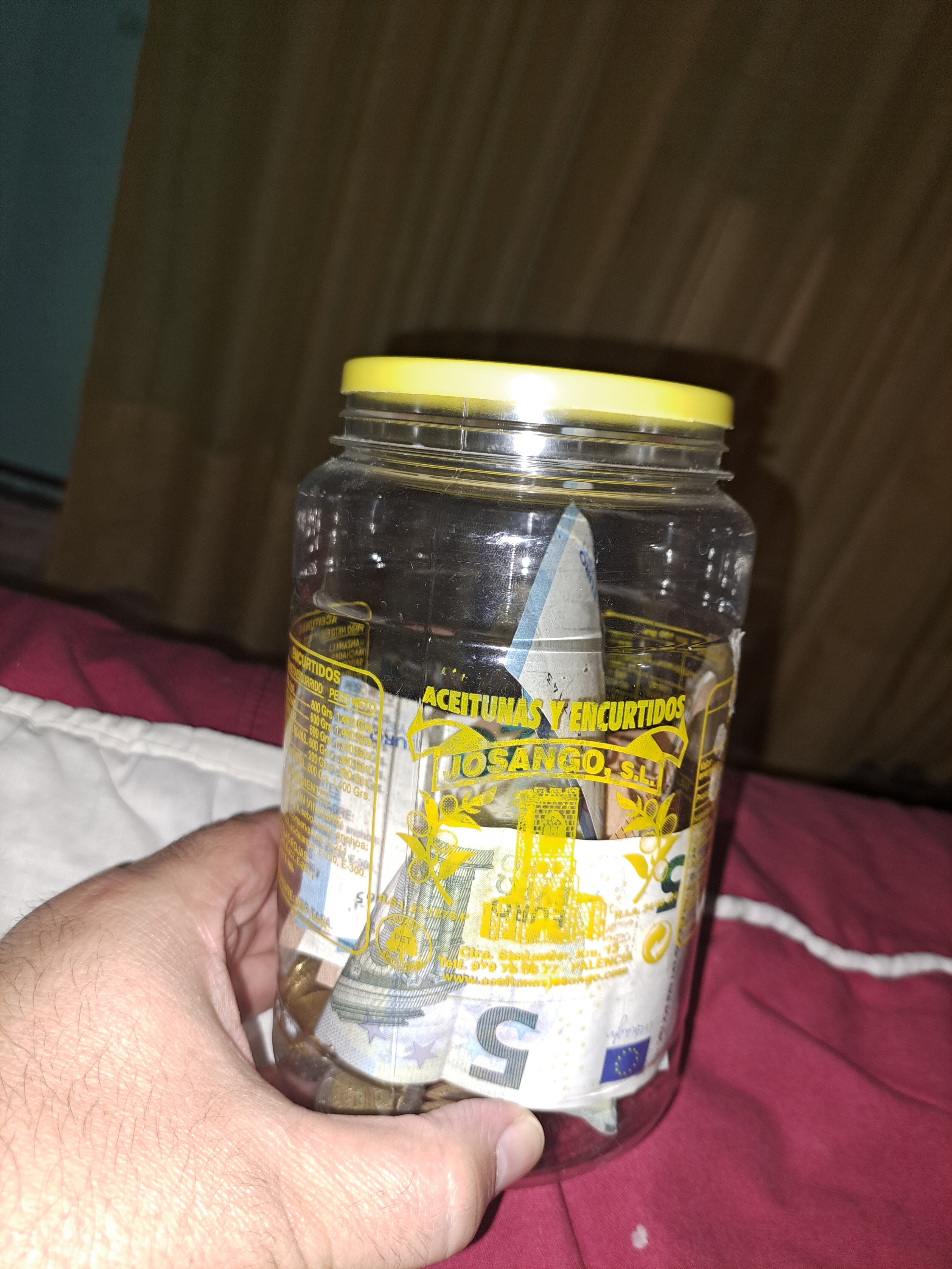 Todos los días saco un billete de 5€ de la cartera, y me tomo mi café y rosquilla por la mañana, y café por la tarde. La vuelta de esos 5€, más las propinas que me caen cuando corto el pelo las meto en un bote/hucha que he creado con un recipiente de banderillas