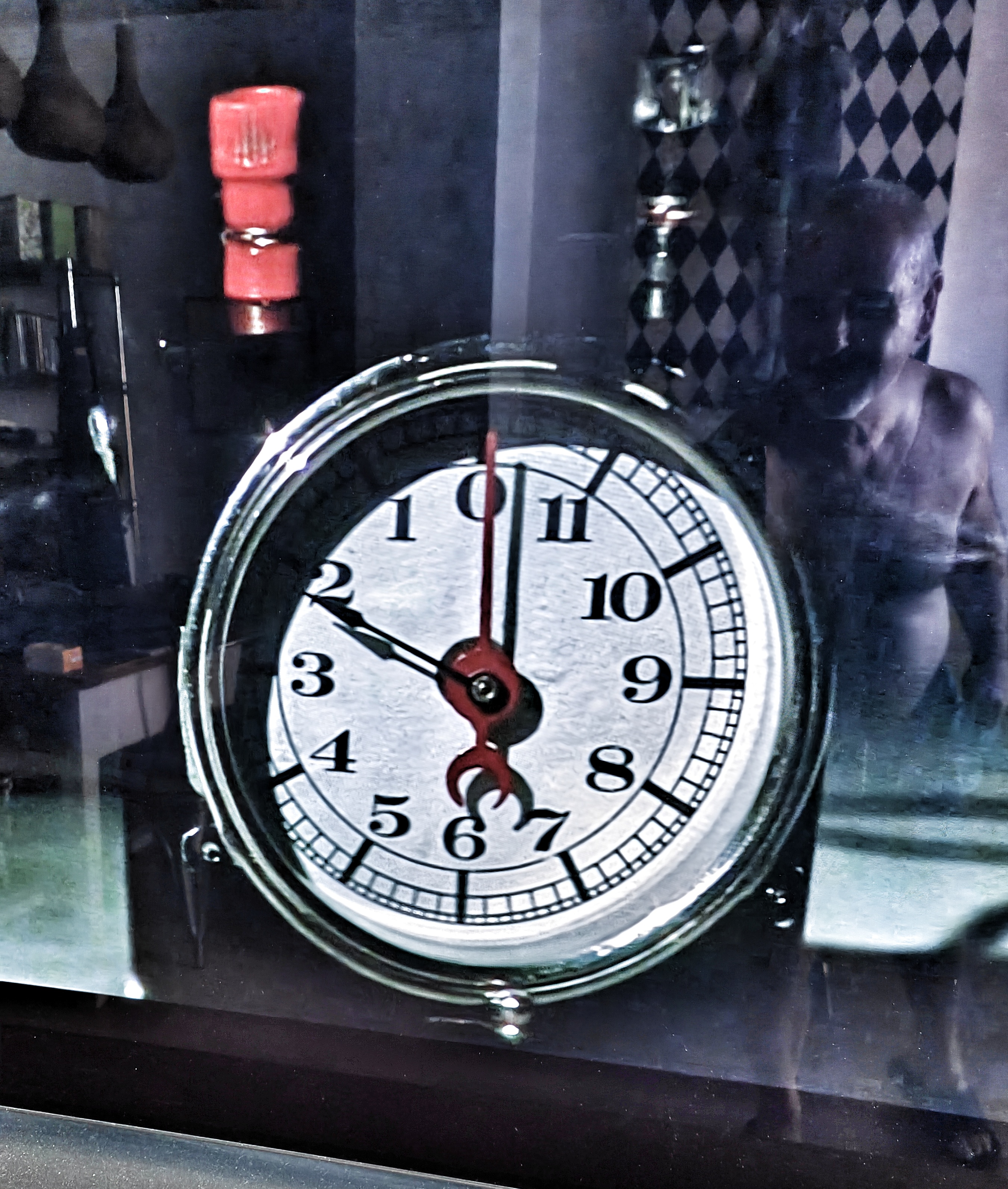 Y todo un clásico, el reloj que Paul Newman y Steve McQueen colocan para explosionar los depósitos de agua en “El Coloso en llamas” (yo salgo reflejado junto a él)