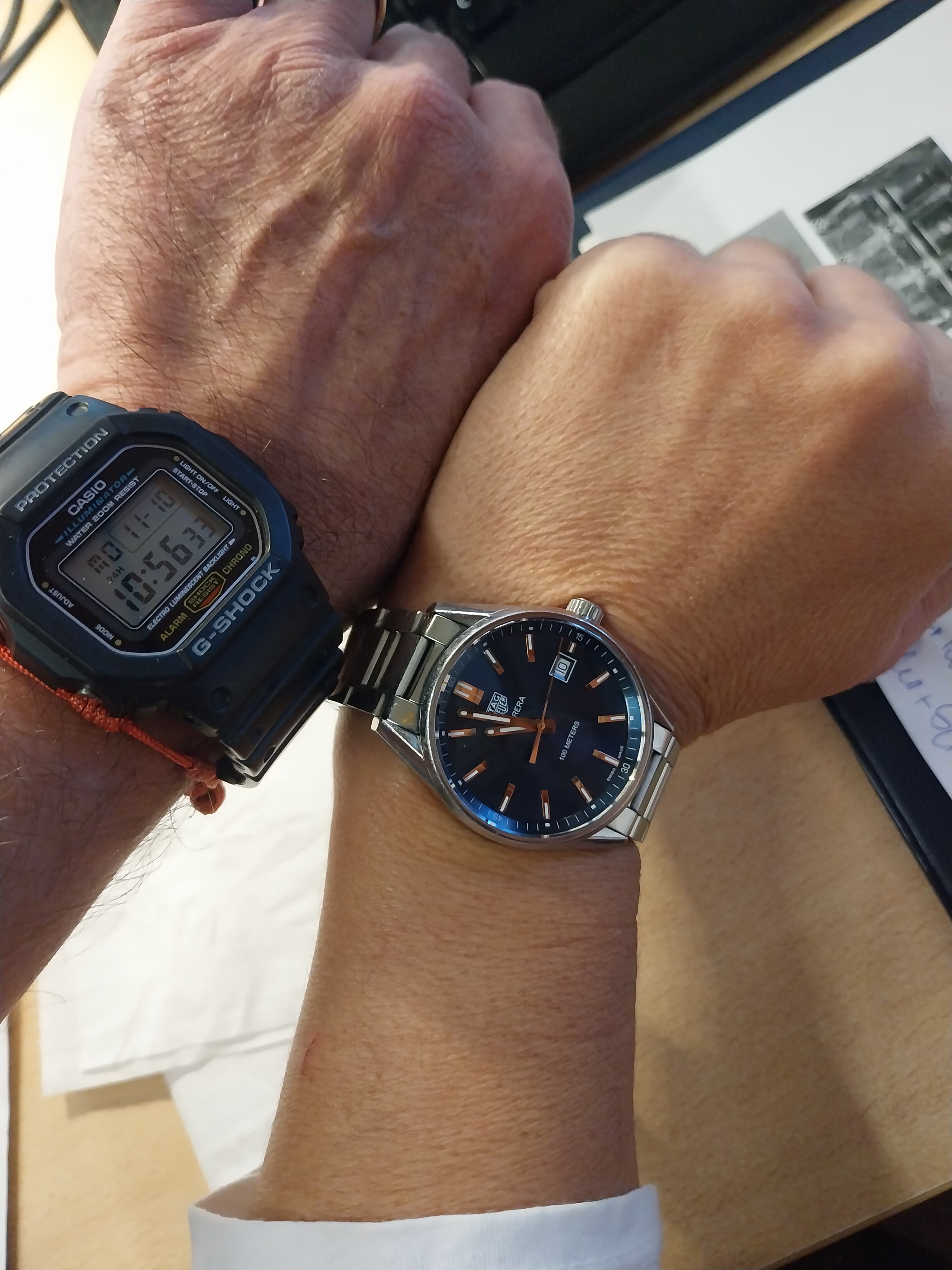 No voy a sacar fotos por los motivos ya esgrimidos por el resto , de mis compañeros hay tres apasionados, con uno hablo mucho de relojes y suele llevar “señores relojes”, tiene un submariner, ediciones limitadas a Japón de Seiko y marcas curiosas con complicaciones raras, los otros llevan Omega y Breitling respectivamente. ¿El resto de compis? Seikos, Casios y smartwaches