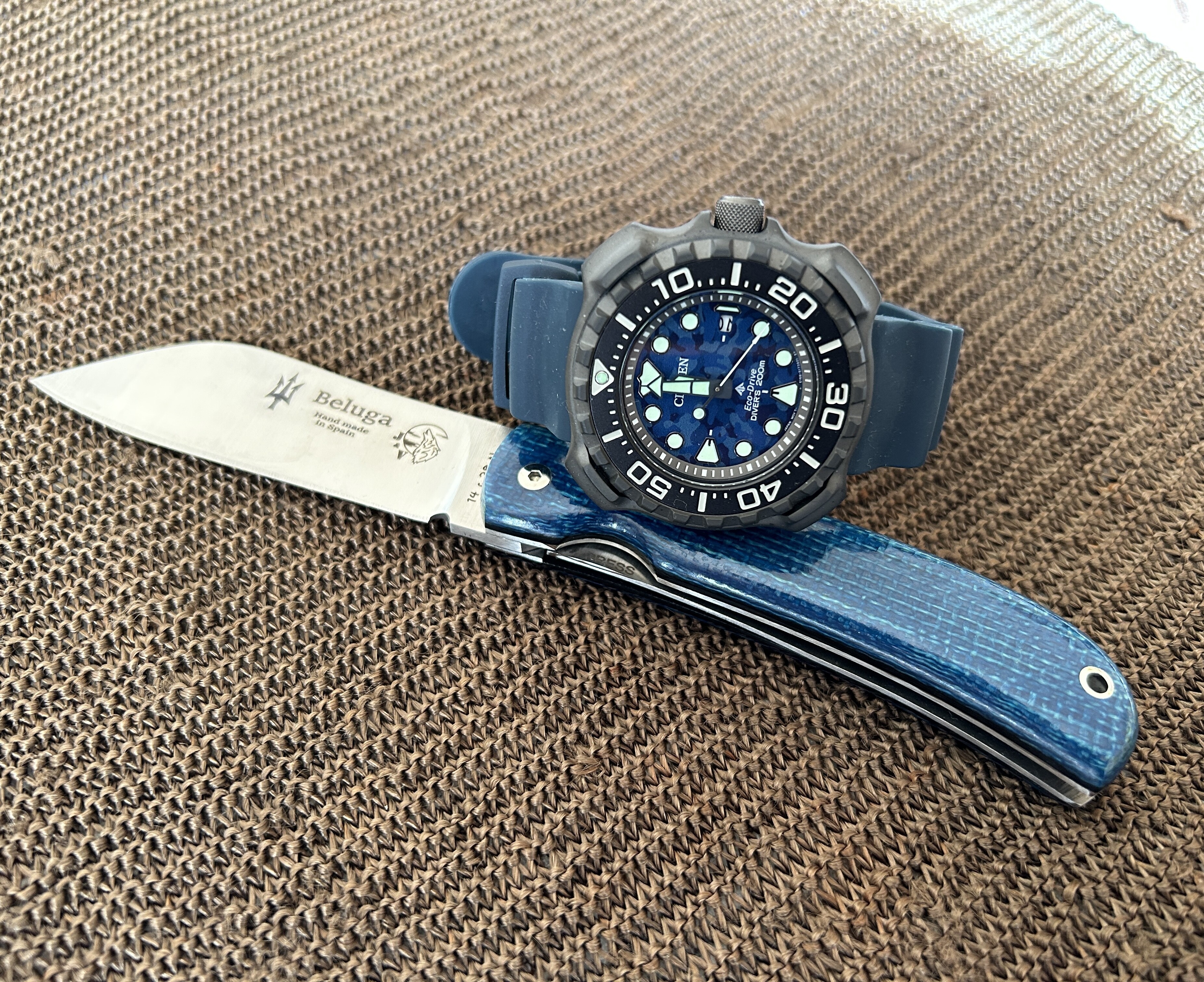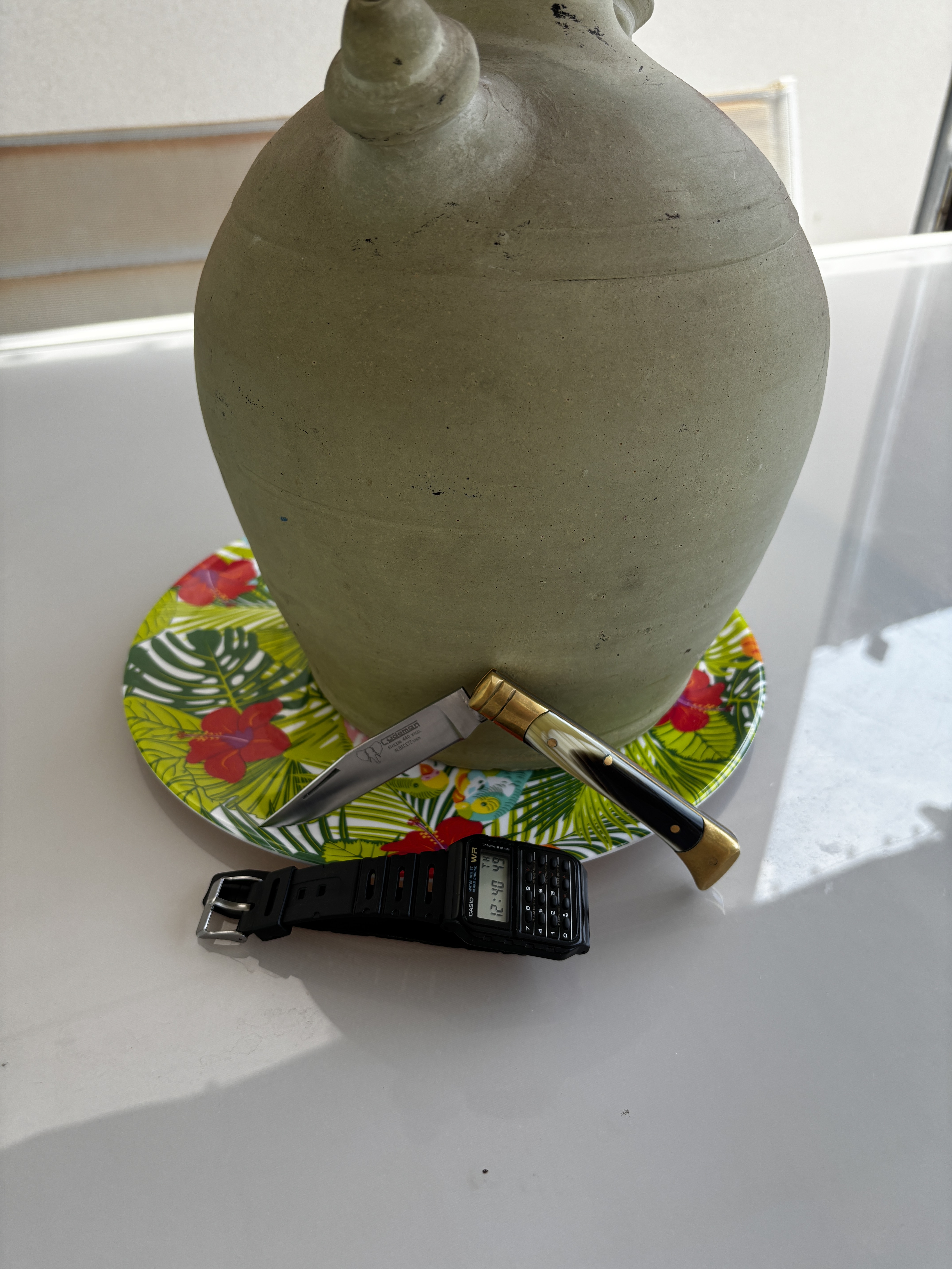 Hoy me ha apetecido todo el conjunto retro, Cudeman de los 90, casio de los 90 y botijo, que realmente uso para beber, de no se que año pero bastante viejito.