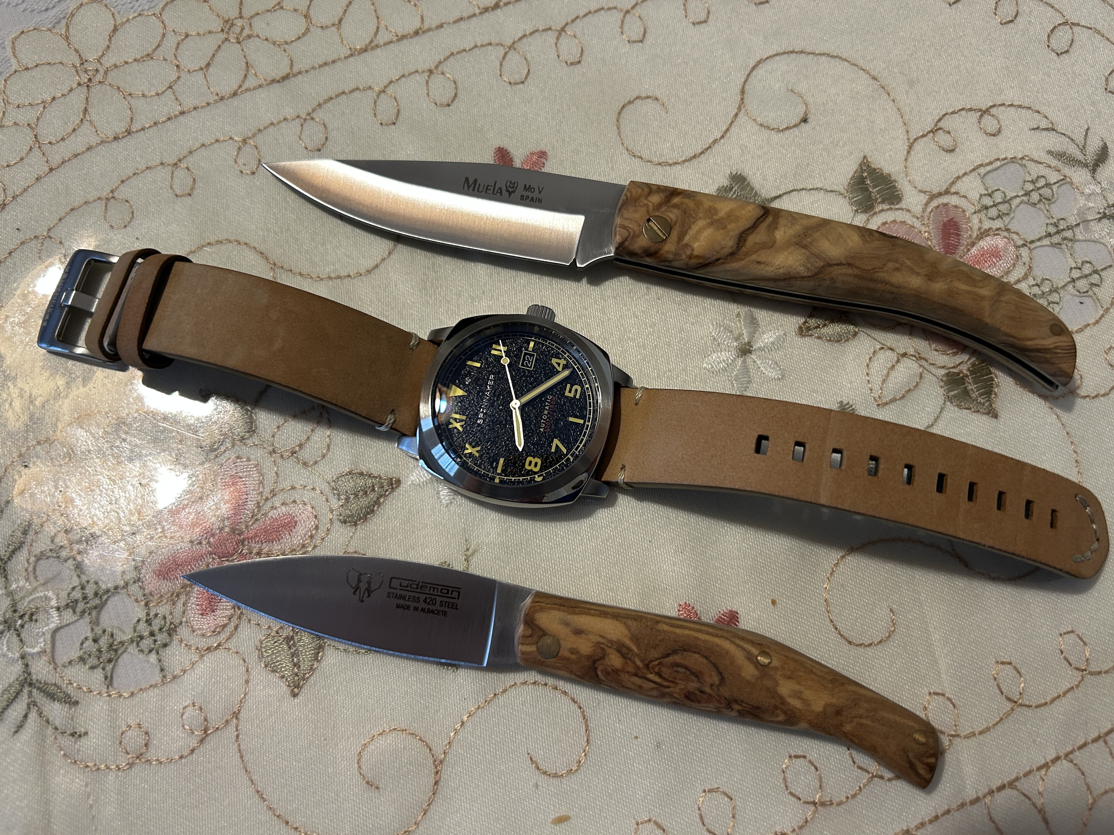 Hoy un Spinnaker acompañado de dos navajas de madera de olivo, una Cudeman y una Muela, bonitas y elegantes a la vez que sencillas