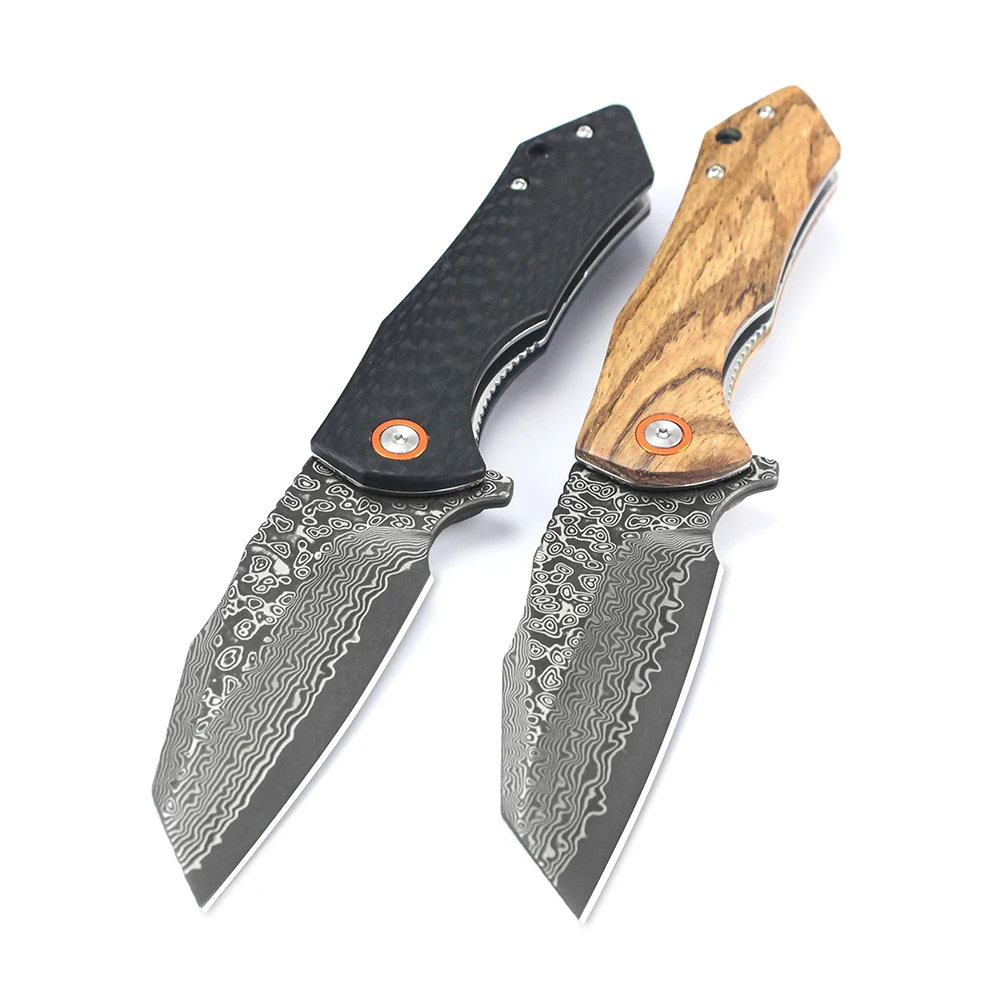 He encontrado esto en AliExpress: 66,28€ | Cuchillo plegable hoja de acero damasco fibra de carbono o mango de madera adecuado para supervivencia al aire libre, camping, navaja de bolsillo portátil