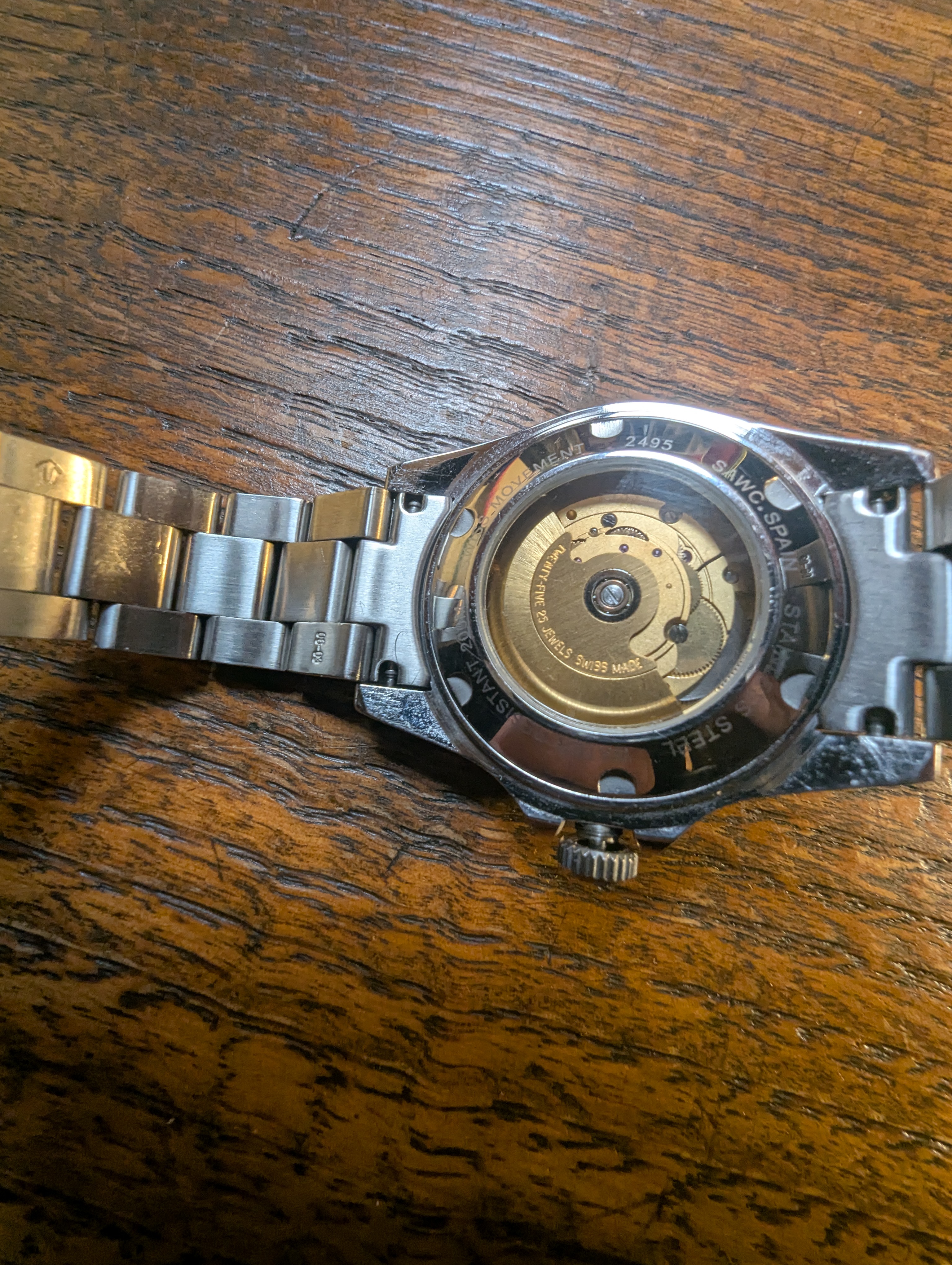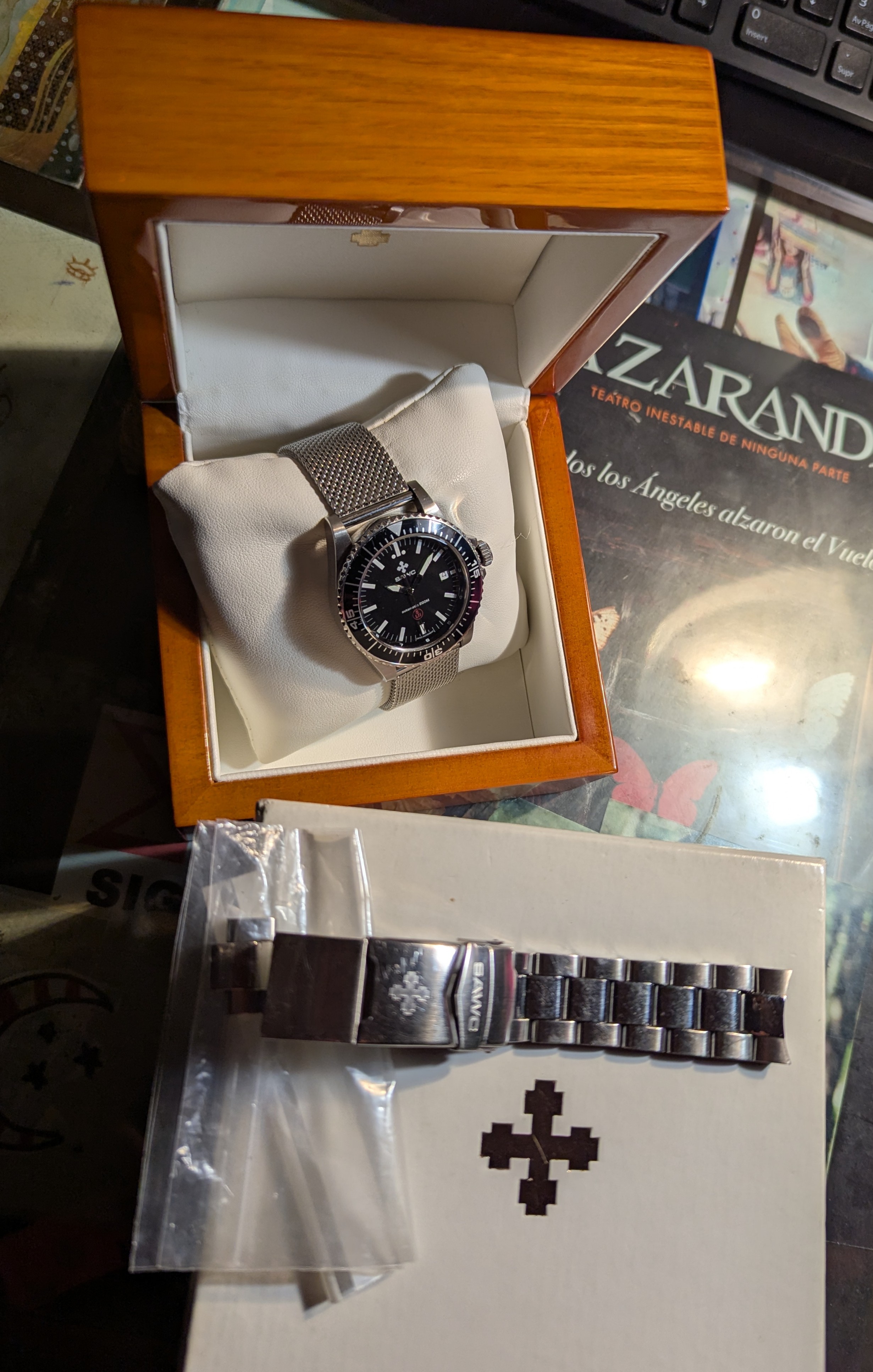 Se entrega con su armis original con eslabones hasta 16,5cm y un apaño de tres eslabones más una prolongación del cierre, que le añadí para que entrara en mi muñeca de 21 al no encontrar eslabones atornillados originales. Añado una milanesa genérica que le sienta estupendo.