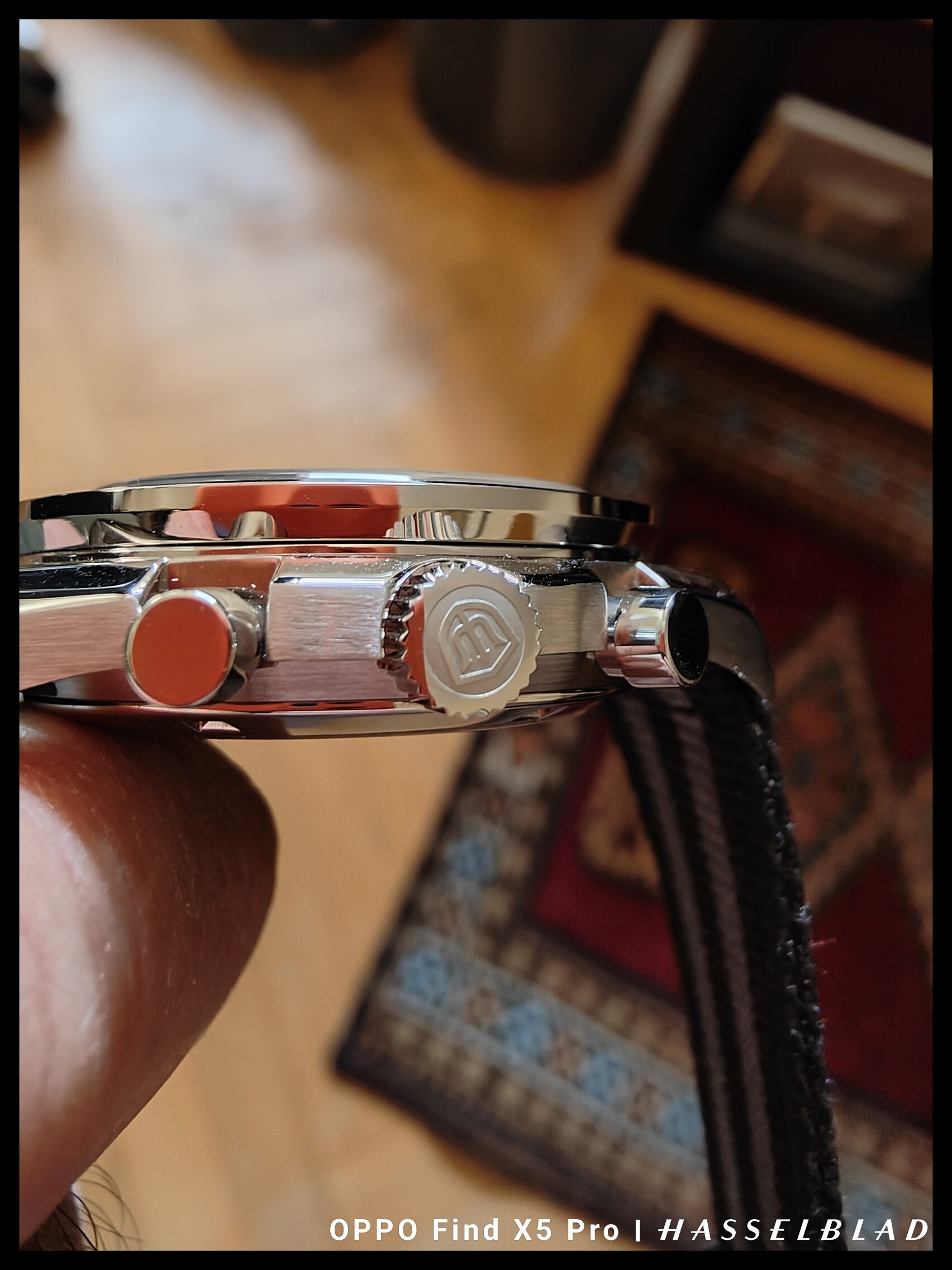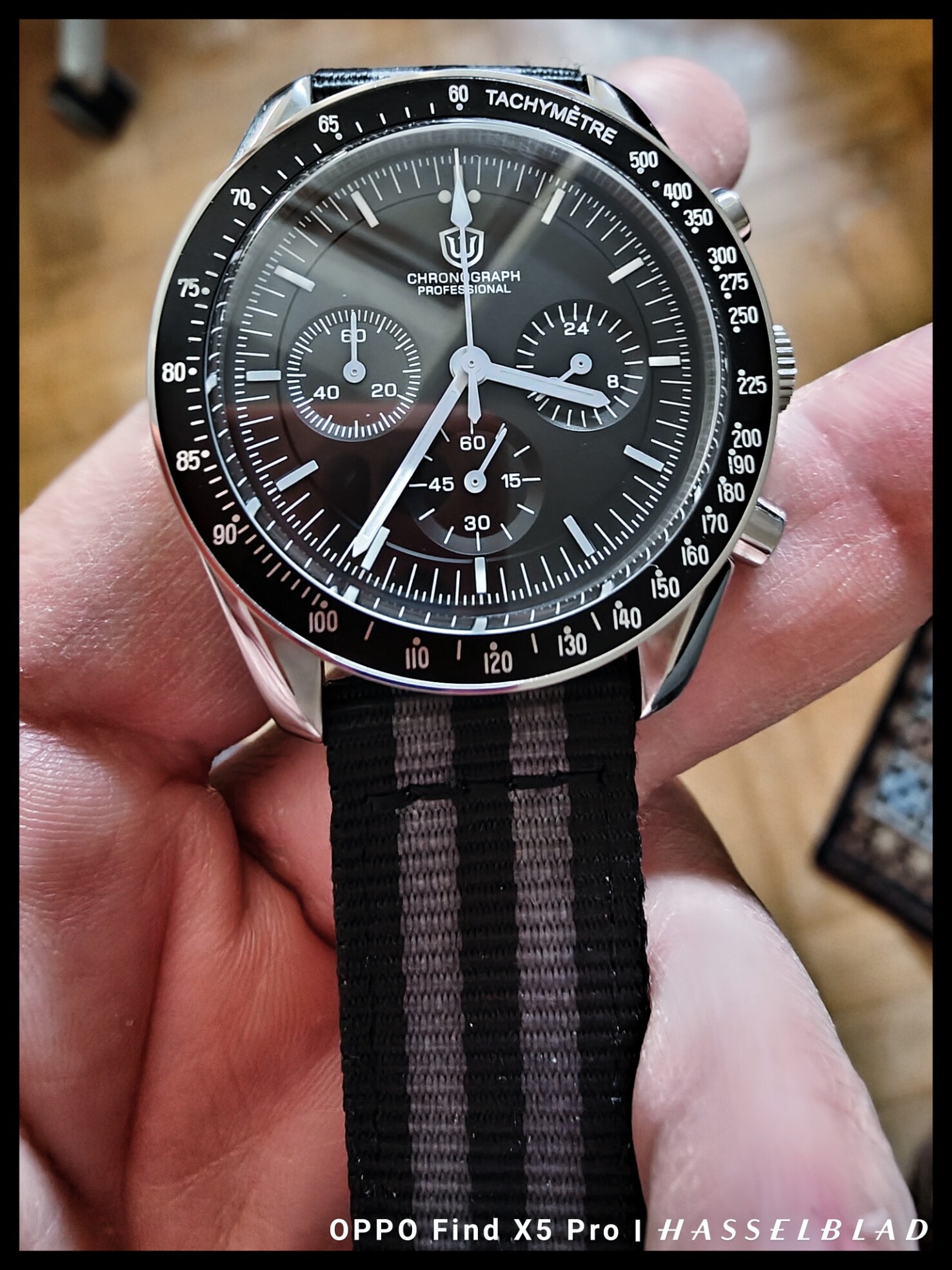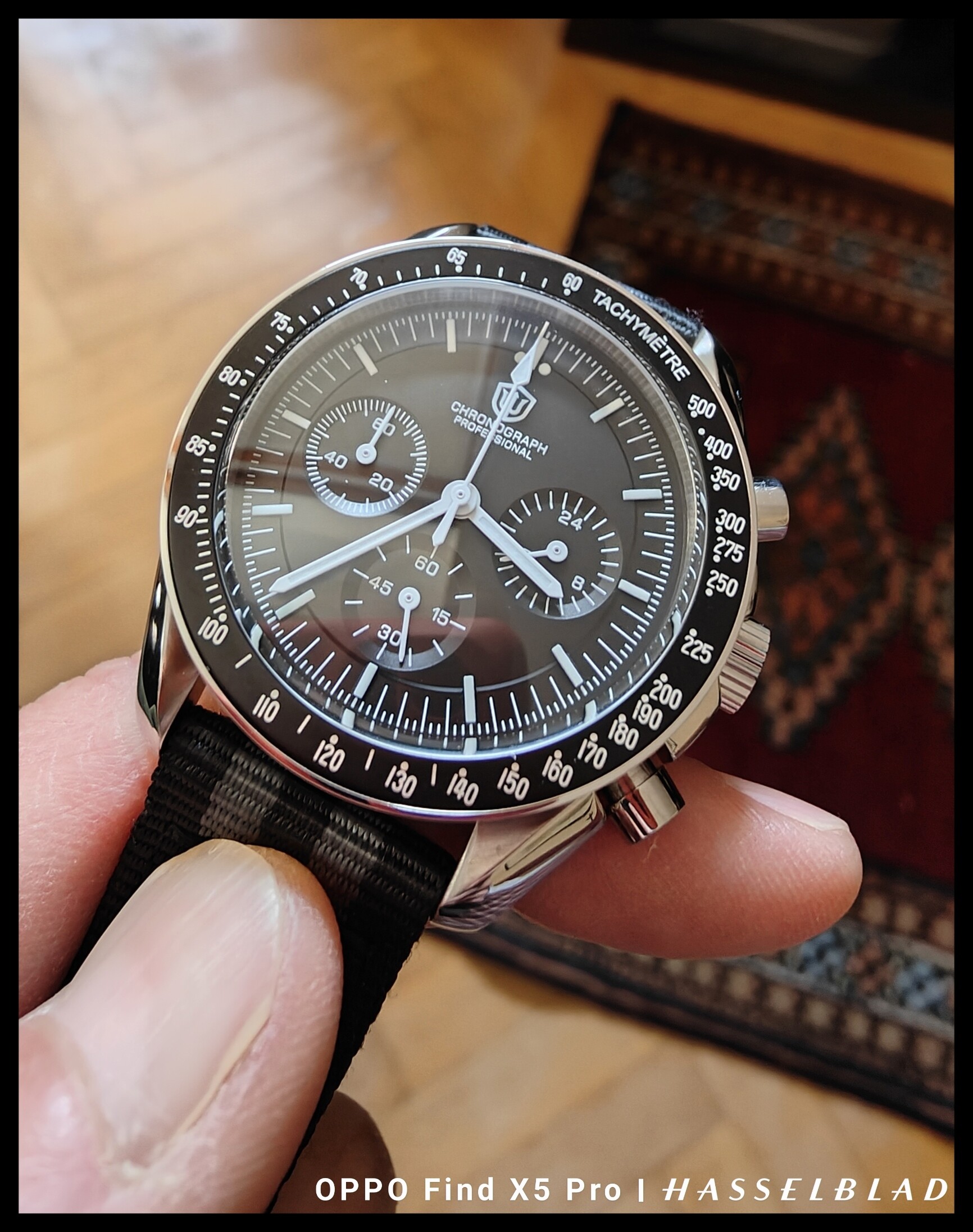 Ah!, de propina os dejo fotos de otro reloj recien llegado tambien a casa, un Watchesdive homenaje al Speedy, bien resuelto y con buena calidad para su PVP (algo menos de 100 leuros puesto en casa). Lleva una VK63, zafiro, 10bar y armis, pero yo lo he sustituido por una nato Bond.