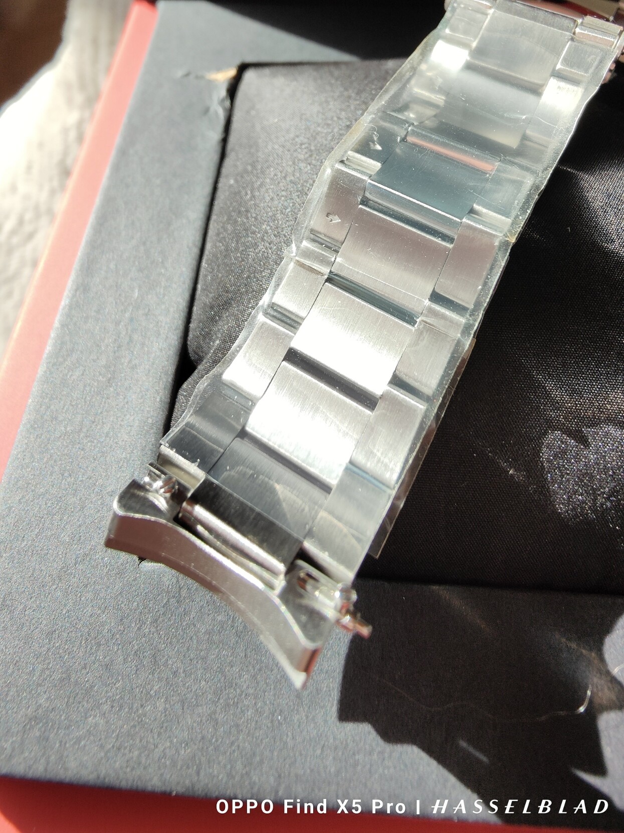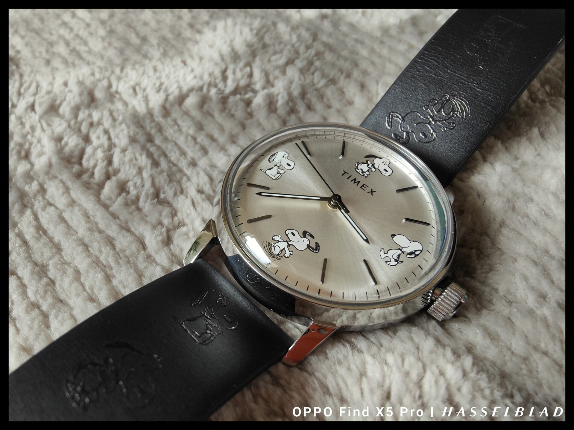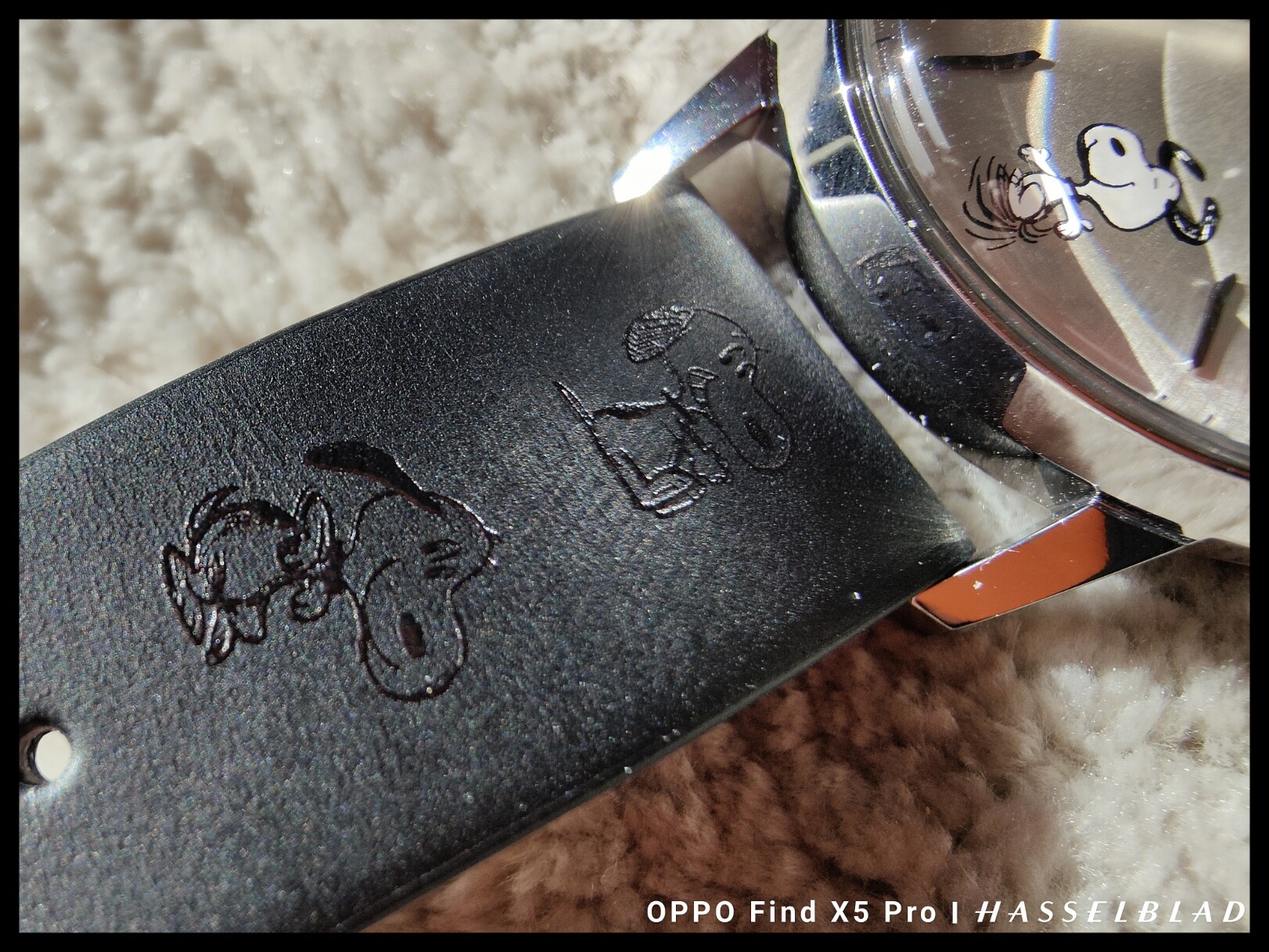La correa de serie tambien ayuda a a esa sensacion festiva, con los grabados de Snoopy en los lomos. No es piel autentica, creo que es piel vegana. El bucle esta firmado.
