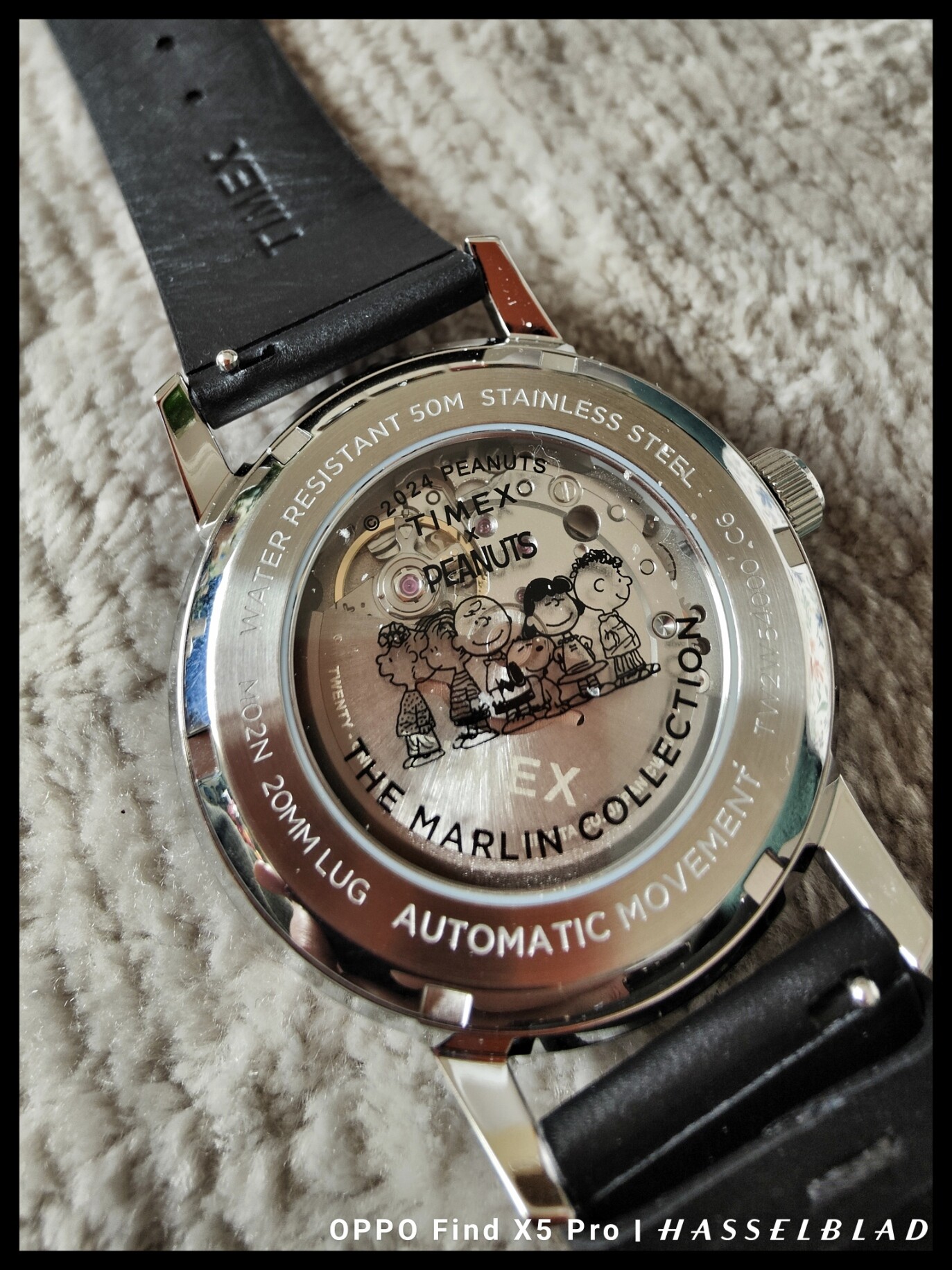 La caja de este modelo es mas sencilla, tiene un crisyal abombado de plexi y el fondo visto, lleva la Miyota 821 con hacking y remonte manual (aunque dudo si equipa la 8315 con 60h de reserva…). El cristal del fondo lleva dibujado al grupo de Peanuts que acompaña a Snoopy en sus aventuras, algo muy desenfadado como el reloj en si.