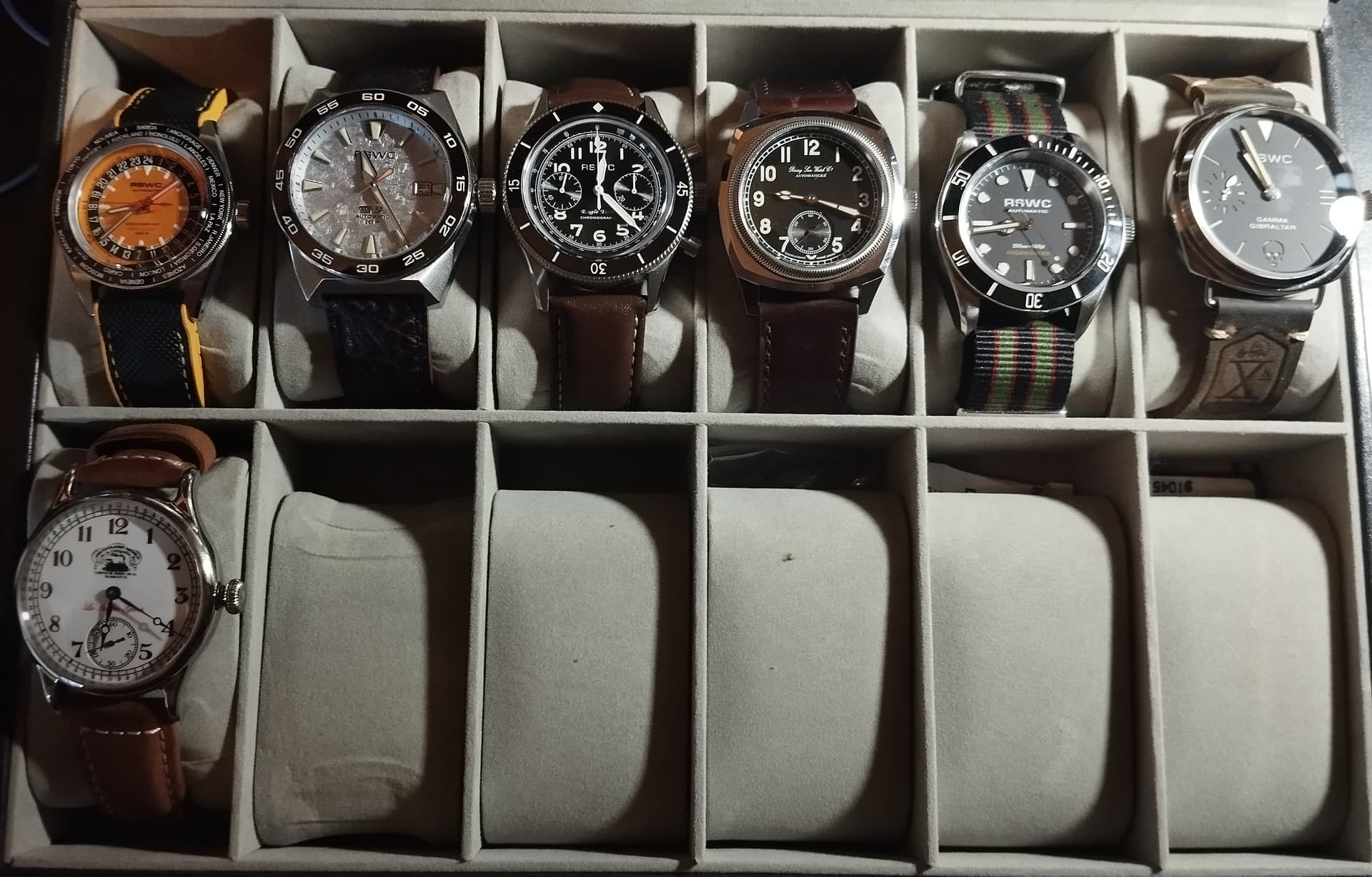 Como podéis ver, en la caja tengo cinco huecos, que en realidad serán seis, ya que el Ferroviario irá a mi colección de “Vintage”, ya que no me gusta mezclar los relojes con lume y sin lume, me gusta mirar la caja en la oscuridad y que no haya huecos.