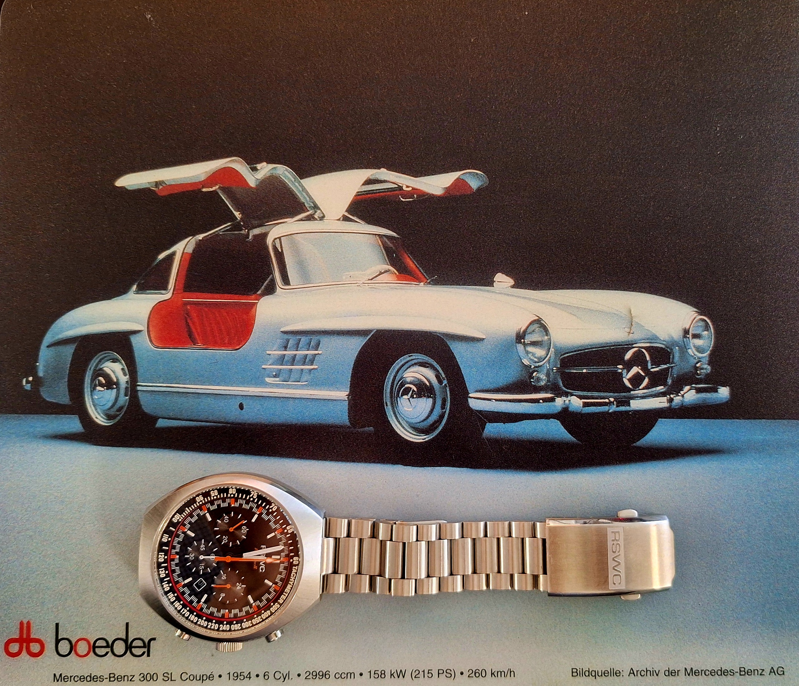Y para ello, cogemos las llaves de nuestro Mercedes 300SL y en la muñeca, el RSWC Karoussell.
