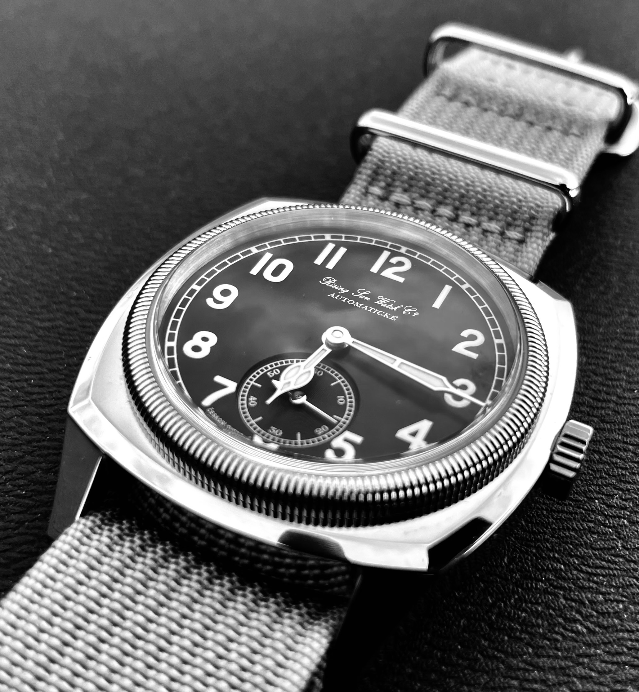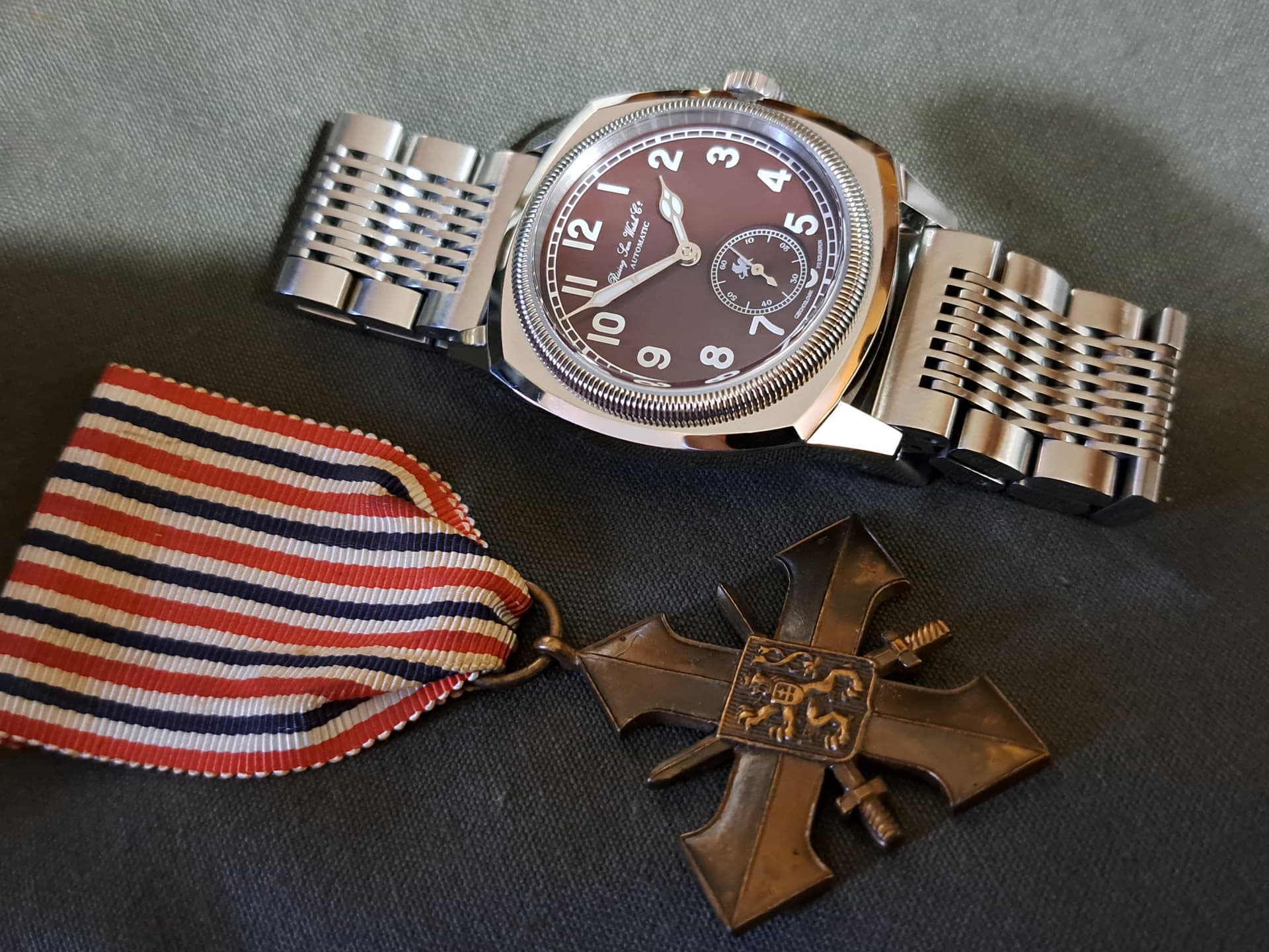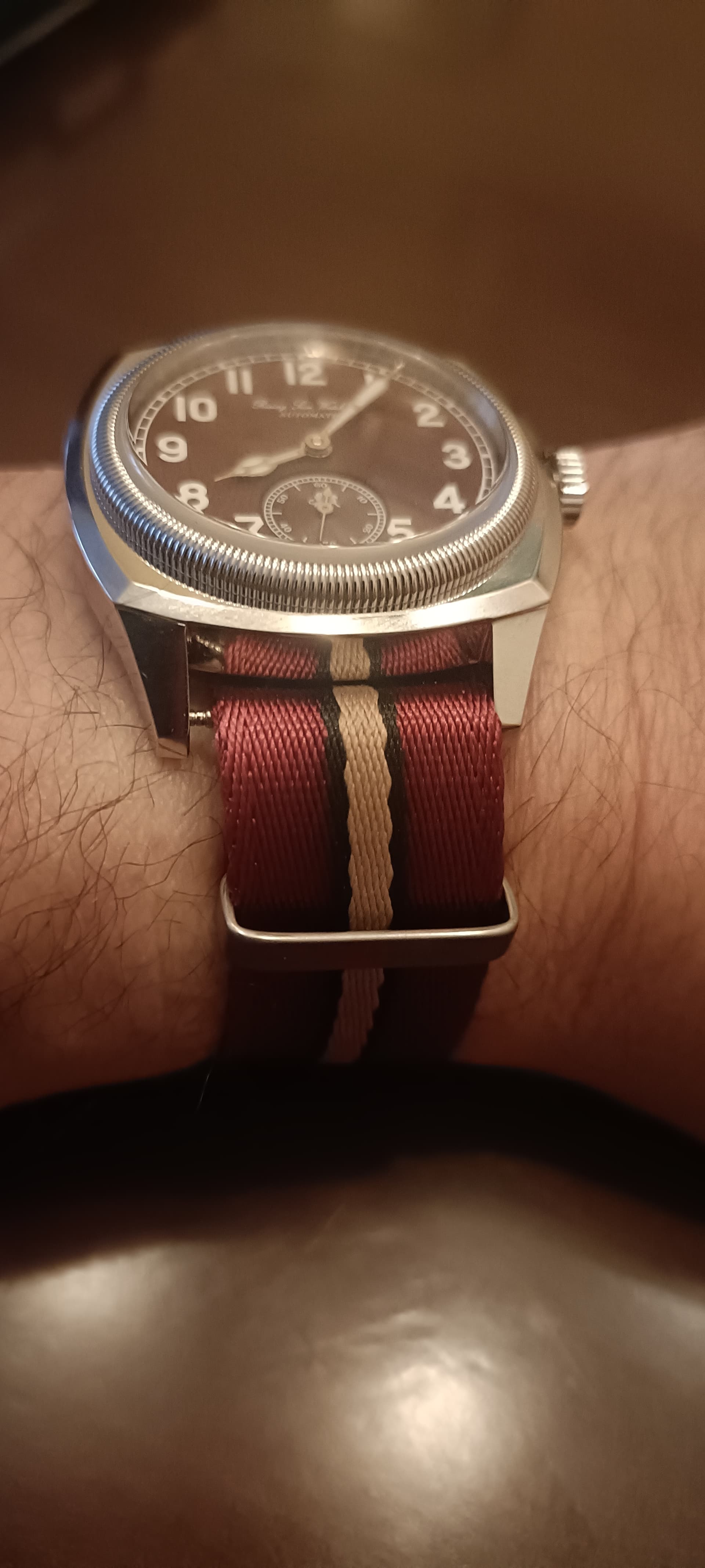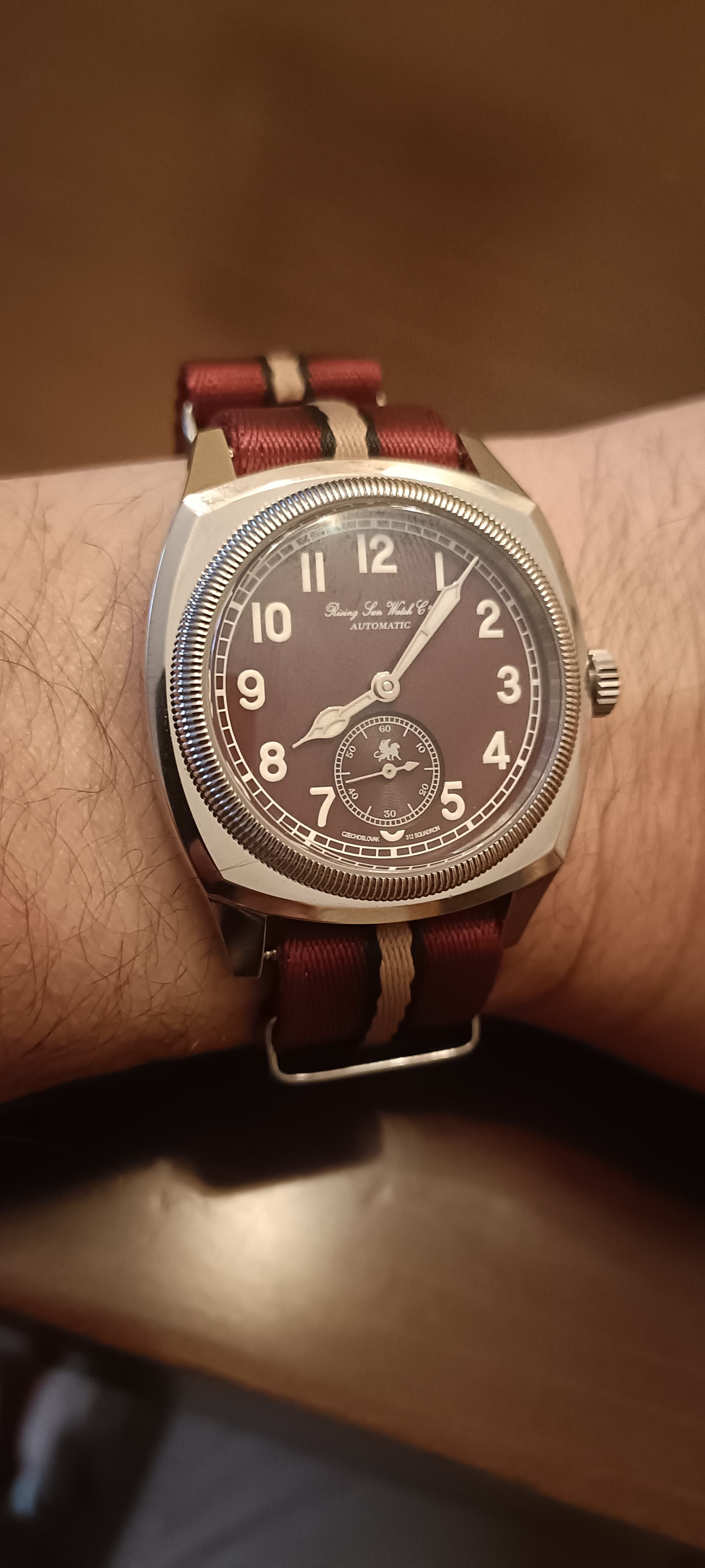 Es “peligroso” por poderse perder, pero por otro lado, estéticamente en esa pieza cuando alguien lo sacó, no recuerdo, dijimos más de uno que precisamente esa nato lo bordaba por su similitud con la medalla checa. Por lo que tanto por tamaño “desigual” a lo que pide el reloj, imitando un poco la improvisación de la época bélica, como por colorido que “evoca” la medalla checa conmemorativa a los pilotos que intervinieron junto a la RAF el resultado me parece encantador EMO.