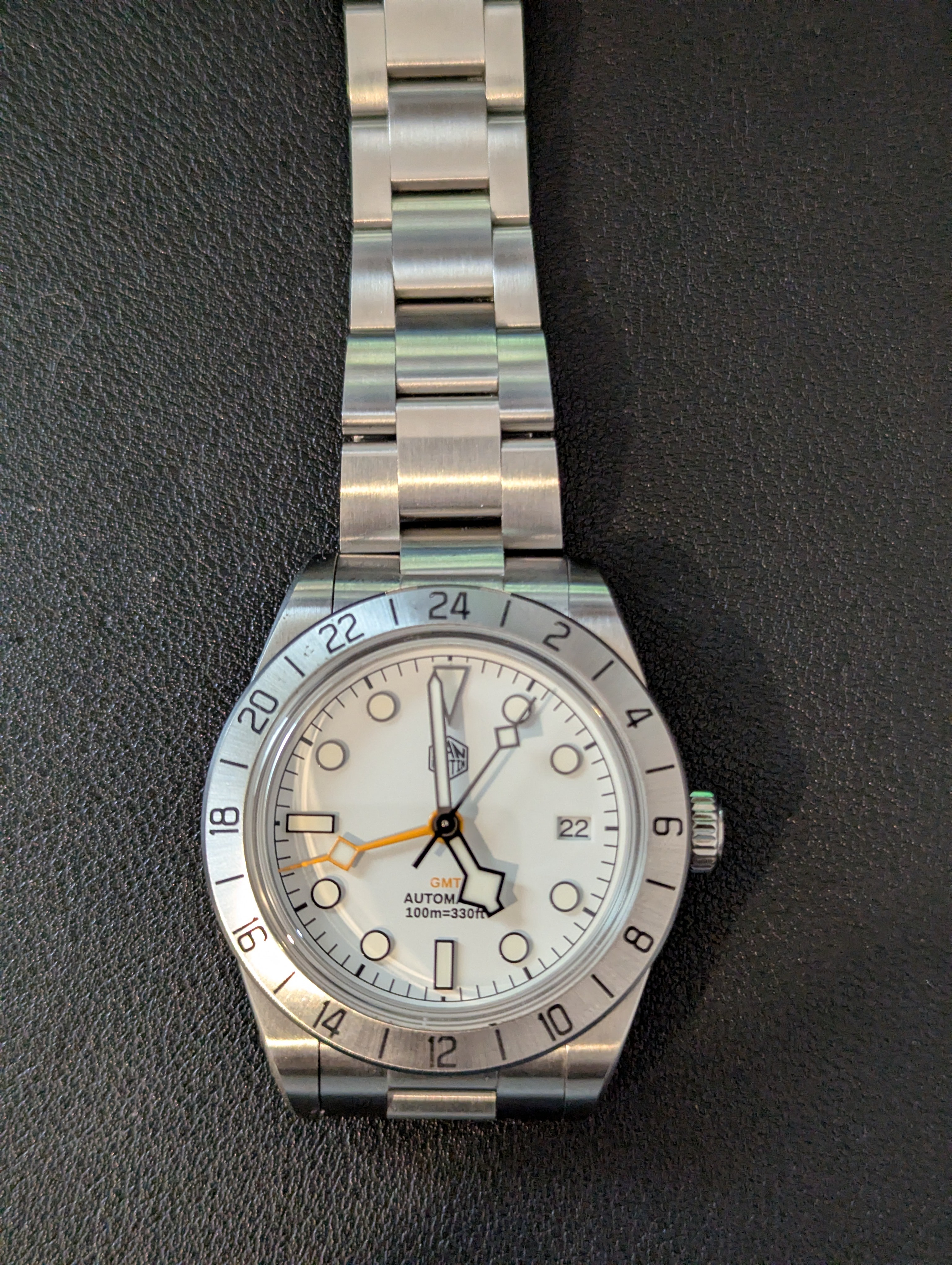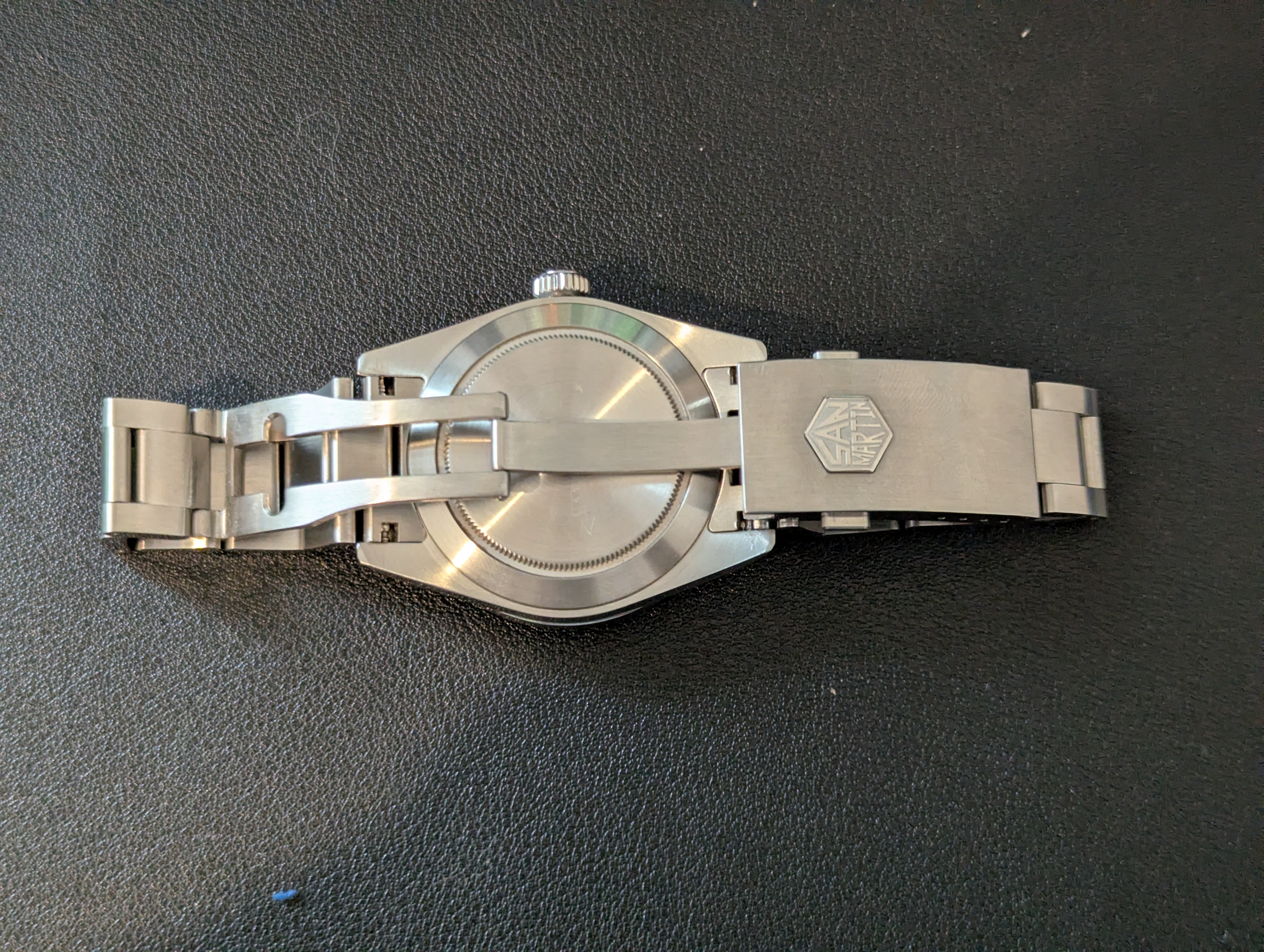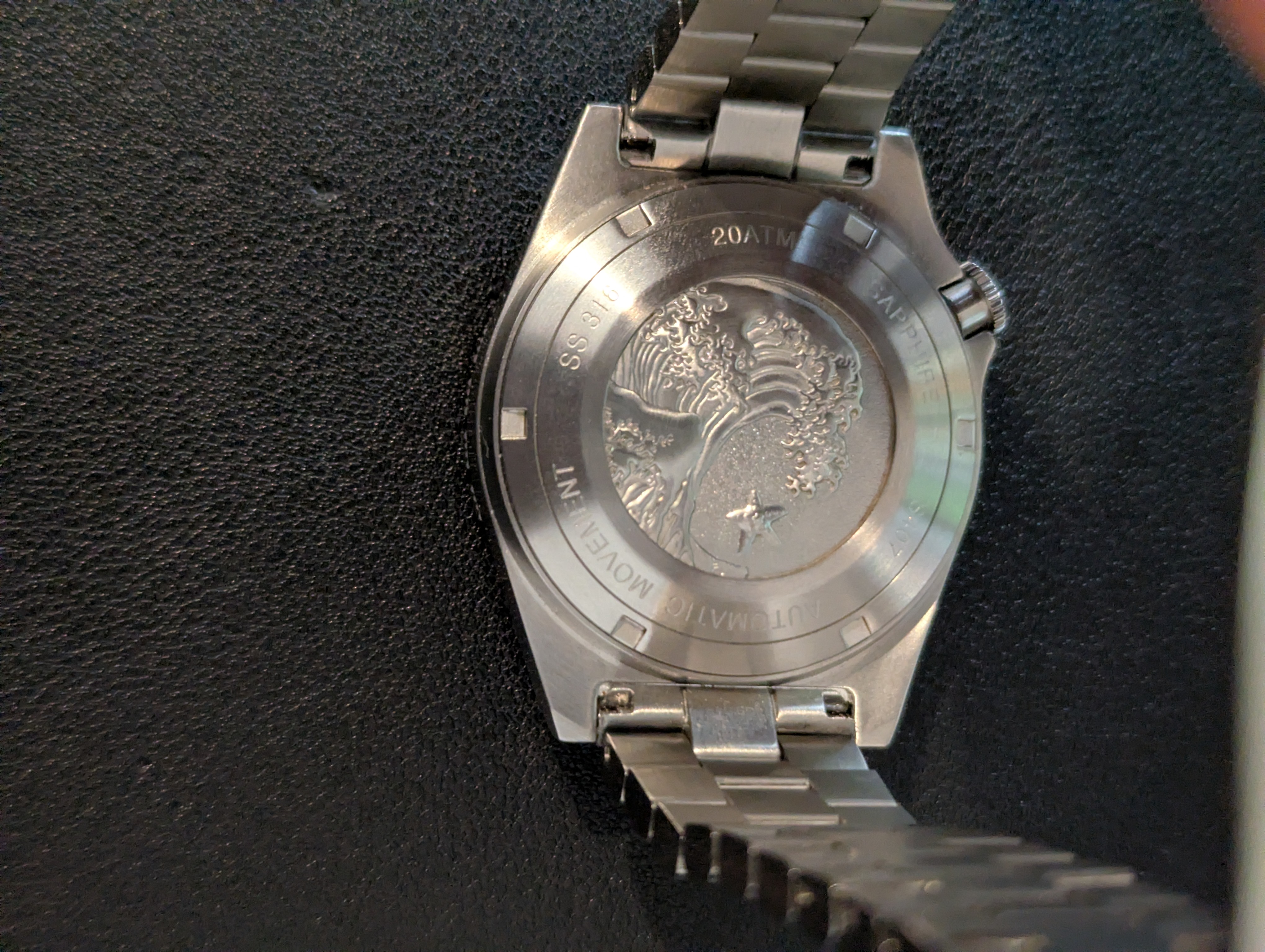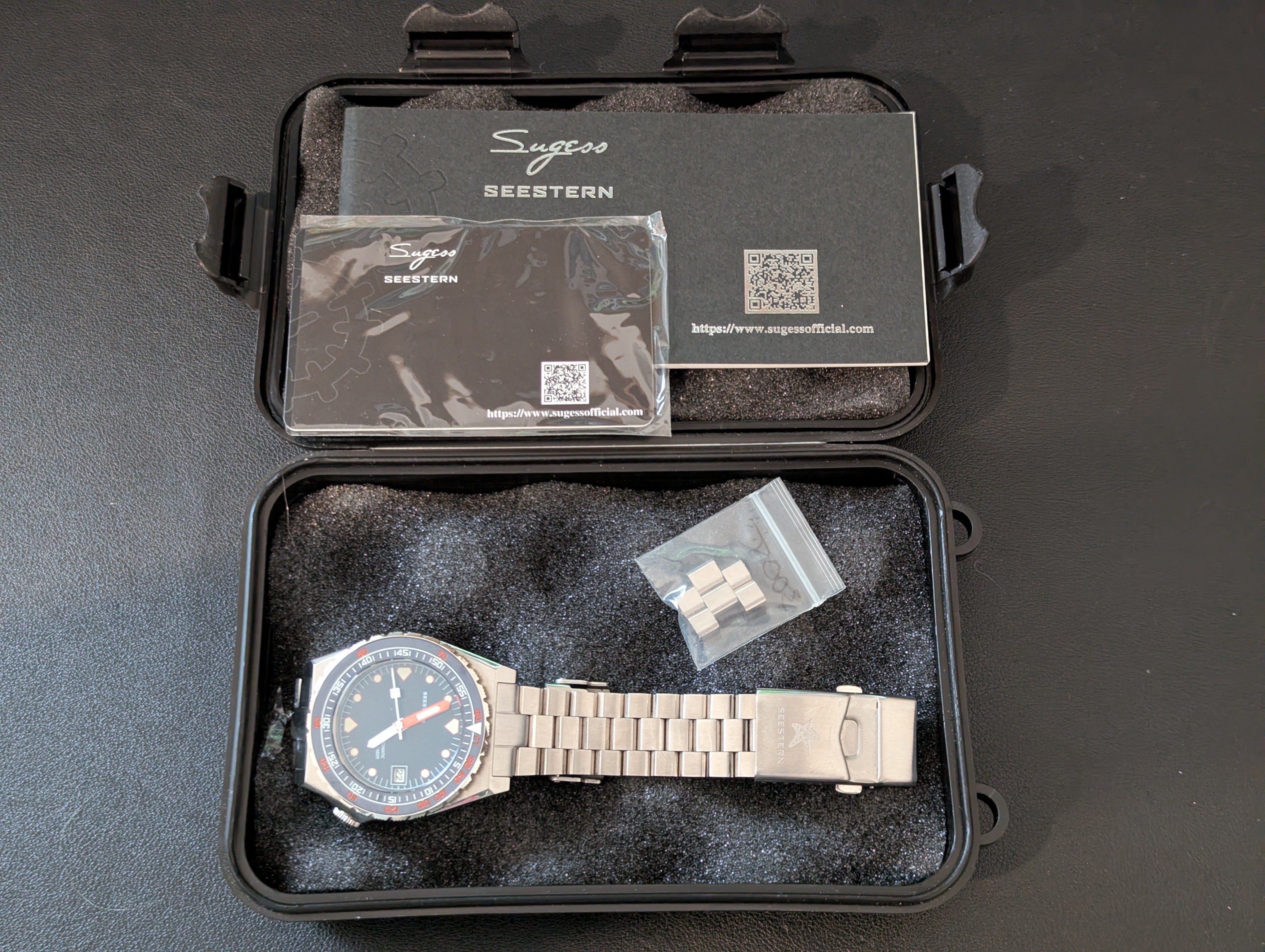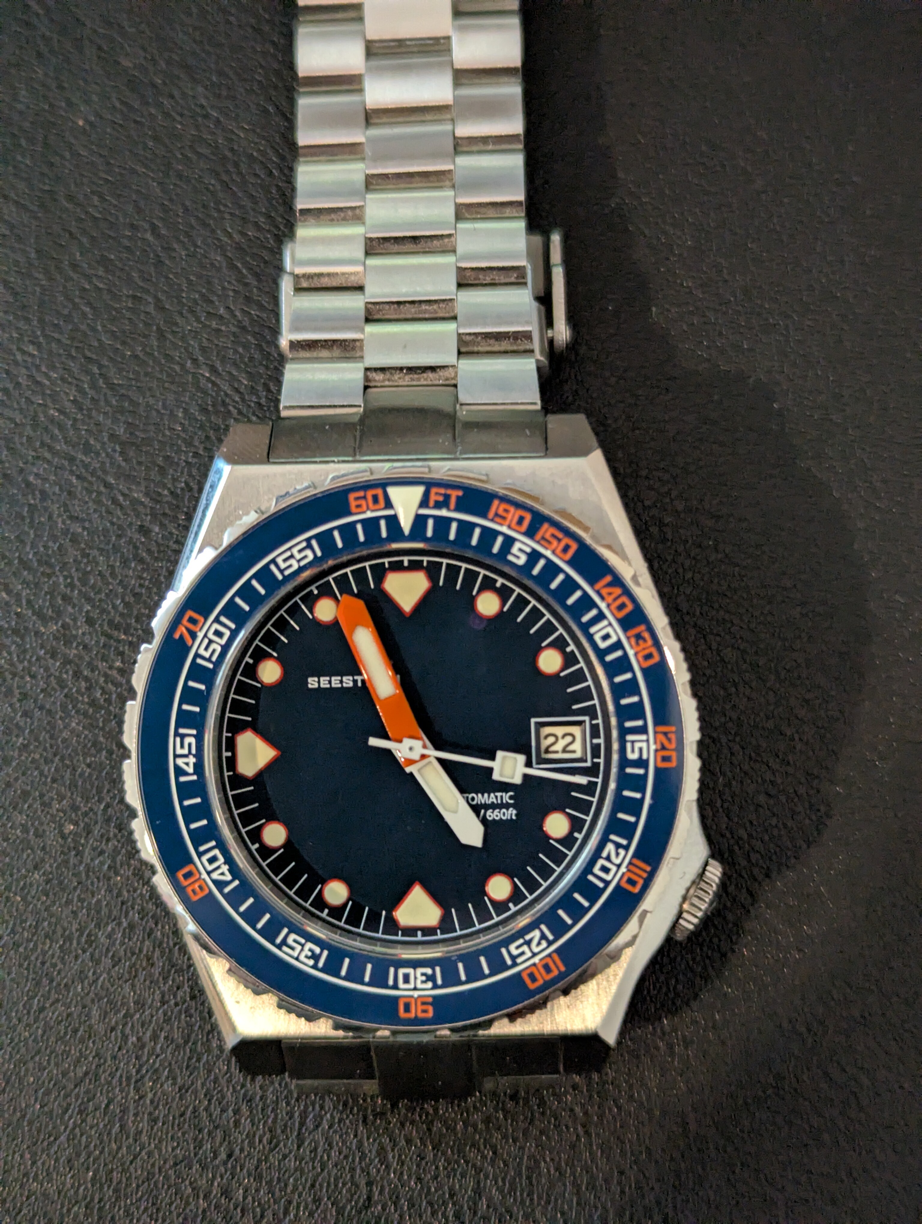 Después, un diver. En concreto un Seestern SUB600T homenaje a doxa, con bisel y cristal de zafiro y un brazalete que da gusto de lo cómodo que es. Ventana de fecha con lume, una cursiosidad cuanto menos… curiosa. Tiene algún pelillo en el cierre (los típicos de los divers de oficina) que he intentado sacar en foto. Dotacón completa también, con los eslabones sobrantes.