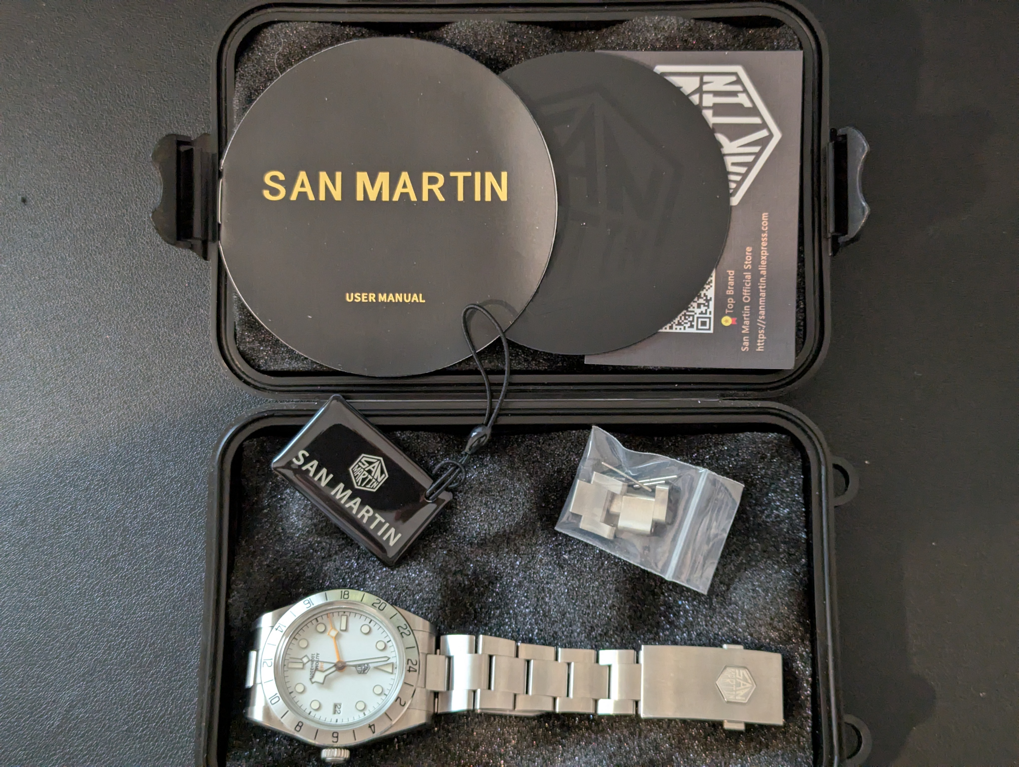 El primero, un San Martin GMT con movimiento NH34, creo que fue la base que se usó para el Rex Terrae del pingüino, corregidme si me equivoco.