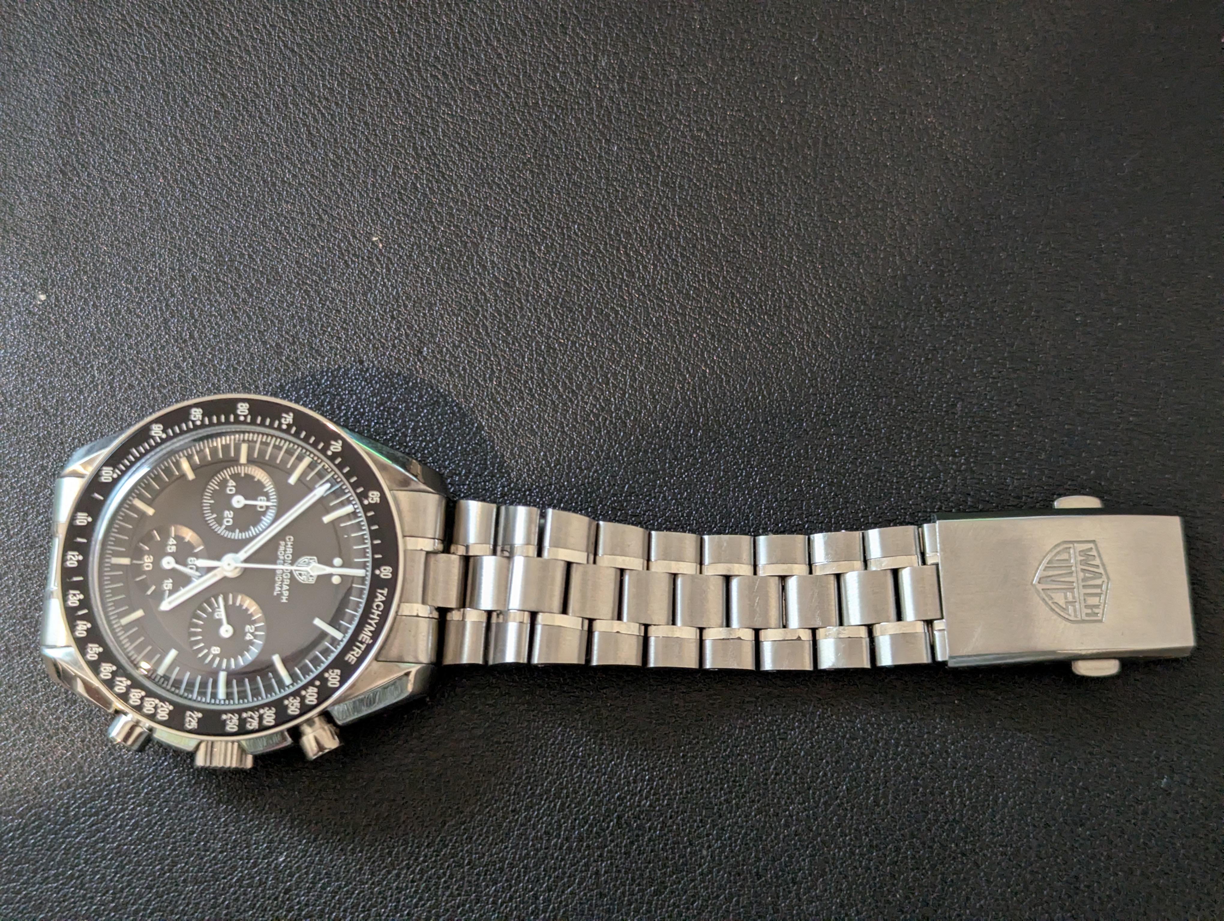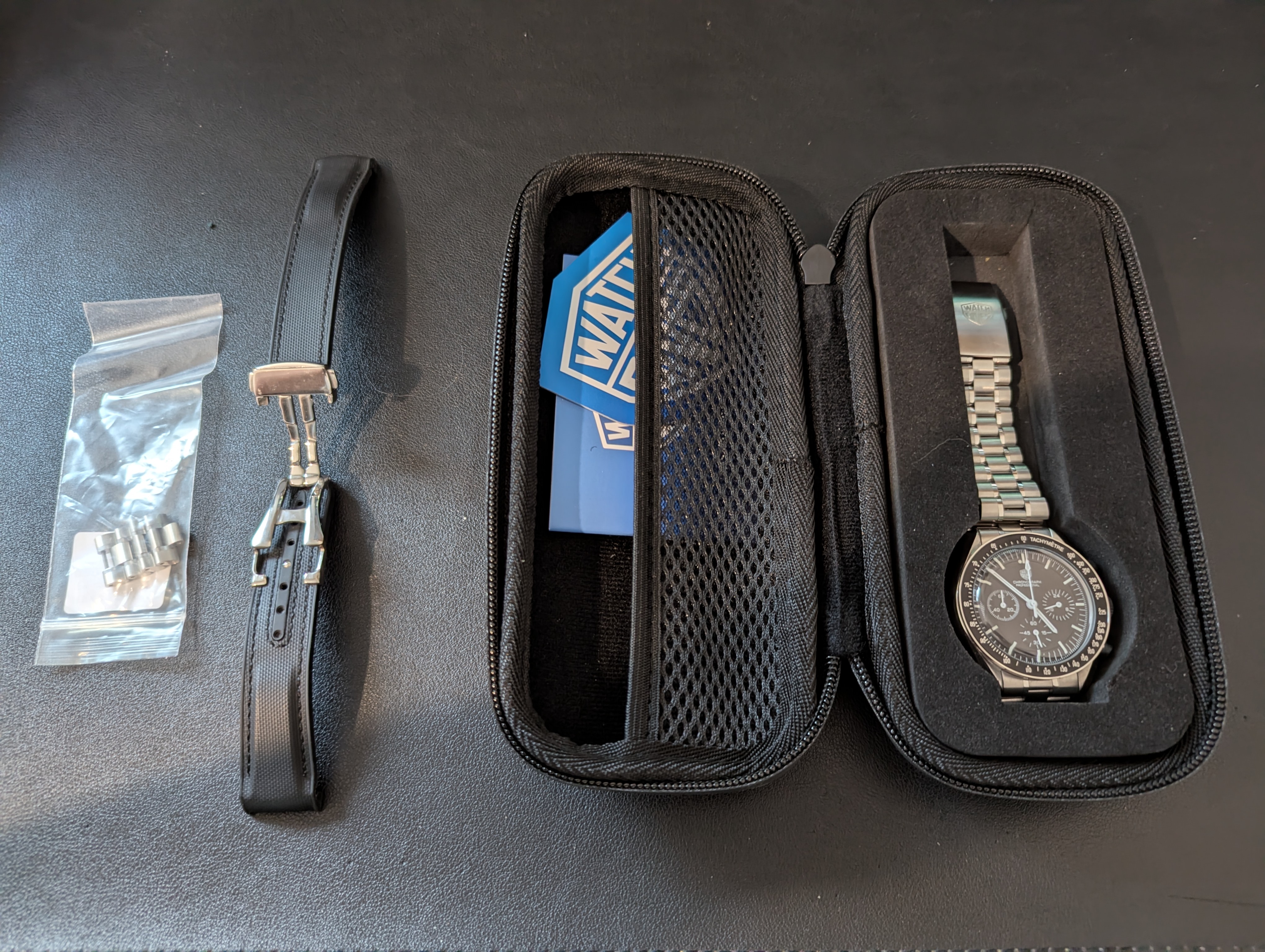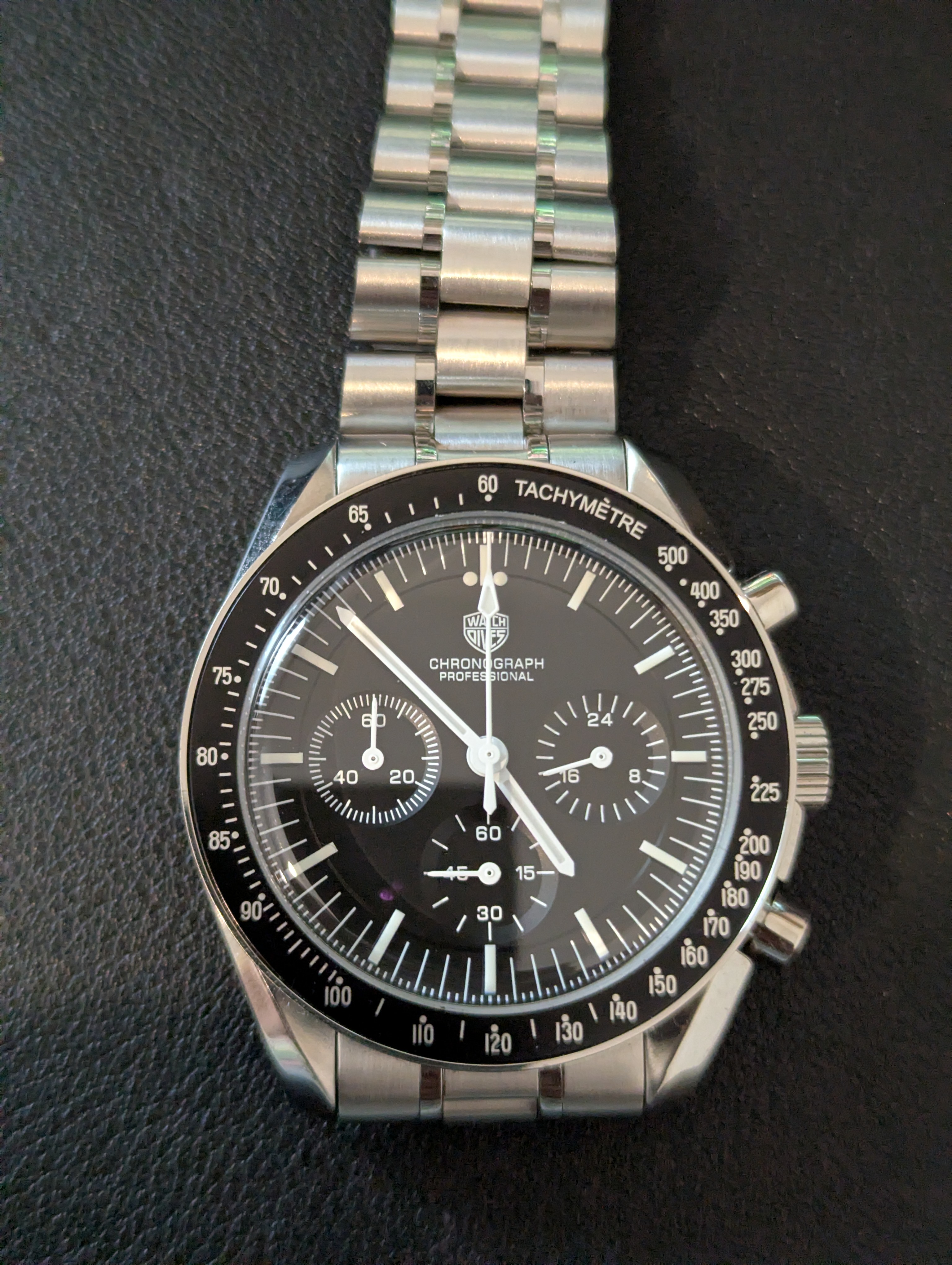 Por último, uno que he sacado después de varios meses sólo para el desafío de los cronos, es una pena pero no lo uso asi que mejor que lo disfrute otra persona. Para mí, de los mecacuarzos es el mejor homenaje al Speedy. Regalo una pulsera de silicona que le va perfecta, ajusta al milimetro con la curva de la caja. Dotación completa con eslabones sobrantes, como en los otros dos.