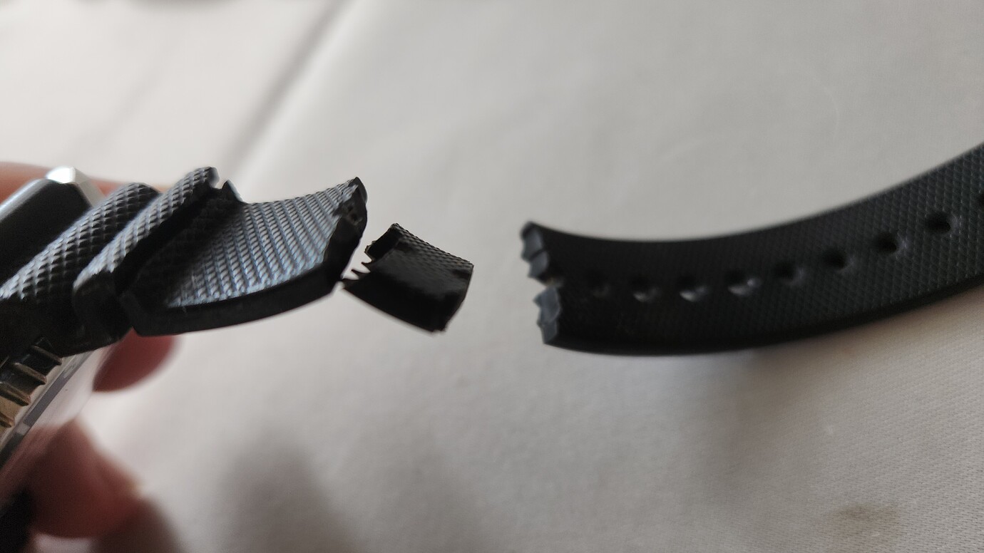Esa correa, plasticosa al inicio y que había que domar, era bastante típica de montar en los Sumo en su día como alternativa al brazalete. Pues… pásate por éste hilo. A mí, un buen día, se me deshizo como un azucarillo. Justo en el momento de sacarle ésta foto, se cae un trocito más.
